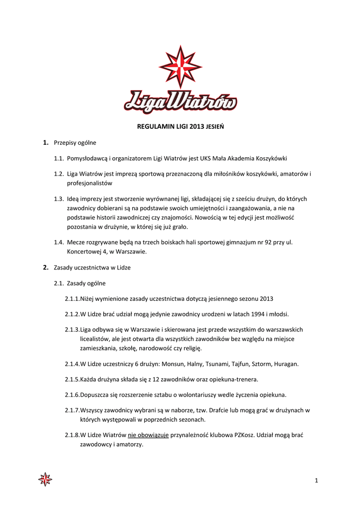 REGULAMIN LIGI 2013 JESIEŃ 1. Przepisy ogólne 1.1. Pomysłodawcą i organizatorem Ligi Wiatrów jest UKS Mała Akademia Koszykówki 1.2. Liga Wiatrów jest imprezą sportową przeznaczoną dla miłośników koszykówki, amatorów i profesjonalistów 1.3. Ideą imprezy jest stworzenie wyrównanej ligi, składającej się z sześciu drużyn, do których zawodnicy dobierani są na podstawie swoich umiejętności i zaangażowania, a nie na podstawie historii zawodniczej czy znajomości. Nowością w tej edycji jest możliwość pozostania w drużynie, w której się już grało. 1.4. Mecze rozgrywane będą na trzech boiskach hali sportowej gimnazjum nr 92 przy ul. Koncertowej 4, w Warszawie. 2. Zasady uczestnictwa w Lidze 2.1. Zasady ogólne 2.1.1.Niżej wymienione zasady uczestnictwa dotyczą jesiennego sezonu 2013 2.1.2.W Lidze brać udział mogą jedynie zawodnicy urodzeni w latach 1994 i młodsi. 2.1.3.Liga odbywa się w Warszawie i skierowana jest przede wszystkim do warszawskich licealistów, ale jest otwarta dla wszystkich zawodników bez względu na miejsce zamieszkania, szkołę, narodowość czy religię. 2.1.4.W Lidze uczestniczy 6 drużyn: Monsun, Halny, Tsunami, Tajfun, Sztorm, Huragan. 2.1.5.Każda drużyna składa się z 12 zawodników oraz opiekuna-trenera. 2.1.6.Dopuszcza się rozszerzenie sztabu o wolontariuszy wedle życzenia opiekuna. 2.1.7.Wszyscy zawodnicy wybrani są w naborze, tzw. Drafcie lub mogą grać w drużynach w których występowali w poprzednich sezonach. 2.1.8.W Lidze Wiatrów nie obowiązuje przynależność klubowa PZKosz. Udział mogą brać zawodowcy i amatorzy. 1 2.1.9.Istnieje możliwość trenowania jednocześnie w klubie zgłoszonym do rozgrywek PZKosz i w Lidze Wiatrów, z zaznaczeniem, że zawodników tych obowiązują wszystkie zasady uczestnictwa w Lidze Wiatrów 2.1.10. Udział w Lidze Wiatrów nie blokuje możliwości udziału w rozgrywkach szkolnych i klubowych, organizowanych przez WoZKosz. 2.2. Nabór do ligi – „Draft” 2.2.1.Draft odbywa się 21 września 2013r. 2.2.2.Jest to jednodniowa impreza sportowa 2.2.3.Zgłoszenia do Ligi są indywidualne i dobrowolne, bez zezwolenia od klubu bądź szkoły. 2.2.4.Zgłoszenia przyjmowane są za pomocą formularza dostępnego na stronie www.ligawiatrow.pl/nowy-sezon-jesien-2013 lub na e-mail [email protected] do dnia 19 września 2013. 2.2.5.W przypadku zawodników niepełnoletnich wymagana jest pisemna zgoda rodzica bądź opiekuna 2.2.6.Do Draftu przystępują wszyscy zawodnicy, którzy uiścili opłatę zgłoszeniową i potwierdzili swoją obecność w dniu Draftu w trakcie rejestracji. 2.2.7.Draft składa się z czterech części 2.2.7.1. Rejestracji, podczas której zawodnicy potwierdzają swoją obecność i uiszczają opłatę rejestracyjną, jeśli tego nie zrobili przelewem. Po rejestracji następuje losowanie numerów i rozdanie koszulek z unikalnym numerem, pozwalającym na przyporządkowanie ocen do zawodnika. 2.2.7.2. Rozgrzewki i zapoznania z zasadami, metodami oceniania i przebiegiem Draftu 2.2.7.3. Zasadniczej części podzielonej na dwie rundy, w trakcie której wykonywane są ćwiczenia oceniane obiektywnie przez prowadzących (czas wykonania ćwiczenia, ilość celnych rzutów itp.) i gier kontrolnych 5na5. Podczas tej części zawodnicy podzieleni są na piątki dobrane numerami (np. 1-5, 36-40). Dokładny kształt i czas trwania Draftu będzie określony po zapoznaniu się z ilością zawodników startujących w Drafcie. 2.2.7.4. Ogłoszenia wyników Draftu wieczorem tego samego dnia – obecność nieobowiązkowa 2.2.8.Sam wybór zawodników odbywa się po zakończeniu części zasadniczej (ćwiczeń i gier kontrolnych) wg następujących zasad: 2.2.8.1. Kolejność wyboru jest określana przez organizatorów, a określana jest na podstawie potencjału zawodników pozostających w swoich drużynach z 2 poprzedniej edycji. Priorytetem przy rozdzielaniu wyborów w Drafcie jest chęć utworzenia sześciu równorzędnych drużyn. 2.2.8.2. Opiekunowie podczas Draftu mają do dyspozycji wzrost i datę urodzenia zawodników, zdjęcia wykonane na drafcie, wyniki ćwiczeń i oceny swoje i swoich trenerów bądź pomocników 2.2.8.3. Organizator nie ingeruje w wybory zawodników 2.3. Zgoda na udział 2.3.1.Każdy zawodnik biorący udział w Lidze, musi dostarczyć pisemną zgodę, która uwzględnia co następuje: 2.3.1.1. Zawodnik zobowiązuje się przestrzegać Regulaminu Ligi 2.3.1.2. Nie istnieją przeciwwskazania zdrowotne, zawodnik jest zdolny do uprawiania sportu wyczynowo. 2.3.1.3. Zawodnik wyraża zgodę na przetwarzanie i wykorzystywanie jego danych osobowych oraz zdjęć wykonanych podczas trwania Ligi Wiatrów na potrzeby funkcjonowania strony www.ligawiatrow.pl oraz cele promocji działań UKS Mała Akademia Koszykówki, w tym: umieszczania jego imienia i nazwiska razem ze wszystkimi statystykami z meczów, umieszczania wywiadów i artykułów nt. jego dokonań sportowych 2.3.1.4. Zawodnik wyraża zgodę na otrzymywanie wiadomości od Organizatora drogą elektroniczną (e-mail, Facebook) i telefoniczną. 2.3.1.5. Zawodnik zezwala na udostępnienie jego danych osobowych i kontaktowych opiekunowi swojej Drużyny 2.3.2.Treść zgody dostępna jest na stronie internetowej www.ligawiatrów.pl, gotowa do wydruku. 2.3.3.Dopuszcza się zgody pisane ręcznie, pod warunkiem zawarcie wszystkich ww. punktów 2.3.4.W przypadku niepełnoletnich zawodników wymagany jest podpis rodzica/prawnego opiekuna 2.3.5.Zgoda musi być dostarczona przed rozpoczęciem Draftu. 3. System rozgrywek 3.1. Sezon zasadniczy 3.1.1.Każda drużyna rozgrywa 7 meczów – po 1 z każdą drużyną oraz 2 mecze z wylosowanymi drużynami. Jeżeli liczba zawodników zgłoszonych pozwoli stworzyć mniejsze niż dwusnastoosobowe drużyny każda drużyna gra wówczas 6 meczów, czyli 1 z wylosowaną drużyną. 3 3.1.2.Mecze odbywają się wg ustalonego przez Organizatorów terminarza w soboty w godz. 12:00-15:0