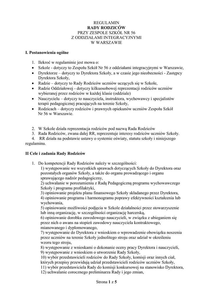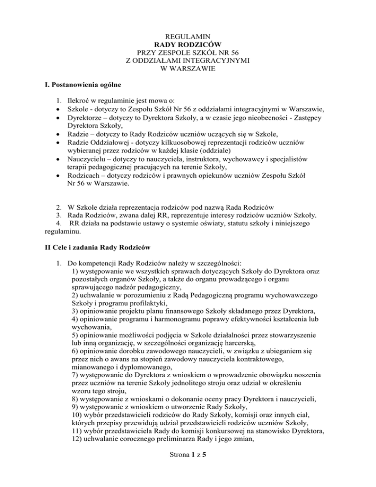 REGULAMIN RADY RODZICÓW PRZY ZESPOLE SZKÓŁ NR 56 Z ODDZIAŁAMI INTEGRACYJNYMI W WARSZAWIE I. Postanowienia ogólne 1. Ilekroć w regulaminie jest mowa o: Szkole - dotyczy to Zespołu Szkół Nr 56 z oddziałami integracyjnymi w Warszawie, Dyrektorze – dotyczy to Dyrektora Szkoły, a w czasie jego nieobecności - Zastępcy Dyrektora Szkoły, Radzie – dotyczy to Rady Rodziców uczniów uczących się w Szkole, Radzie Oddziałowej - dotyczy kilkuosobowej reprezentacji rodziców uczniów wybieranej przez rodziców w każdej klasie (oddziale) Nauczycielu – dotyczy to nauczyciela, instruktora, wychowawcy i specjalistów terapii pedagogicznej pracujących na terenie Szkoły, Rodzicach – dotyczy rodziców i prawnych opiekunów uczniów Zespołu Szkół Nr 56 w Warszawie. 2. W Szkole działa reprezentacja rodziców pod nazwą Rada Rodziców 3. Rada Rodziców, zwana dalej RR, reprezentuje interesy rodziców uczniów Szkoły. 4. RR działa na podstawie ustawy o systemie oświaty, statutu szkoły i niniejszego regulaminu. II Cele i zadania Rady Rodziców 1. Do kompetencji Rady Rodziców należy w szczególności: 1) występowanie we wszystkich sprawach dotyczących Szkoły do Dyrektora oraz pozostałych organów Szkoły, a także do organu prowadzącego i organu sprawującego nadzór pedagogiczny, 2) uchwalanie w porozumieniu z Radą Pedagogiczną programu wychowawczego Szkoły i programu profilaktyki, 3) opiniowanie projektu planu finansowego Szkoły składanego przez Dyrektora, 4) opiniowanie programu i harmonogramu poprawy efektywności kształcenia lub wychowania, 5) opiniowanie możliwości podjęcia w Szkole działalności przez stowarzyszenie lub inną organizację, w szczególności organizację harcerską, 6) opiniowanie dorobku zawodowego nauczycieli, w związku z ubieganiem się przez nich o awans na stopień zawodowy nauczyciela kontraktowego, mianowanego i dyplomowanego, 7) występowanie do Dyrektora z wnioskiem o wprowadzenie obowiązku noszenia przez uczniów na terenie Szkoły jednolitego stroju oraz udział w określeniu wzoru tego stroju, 8) występowanie z wnioskami o dokonanie oceny pracy Dyrektora i nauczycieli, 9) występowanie z wnioskiem o utworzenie Rady Szkoły, 10) wybór przedstawicieli rodziców do Rady Szkoły, komisji oraz innych ciał, których przepisy przewidują udział przedstawicieli rodziców uczniów Szkoły, 11) wybór przedstawiciela Rady do komisji konkursowej na stanowisko Dyrektora, 12) uchwalanie corocznego preliminarza Rady i jego zmian, Strona 1 z 5 13) zatwierdzanie rocznego sprawozdania finansowego Rady po zbadaniu sprawozdania przez Komisję Rewizyjną i przedstawieniu przez nią opinii w tej sprawie, 14) uchwalanie propozycji wysokości składek rodziców uczniów Szkoły. 2. W skład RR wchodzi po jednym przedstawicielu rad oddziałowych, wybranych w tajnych wyborach przez zebranie rodziców uczniów danej klasy (oddziału) 3. Kadencja RR trwa jeden rok szkolny. 4. W uzasadnionych przypadkach, jeśli w czasie kadencji, ze składu RR ubędzie więcej niż 1/3 członków, dopuszcza się zorganizowanie wyborów uzupełniających do RR. 5. RR podejmuje decyzję o przeprowadzeniu wyborów uzupełniających w głosowaniu jawnym. 6. Wybory uzupełniające przeprowadza się zgodnie z procedurą właściwą dla normalnych wyborów członków RR. II. Wybory do RR 1. Wybory do RR przeprowadza się corocznie, we wrześniu, na pierwszym zebraniu rodziców w każdej klasie (oddziale). 2. Rodzice w każdej klasie (oddziale) wybierają spośród siebie przedstawicieli do Rady Oddziałowej, a spośród niej - jednego przedstawiciela, który będzie członkiem RR. 3. Do udziału w wyborach uprawnieni są jedynie Rodzice dzieci danej klasy (oddziału). Jedno dziecko może reprezentować w wyborach tylko jeden rodzic. 4. Wybory przeprowadza komisja skrutacyjna, wybrana w głosowaniu jawnym spośród uczestników zebrania. W skład komisji nie mogą wchodzić osoby kandydujące do RR. 5. W przypadku uzyskania przez kandydatów równej liczby głosów – głosowanie należy powtórzyć, aż do skutku. 6. Pierwsze Zebranie RR powinno się odbyć nie później niż 30 dni od terminu wyborów. 5. Zwołanie pierwszego Zebrania RR należy do obowiązków Dyrektora Szkoły. 6. Na pierwsze Zebranie Rady zaproszeni są także członkowie Rady ustępującej. 7. Na pierwszym Zebraniu nowej RR następuje przekazanie dokumentów i pełnomocnictw przez ustępującą RR. III. Organy RR 1. Organami RR są: - Zebranie RR; - Prezydium RR; - Przewodniczący RR; - Komisja Rewizyjna. 2. Na zebraniu RR wybiera ze swego grona: - Przewodniczącego; - Zastępcę Przewodniczącego; - Sekretarza; - Skarbnika; - Komisję Rewizyjną (3 osoby). 3. Wybory odbywają się w głosowaniu tajnym zwykłą większością głosów Rodziców uczestniczących w Zebraniu RR 4. Prezydium Rady może tworzyć stałe lub doraźne komisje zadaniowe spośród innych Rodziców - dla wykonania określonych zadań Strona 2 z 5 IV. Kompetencje i zasady działania RR 1. Osoby wchodzące w skład RR wykonują swoją w niej pracę społecznie. 2. Członkowie RR mają prawo: - dostępu do wszystkich informacji i dokumentów związanych z organizacją i przebiegiem procesu dydaktyczno – wychowawczo – opiekuńczego, poza informacjami i dokumentami uznanymi za poufne lub dotyczącymi spraw personalnych; - wypowiadania swoich opinii we wszystkich sprawach szkoły; - głosowania na równych prawach przy podejmowaniu wszystkich decyzji przez RR. 3. Członkowie RR mają obowiązek aktywnego uczestniczenia w posiedzeniach RR. 4. Przewodniczący organizuje prace RR, zwołuje i prowadzi posiedzenia RR, reprezentuje RR na zewnątrz, podpisuje dokumenty zatwierdzone przez Radę, w imieniu RR. 5. Zastępca Przewodniczącego przejmuje obowiązki Przewodniczącego w czasie jego nieobecności. Zakres zadań Zastępcy ustala Przewodniczący. 6. Zadaniem Sekretarza jest zapewnienie właściwej organizacji pracy RR, a w szczeg