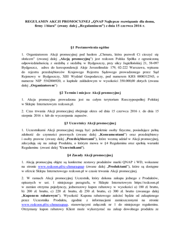 REGULAMIN AKCJI PROMOCYJNEJ „QNAP Najlepsze rozwiązanie dla domu, firmy i biura” (zwany dalej „Regulaminem”) z dnia 15 czerwca 2016 r. §1 Postanowienia ogólne 1. Organizatorem Akcji promocyjnej pod hasłem „Chmura, która pozwoli Ci cieszyć się słońcem” (zwanej dalej „Akcją promocyjną”) jest redcoon Polska Spółka z ograniczoną odpowiedzialnością z siedzibą z siedzibą w Bydgoszczy, przy ulicy Jagiellońskiej 21, 58-097 Bydgoszcz, adres do korespondencji: Aleje Jerozolimskie 179, 02-222 Warszawa, wpisana do rejestru przedsiębiorców Krajowego Rejestru Sądowego prowadzonego przez Sąd Rejonowy w Bydgoszczy, XIII Wydział Gospodarczy, pod numerem KRS 0000312543, o numerze NIP 5542806920, o kapitale zakładowym w wysokości 350.000,00 złotych (zwana dalej „Organizatorem”) §2 Termin i miejsce Akcji promocyjnej 1. Akcja promocyjna prowadzona jest na całym terytorium Rzeczypospolitej Polskiej w Sklepie Internetowym redcoon.pl. 2. Czas trwania Akcji promocyjnej obejmuje okres od dnia 15 czerwca 2016 r. do dnia 15 sierpnia 2016 r. lub do wyczerpania zapasów. §3 Uczestnicy Akcji promocyjnej 1. Uczestnikami Akcji promocyjnej mogą być: pełnoletnie osoby fizyczne, posiadające pełną zdolność do czynności prawnych (zwane dalej „Konsumentami”) oraz przedsiębiorcy i osoby prawne (zwany dalej „Przedsiębiorcami”), które wezmą udział w Akcji promocyjnej, zdecydują się na zakup Produktu, o którym mowa w §4 Regulaminu oraz spełnią warunki Regulaminu (zwani dalej "Uczestnikami"). §4 Zasady Akcji promocyjnej 1. Akcją promocyjną objęte są konkretne zestawy produktów marki QNAP i WD, wskazane na stronie www.redcoon.pl/rc-chmuraqnap (zwane dalej „Produktami”), które są dostępne w ofercie Sklepu Internetowego redcoon.pl w czasie trwania Akcji promocyjnej. 2. W ramach Akcji promocyjnej Uczestnik, który dokona zakupu jednego z Produktów, opisanych w ust. 1 niniejszego paragrafu, w Sklepie Internetowym https://redcoon.pl w zamian otrzyma pojedynczy, jednorazowy kupon rabatowy w wysokości a) 180 zł. brutto, b) 200 zł. brutto, c) 220 zł. brutto, d) 250 zł. brutto, e) 300 zł. brutto (zwanego dalej „Kuponem rabatowym”). Wysokość Kuponu rabatowego zależeć będzie od zakupionego przez Uczestnika Produktu, zgodnie z informacjami zamieszczonymi na stronie www.redcoon.pl/rc-chmuraqnap, stanowiącymi załącznik nr 1 do niniejszego regulaminu. Otrzymany kupon rabatowy Klient może wykorzystać na zakup dowolnego produktu ze strony http://www.redcoon.pl, z zastrzeżeniem, iż kwota minimalna zakupu musi wynosić 500 zł brutto. 3. Wszystkie warunki korzystania z Kuponów rabatowych zostały uregulowane w Regulamin korzystania z kuponów rabatowych, który jest dostępny na stronie serwisu Sklepu internetowego redoon.pl, pod adresem: http://www.redcoon.pl/rcregulaminkodowrabatowych20151001 4. Warunkiem uzyskania przez Uczestnika Kuponu rabatowego jest przesłanie wiadomości e – mail, w terminie po upływie 30 dni od otrzymania zamówionego Produktu lecz nie później niż 45 dni od otrzymania zamówionego Produktu, na adres mailowy: https://[email protected], w temacie Chmura, która pozwoli Ci cieszyć się słońcem, w której zawrze numer zamówienia oraz skieruje prośbę o udzielenie Kuponu rabatowego lub dokona niniejszego zgłoszenia w ww. terminie poprzez infolinię, pod numerem: (22) 888 43 21. 5. Otrzymany przez Uczestnika Kupon rabatowy, o którym mowa w ust. 1 niniejszego paragrafu, będzie ważny do dnia 30 września 2016 r. 6. Każdy Uczestnik (zarówno Konsument jak i Przedsiębiorca), podczas trwania Akcji promocyjnej, jest uprawniony do otrzymania wyłącznie jednego Kuponu rabatowego, niezależnie od ilości zakupionych produktów, tj. zakup większej ilości Produktów nie uprawnia do otrzymania kolejnych Kuponów rabatowych. 7. Akcja promocyjna nie może być łączona z innymi akcjami promocyjnymi, rabatami oraz obniżkami cen. §5 Naruszenie postanowień Regulaminu 1. Organizator ma prawo wykluczyć Uczestnika z dalszego udziału w Akcji promocyjnej w poniższych przypadkach: a) naruszenie postanowień Regulaminu przez Uczestnika w szczególności: - podanie nieprawdziwych lub błędnych danych osobowych - podawania się osoby trzeciej za Uczestnika za namową Uczestnika, - naruszenia obowiązujących przepisów prawa b) podejrzenia, że dany Uczestnik w sposób nieuprawniony ingeruje w przebieg Akcji promocyjnej lub postępuje w sposób niezgodny z zasadami współżycia społecznego, uporczywie odmawia poddania się wskazówkom i instrukcją Organizatora. §6 Reklamacje i wymiana towarów 1. Reklamacje Uczestników dotyczące sposobu przeprowadzenia Akcji promocyjnej powinny być zgłaszane w trakcie trwania Akcji promocyjnej oraz przez 21 (dwadzieścia jeden) dni od jej zakończenia pisemnie na adres: Aleje Jerozolimskie 179, 02-222 Warszawa, poprzez wiadomość email skierowaną na adres: https://[email protected] z tematem wiadomości "Reklamacja – Chmura, która pozwoli Ci cieszyć się słońcem, lub pod numerem Infolinii : (22) 888 43 21* (* opłata zgodnie z taryfą operatora). 2. Reklamacje składane w formie pisemnej na adres wskazany w ust. 1 niniejszego paragrafu, powinny zawierać dopisek „Chmura, która pozwoli Ci cieszyć się słońcem” oraz imię i nazwisko Uczestnika, Jego adres zamieszkania, kopię dowodu zakupu i dokładny opis stanu faktycznego będącego przyczyną złożenia reklamacji. 3. Postępowanie reklamacyjne, o którym mowa w §6 ust. 1 i 2 Regulaminu, trwa 14 (czternaście) dni od daty wpłynięcia reklamacji. Uczestnik zostanie powiadomiony o rozpatrzeniu reklamacji przez Organizatora listem poleconym wysłanym na adres wskazany przez Uczestnika, telefonicznie lub za pośrednictwem drogi elektronicznej w zależności od formy, w jakiej Uczestnik złożył reklamację. Po wyczerpaniu postępowania reklamacyjnego Uczestnik jest uprawniony do dochodzenia swoich roszczeń 