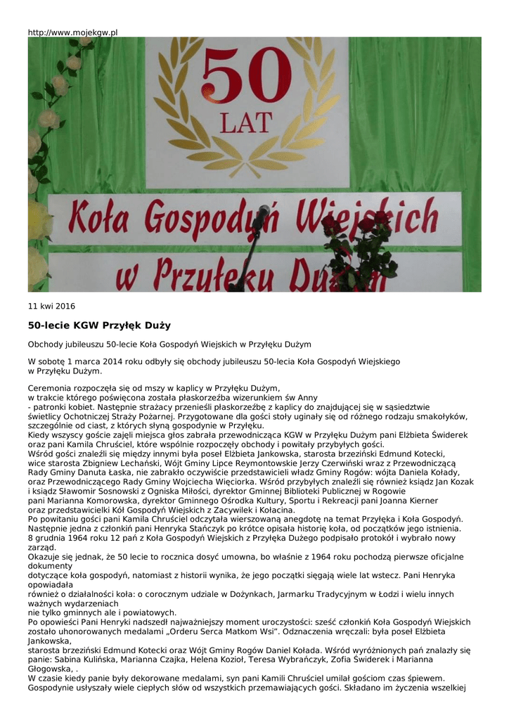http://www.mojekgw.pl 11 kwi 2016 50-lecie KGW Przyłęk Duży Obchody jubileuszu 50-lecie Koła Gospodyń Wiejskich w Przyłęku Dużym W sobotę 1 marca 2014 roku odbyły się obchody jubileuszu 50-lecia Koła Gospodyń Wiejskiego w Przyłęku Dużym. Ceremonia rozpoczęła się od mszy w kaplicy w Przyłęku Dużym, w trakcie którego poświęcona została płaskorzeźba wizerunkiem św Anny - patronki kobiet. Następnie strażacy przenieśli płaskorzeźbę z kaplicy do znajdującej się w sąsiedztwie świetlicy Ochotniczej Straży Pożarnej. Przygotowane dla gości stoły uginały się od różnego rodzaju smakołyków, szczególnie od ciast, z których słyną gospodynie w Przyłęku. Kiedy wszyscy goście zajęli miejsca głos zabrała przewodnicząca KGW w Przyłęku Dużym pani Elżbieta Świderek oraz pani Kamila Chruściel, które wspólnie rozpoczęły obchody i powitały przybyłych gości. Wśród gości znaleźli się między innymi była poseł Elżbieta Jankowska, starosta brzeziński Edmund Kotecki, wice starosta Zbigniew Lechański, Wójt Gminy Lipce Reymontowskie Jerzy Czerwiński wraz z Przewodniczącą Rady Gminy Danuta Łaska, nie zabrakło oczywiście przedstawicieli władz Gminy Rogów: wójta Daniela Kołady, oraz Przewodniczącego Rady Gminy Wojciecha Więciorka. Wśród przybyłych znaleźli się również ksiądz Jan Kozak i ksiądz Sławomir Sosnowski z Ogniska Miłości, dyrektor Gminnej Biblioteki Publicznej w Rogowie pani Marianna Komorowska, dyrektor Gminnego Ośrodka Kultury, Sportu i Rekreacji pani Joanna Kierner oraz przedstawicielki Kół Gospodyń Wiejskich z Zacywilek i Kołacina. Po powitaniu gości pani Kamila Chruściel odczytała wierszowaną anegdotę na temat Przyłęka i Koła Gospodyń. Następnie jedna z członkiń pani Henryka Stańczyk po krótce opisała historię koła, od początków jego istnienia. 8 grudnia 1964 roku 12 pań z Koła Gospodyń Wiejskich z Przyłęka Dużego podpisało protokół i wybrało nowy zarząd. Okazuje się jednak, że 50 lecie to rocznica dosyć umowna, bo właśnie z 1964 roku pochodzą pierwsze oficjalne dokumenty dotyczące koła gospodyń, natomiast z historii wynika, że jego początki sięgają wiele lat wstecz. Pani Henryka opowiadała również o działalności koła: o corocznym udziale w Dożynkach, Jarmarku Tradycyjnym w Łodzi i wielu innych ważnych wydarzeniach nie tylko gminnych ale i powiatowych. Po opowieści Pani Henryki nadszedł najważniejszy moment uroczystości: sześć członkiń Koła Gospodyń Wiejskich zostało uhonorowanych medalami „Orderu Serca Matkom Wsi”. Odznaczenia wręczali: była poseł Elżbieta Jankowska, starosta brzeziński Edmund Kotecki oraz Wójt Gminy Rogów Daniel Kołada. Wśród wyróżnionych pań znalazły się panie: Sabina Kulińska, Marianna Czajka, Helena Kozioł, Teresa Wybrańczyk, Zofia Świderek i Marianna Głogowska, . W czasie kiedy panie były dekorowane medalami, syn pani Kamili Chruściel umilał gościom czas śpiewem. Gospodynie usłyszały wiele ciepłych słów od wszystkich przemawiających gości. Składano im życzenia wszelkiej pomyślności i dalszej, równie owocnej działalności na rzecz Przyłęka i całej Gminy Rogów, a ponadto koło wzbogaciło się o parę praktycznych upominków, które panie z pewnością wykorzystają głównie w czasie zajęć kulinarnych. Po wszystkich oficjalnościach atmosfera, choć od początku bardzo miła, rozluźniła się bardziej. Podano ciepły posiłek, a orkiestra zaczęła umilać gościom czas grą. Po obiedzie podano pięknie przygotowany tort. Cała uroczystość przebiegła w bardzo miłej i ciepłej atmosferze, a goście doskonale się bawili jeszcze długie godziny po zakończeniu części oficjalnej przy suto zastawionym stole i tańcach. Iwona S. z Koło Gospodyń Wiejskich w Przyłęku Dużym