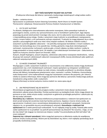 GDY TWÓJ NASTĘPNY PACJENT MA AUTYZM (Praktyczne informacje dla lekarzy i personelu medycznego świadczących usługi wobec osób z autyzmem) Stopka – ostatnia strona Opracowane na podstawie Autism Steering Committee, North Shore-LIJ Health System Tłumaczenie i adaptacja: Stowarzyszenie Pomocy Osobom Autystycznym w Gdańsku 1. CO TO JEST AUTYZM? To złożone, biologicznie uwarunkowane zaburzenie rozwojowe, które powoduje trudności w postrzeganiu świata, uczeniu się i porozumiewaniu oraz w kontaktach społecznych. Jego objawy pojawiają się przed ukończeniem trzeciego roku życia. Jest to zaburzenie neurorozwojowe, związane z nieprawidłową pracą mózgu. Osoby z autyzmem mają trudności w prawidłowym nawiązywaniu relacji z innymi ludźmi, a ich zachowanie cechuje sztywność. Trudności te mogą objawiać się w różny sposób u poszczególnych osób oraz mieć różny stopień nasilenia. W efekcie niektóre osoby z autyzmem są bardzo głęboko zaburzone – nie potrafią nawiązywać kontaktów z innymi osobami, nie mówią i nie komunikują się w inny sposób (np. mimiką, gestami), mają dużo stereotypowych zachowań, manieryzmów ruchowych, podczas gdy u innych objawy są słabo nasilone i osoby te mogą prowadzić w miarę zwykłe życie. W związku z tym właściwszym terminem jest – Zaburzenia ze Spektrum Autyzmu (Autism Spectrum Disorder, ASD). Autyzm, Zespół Aspergera, autyzm atypowy, całościowe zaburzenia rozwojowe nieokreślone, należą do grupy tak zwanych całościowych zaburzeń rozwojowych (CZR), inaczej określanych jako spektrum zaburzeń autystycznych (ASD). 2. CO MOŻE STANOWIĆ TRUDNOŚĆ? Występujące u osób z autyzmem trudności w rozumowaniu oraz odbieraniu świata mogą skutkować pojawieniem się u nich niewłaściwych zachowań. Często spotykane są nietypowe i problemowe zachowania takie jak: skrajne reakcje na małe zmiany, niezwykła wrażliwość na określone dźwięki, obrazy lub faktury, kompulsywne powtarzanie rutyn, czynności i ruchów. Problemy z komunikacją, mała elastyczność i silna nadwrażliwość mogą być wyzwaniem zarówno dla pacjenta, jak i lekarza. Ulotka ta zawiera informacje, które mogą być pomocne dla lekarzy i personelu medycznego podczas świadczenia usług wobec osób z autyzmem. Więcej informacji na temat autyzmu można znaleźć na: www.spoa.org.pl 3. JAK PRZYGOTOWAĆ SIĘ DO WIZYTY? Wcześniejsze przygotowanie się do przyjęcia osoby z autyzmem może okazać się kluczowym elementem udanej wizyty lekarskiej. Poniżej wymienione są niezbędne kroki, które mogą okazać się pomocne w tym, ażeby wizyta osoby z autyzmem w gabinecie przebiegła pomyślnie i zakończyła się dla tej osoby sukcesem. Skontaktuj się z rodzicem. Rozmowa telefoniczna przeprowadzona z rodzicem lub opiekunem na dzień przed wizytą lub wcześniej może być bardzo pomocna. Zapytaj o mocne strony osoby, jej ograniczenia i trudności oraz o wcześniejsze doświadczenia w podobnych sytuacjach. Koniecznie zapytaj o to, co sprawdziło się przy wcześniejszych wizytach. Konsultacja z rodzicami lub opiekunami da Ci wiele pomocnych wskazówek. To oni najlepiej znają tę osobę. Pytania jakie warto zadać opiekunom to na przykład: Czy potrafi porozumiewać się słowami? Ile rozumie, z tego, co się do niej mówi? Jak reaguje na nieznane jej miejsca i osoby? Czy przeszkadza jej tłok lub hałas? Jak znosi czekanie? Zapoznaj się z różnymi sposobami, które mogą być pomocne w skłonieniu osoby do współpracy podczas wizyty (czytaj poniżej). Ważne jest by dowiedzieć się, które z nich najlepiej sprawdzają się w przypadku konkretnej osoby. 1 Zaplanuj wizytę na podstawie uzyskanych informacji i wskazówek o tej osobie uwzględniając jej mocne strony i trudności. Sporządź plan wizyty i określ jak ma się zachowywać personel medyczny. Zdecyduj, gdzie pacjent będzie czekał i w jaki sposób czas oczekiwania może zostać zminimalizowany lub całkowicie wyeliminowany; jakie badania lub zabiegi zostaną wykonane i kto je przeprowadzi. Zaplanuj również, jakich sposobów będziesz chciał użyć by zachęcić osobę do współpracy podczas wizyty (czytaj poniżej). 4. JAK POSTĘPOWAĆ W TRAKCIE. Kreatywność i poczucie humoru mogą okazać się najważniejsze!!! Poniżej opisane są praktyczne sposoby na udaną wizytę lekarską osoby z zaburzeniami ze spektrum autyzmu: Modelowanie To prosta metoda, która polega na pokazaniu osobie, co i jak ma zrobić. Możesz użyć innej osoby lub lalki jako pacjenta oraz jakiegoś przedmiotu jako sprzętu medycznego w celu pokazania jak będzie wyglądało badanie lub zabieg. Np. długopis może zastępować strzykawkę, a szczepienie może być przedstawione za pomocą długopisu i lalki. Wtedy osoba może „zaszczepić” lalkę, a lekarz zaaplikować prawdziwą szczepionkę pacjentowi. Pacjent może też naśladować to, co robi inna osoba, np. ktoś z zespołu medycznego, rodzic lub sam badający. Nagrody Nagradzaj osobę za wykonanie prośby lub polecenia. Nie zakładaj, że wiesz, co może być dla tej osoby nagrodą. Osoby z autyzmem i pokrewnymi zaburzeniami mogą uważać za denerwujące to, co inne osoby uważają za atrakcyjne. Zapytaj rodzica lub opiekuna, co lubi dany pacjent. Tą nagrodą może być zwykła pochwała, ale jeśli lepszą nagrodą dla tej osoby jest jakieś jedzenie, to nie zapomnij poprosić rodziców/opiekunów, ażeby przynieśli je na spotkanie (Jest mało prawdopodobne, że będziesz miał konkretną przekąskę, którą ta osoba lubi). Nagradzaj każde zachowanie, którego oczekujesz i te, które są zbliżone do oczekiwanego. Nie zwracaj uwagi zachowania, które utrudniają osiągniecie celu. Wybór Jeśli to możliwe, zaproponuj wybór, np. „Czy chcesz, żebym najpierw zajrzał do twojego prawego czy lewego ucha?” Odwrócenie uwagi Pytania: Zadawaj pytania dotyczące najbliższego otoczenia tej osoby (np. o członków rodziny lub o p
