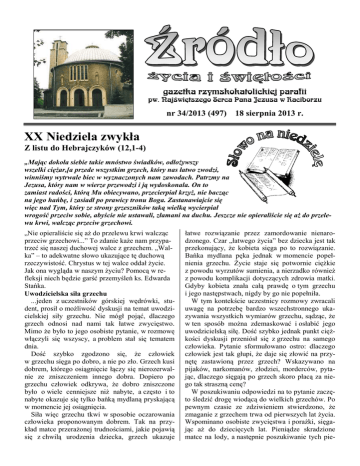 gazetka rzymskokatolickiej parafii pw. Najświętszego Serca Pana Jezusa w Raciborzu nr 34/2013 (497) 18 sierpnia 2013 r. XX Niedziela zwykła Z listu do Hebrajczyków (12,1-4) „Mając dokoła siebie takie mnóstwo świadków, odłoŜywszy wszelki cięŜar,[a przede wszystkim grzech, który nas łatwo zwodzi, winniśmy wytrwale biec w wyznaczonych nam zawodach. Patrzmy na Jezusa, który nam w wierze przewodzi i ją wydoskonala. On to zamiast radości, którą Mu obiecywano, przecierpiał krzyŜ, nie bacząc na jego hańbę, i zasiadł po prawicy tronu Boga. Zastanawiajcie się więc nad Tym, który ze strony grzeszników taką wielką wycierpiał wrogość przeciw sobie, abyście nie ustawali, złamani na duchu. Jeszcze nie opieraliście się aŜ do przelewu krwi, walcząc przeciw grzechowi. „Nie opieraliście się aŜ do przelewu krwi walcząc przeciw grzechowi...” To zdanie kaŜe nam przypatrzeć się naszej duchowej walce z grzechem. „Walka” – to adekwatne słowo ukazujące tę duchową rzeczywistość. Chrystus w tej walce oddał Ŝycie. Jak ona wygląda w naszym Ŝyciu? Pomocą w refleksji niech będzie garść przemyśleń ks. Edwarda Stańka. Uwodzicielska siła grzechu ...jeden z uczestników górskiej wędrówki, student, prosił o moŜliwość dyskusji na temat uwodzicielskiej siły grzechu. Nie mógł pojąć, dlaczego grzech odnosi nad nami tak łatwe zwycięstwo. Mimo Ŝe było to jego osobiste pytanie, w rozmowę włączyli się wszyscy, a problem stał się tematem dnia. Dość szybko zgodzono się, Ŝe człowiek w grzechu sięga po dobro, a nie po zło. Grzech kusi dobrem, którego osiągnięcie łączy się nierozerwalnie ze zniszczeniem innego dobra. Dopiero po grzechu człowiek odkrywa, Ŝe dobro zniszczone było o wiele cenniejsze niŜ nabyte, a często i to nabyte okazuje się tylko bańką mydlaną pryskającą w momencie jej osiągnięcia. Siła więc grzechu tkwi w sposobie oczarowania człowieka proponowanym dobrem. Tak na przykład matce przeraŜonej trudnościami, jakie pojawią się z chwilą urodzenia dziecka, grzech ukazuje łatwe rozwiązanie przez zamordowanie nienarodzonego. Czar „łatwego Ŝycia” bez dziecka jest tak przekonujący, Ŝe kobieta sięga po to rozwiązanie. Bańka mydlana pęka jednak w momencie popełnienia grzechu. śycie staje się potwornie cięŜkie z powodu wyrzutów sumienia, a nierzadko równieŜ z powodu komplikacji dotyczących zdrowia matki. Gdyby kobieta znała całą prawdę o tym grzechu i jego następstwach, nigdy by go nie popełniła. W tym kontekście uczestnicy rozmowy zwracali uwagę na potrzebę bardzo wszechstronnego ukazywania wszystkich wymiarów grzechu, sądząc, Ŝe w ten sposób moŜna zdemaskować i osłabić jego uwodzicielską siłę. Dość szybko jednak punkt cięŜkości dyskusji przeniósł się z grzechu na samego człowieka. Pytanie sformułowano ostro: dlaczego człowiek jest tak głupi, Ŝe daje się złowić na przynętę zastawioną przez grzech? Wskazywano na pijaków, narkomanów, złodziei, morderców, pytając, dlaczego sięgają po grzech skoro płacą za niego tak straszną cenę? W poszukiwaniu odpowiedzi na to pytanie zaczęto śledzić drogę wiodącą do wielkich grzechów. Po pewnym czasie ze zdziwieniem stwierdzono, Ŝe zmaganie z grzechem trwa od pierwszych lat Ŝycia. Wspominano osobiste zwycięstwa i poraŜki, sięgając aŜ do dziecięcych lat. Pieniądze skradzione matce na lody, a następnie poszukiwanie tych pie- 2 niędzy drogą uczciwą, by móc je zwrócić do portmonetki i w ten sposób uciszyć wyrzuty sumienia. Bolesne zmagania siedmioletniego Wojtka, który musiał zrezygnować z oglądania kolumny wojsk pancernych przejeŜdŜających przez wioskę tylko dlatego, Ŝe rodzice kazali mu w tym czasie pilnować młodszą siostrę. Trud przyznania się do zniszczenia magnetofonu, co moŜna było z łatwością zrzucić na poprzedniego uŜytkownika. Z lat młodzieńczych zdecydowane odmówienie trzeciego kieliszka alkoholu, mimo natarczywych nalegań całego towarzystwa. Zwrócenie duŜej sumy pieniędzy znalezionych na ulicy. Obrona skrzywdzonego kolegi itp. Zmaganie z grzechem trwa przez całe Ŝycie. Zaczyna się od rzeczy drobnych juŜ w dziecięcych latach. Ten, kto wygrywa walkę po walce, nabywa Źródło - gazetka stopniowo mądrości i grzech tak łatwo go nie zwiedzie. Kto zaś lekcewaŜy przeciwnika i pozwoli mu odnosić zwycięstwa w rzeczach drobnych, przegra równieŜ bitwę o wielkie wartości. Trafne było podsumowanie tej długiej rozmowy dokonane przez maturzystę. Jego zdaniem kaŜdy cięŜki grzech zanim zaistnieje, ma juŜ długą historię. Jego zwycięstwo jest przygotowywane całymi latami. MoŜna powiedzieć, Ŝe grzech o wiele dłuŜej i dokładniej przygotowuje się do odniesienia zwycięstwa, niŜ sam człowiek do starcia z grzechem i w tym tkwi tajemnica jego uwodzicielskiej siły. IleŜ zatem mądrości jest zawartej w wezwaniu autora Listu do Hebrajczyków, aby uczniowie Chrystusa „opierali się aŜ do krwi, walcząc przeciw grzechowi”. Z grzechem moŜe wygrać tylko ten, kto chce z nim walczyć. ks. ES Poniedziałek – 19 sierpnia 2013 Mt 19,16-22 630 W intencji Patrycji z okazji urodzin o BoŜe błogosławieństwo i światło Ducha Świętego 900 W kościele na Ostrogu Msza Święta na rozpoczęcie Pieszej Pielgrzymki na Jasną Górę 1730 Duchowe pielgrzymowanie - RóŜaniec 1800 Do BoŜej Opatrzności z okazji rocznicy ślubu Rafała i Anny z podziękowaniem za otrzymane łaski, z prośbą o BoŜe błogosławieństwo i zdrowie oraz do Anioła StróŜa za syna Dawida 2100 Duchowe pielgrzymowanie – Apel Jasnogórski Wtorek – 20 sierpnia 2013 – św. Bernarda, opata Mt 19,23-30 630 Za † mamę Marię śebrowską w 8. rocznicę śmierci 1730 Duchowe pielgrzymowanie - RóŜaniec 1800 Za †† Henryka i Waldemara Kraś, teściów Pieprzkowskich, wujków Lejów oraz za dusze w czyśćcu cierpiące Duchowe pielgrzymowanie – A