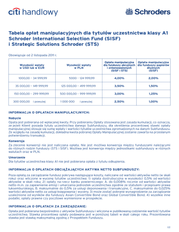 Tabela opłat manipulacyjnych dla tytułów uczestnictwa klasy A1 Schroder International Selection Fund (SISF) i Strategic Solutions Schroder (STS) Obowiązuje od 2 listopada 2011 r. Wysokość wpłaty w USD lub w EUR 1000,00 – 34 999,99 Wysokość wpłaty w PLN 5000 – 124 999,99 Opłata manipulacyjna Opłata manipulacyjna dla funduszy akcyjnych dla funduszy papierów i zrównoważonych dłużnych (SISF i STS) (SISF) 4,00% 2,00% 35 000,00 – 149 999,99 125 000,00 – 499 999,99 3,50% 1,50% 150 000,00 – 299 999,99 500 000,00 – 999 999,99 3,00% 1,25% 300 000,00 – i powyżej 1 000 000 2,50% 1,00% i powyżej Informacja o opłatach manipulacyjnych: Nabycie Opata jest pobierana od wpłacanej kwoty. Przy pobieraniu Opłaty stosowana jest zasada kumulacji, co oznacza, ze jeżeli Klient posiada tytuły uczestnictwa danego Subfunduszu, dla określenia procentowej stawki opłaty manipulacyjnej stosuje się sumę wpłaty i wartości tytułów uczestnictwa zgromadzonych na danym Subfunduszu. Ze względu na zasadę kumulacji, dokładna kwota pobranej Opłaty Manipulacyjnej zostanie zawarta na przesłanym potwierdzeniu transakcji. Konwersja Za zlecenie konwersji nie jest naliczana opłata. Nie jest możliwa konwersja między funduszami należącymi do różnych rodzin funduszy (STS i SISF). Możliwa jest konwersja między jednostkami subfunduszy w różnych walutach oraz w PLN. Umorzenie Dla tytułów uczestnictwa klasy A1 nie jest pobierana opłata z tytułu odkupienia. INFORMACJA O OPŁATACH OBCIĄŻAJĄCYCH AKTYWA NETTO SUBFUNDUSZY: Poza opłatą za zarządzanie fundusz pokrywa następujące koszty, naliczane od wartości aktywów netto (w skali roku) oraz wliczone w wycenę tytułów uczestnictwa: 1) opłata dystrybucyjna w wysokości 0,5% od wartości aktywów w skali roku; 2) opłaty na rzecz banku powierniczego: A. do 0,008% rocznie od wartości aktywów netto m.in. za zapewnienie emisji i umarzania jednostek uczestnictwa zgodnie ze statutem i przepisami prawa luksemburskiego, B. maksymalnie do 0,5% za usługi deponowania i transakcyjne, C. maksymalnie do 0,025% wartości aktywów netto za usługi księgowania i wyceny. 3) może zostać pobrane wynagrodzenie za zarządzanie uzależnione od wyników dla funduszy Asian Convertible Bond oraz Global Convertible Bond. 4) wszelkie inne podatki, opłaty prawne czy pocztowe wymienione w prospekcie. Informacja o opłatach Za Zarządzanie: Opłata jest pobierana bezpośrednio z aktywów Subfunduszu i wliczona w publikowaną codziennie wartość tytułów uczestnictwa. Stawka procentowa opłaty podawana jest w poniższej tabeli w skali całego roku. Prezentowana stawka jest stawką maksymalną zgodną z Prospektem Funduszu. 1/2 Klasa aktywów Nazwa funduszu Schroder ISF BRIC (Brazil, Russia, India, China) Schroder ISF EURO Equity Schroder ISF Greater China Schroder ISF Latin American Schroder ISF Middle East Fundusze akcyjne Schroder ISF Asian Opportunities Schroder ISF US Small & Mid-Cap Equity Schroder ISF Emerging Markets Schroder ISF Asia Pacific Property Securities Schroder ISF Global Energy Schroder ISF Global Emerging Market Opportunities Fundusze STS Global Diversified Growth mieszane Schroder ISF Asian Convertible Bond Schroder ISF Emerging Europe Debt Absolute Return Schroder ISF Emerging Markets Debt Absolute Return Fundusze Schroder ISF Strategic Bond papierów Schroder ISF US Dollar Bond dłużnych Schroder ISF Euro Corporate Bond Schroder ISF Global Corporate Bond Schroder ISF Global Convertible Bond Schroder ISF Global High Yield EUR – USDPLNEUR USD hedged hedged hedged Stawka prowizji za zarządzanie 1,50% 1,50% 1,50% 1,50% 1,50% 1,50% 1,50% 1,50% 1,50% 1,50% 1,50% 1,50% 1,25% 1,50% 1,50% 1,00% 0,75% 0,75% 0,75% 1,25% 1,00% Dodatkowe szczegóły na temat wynagrodzenia uzyskiwanego przez Bank z tytułu świadczenia na rzecz Towarzystwa czynności przyjmowania i przekazywania zleceń nabywania i odkupywania oraz przekazywania innych oświadczeń woli dotyczących jednostek uczestnictwa są dostępne u Opiekuna Klienta w Oddziale. Opłaty określone w Tabeli Opłat są stosowane przy zbywaniu Jednostek Uczestnictwa zapisywanych na rejestrach otwartych za pośrednictwem Banku Handlowego w Warszawie S.A. Produkty inwestycyjne są dostępne wyłącznie dla posiadaczy Konta Osobistego Citibank. Inwestycje w Fundusze nie są zobowiązaniem oraz nie są gwarantowane przez Bank Handlowy w Warszawie S.A. ani żaden z podmiotów powiązanych lub zależnych. Tytuły uczestnictwa Funduszy nie są depozytem bankowym. Inwestycje w Fundusze są obarczone ryzykiem inwestycyjnym, włącznie z możliwością utraty kapitału. Dotychczasowe wyniki funduszy nie stanowią gwarancji ich przyszłych zysków. Inwestycje w jednostki oraz tytuły uczestnictwa nie są gwarantowane przez Skarb Państwa, Bankowy Fundusz Gwarancyjny lub jakiekolwiek inne instytucje rządowe. Szczegółowe informacje o Funduszu są dostępne w prospekcie Informacyjnym Funduszu dostępnym w oddziale Banku. Przed podjęciem decyzji o zainwestowaniu w Fundusz należy zapoznać się z prospektem informacyjnym Funduszu, zawierającym w szczególności informacje o czynnikach wpływających na rentowność inwestycji, w tym czynnikach ryzyka. Zasady realizacji zleceń określone są w Prospekcie Funduszu. Prospekty informacyjne funduszy dostępne są w oddziałach Banku oraz na stronie www.online.citibank.pl 2/2 05/2012, Bank Handlowy w Warszawie S.A., Sektor Bankowości Detalicznej, ul. Goleszowska 6, 01-249 Warszawa Dodatkowe szczegóły na temat zasad pobierania opłat są dostępne u Opiekuna Klienta w Oddziale.