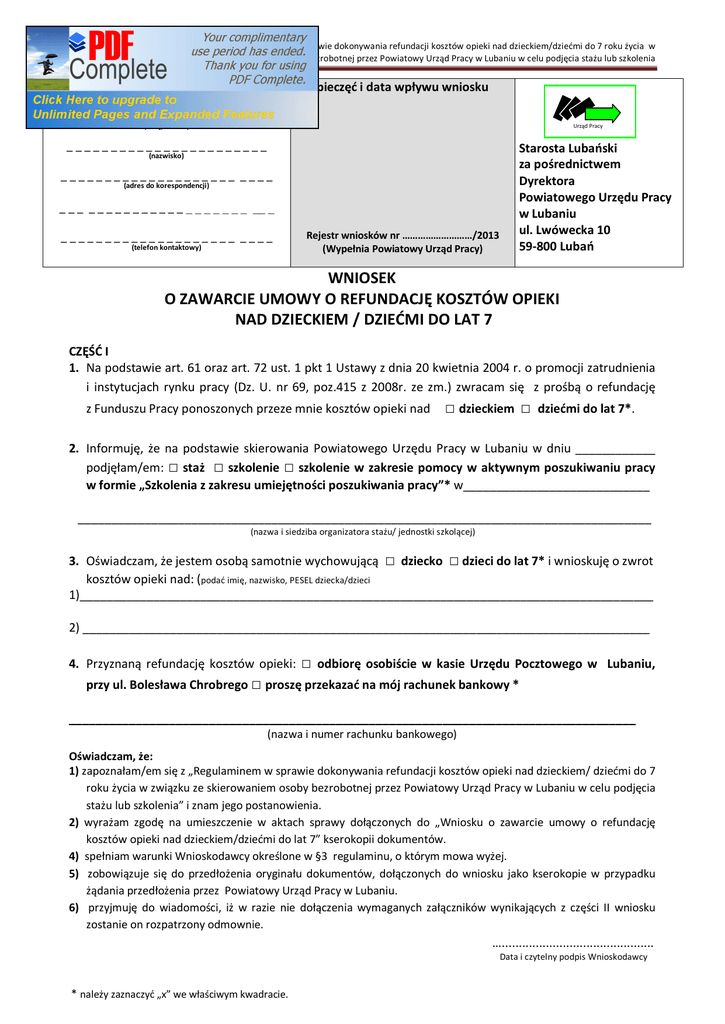 Załącznik nr 1 do Regulaminu z dnia 24.01.2013 r. w sprawie dokonywania refundacji kosztów opieki nad dzieckiem/dziećmi do 7 roku życia w związku ze skierowaniem osoby bezrobotnej przez Powiatowy Urząd Pracy w Lubaniu w celu podjęcia stażu lub szkolenia WNIOSKODAWCA pieczęć i data wpływu wniosku ___ ___________________ (imię/imiona) Urząd Pracy _______________________ (nazwisko) ____________________ ____ (adres do korespondencji) _ _ _ _ _ _ _ _ _ _ _ _ _ _ _ _ _ _ _ _ _ __ _ ____________________ ____ (telefon kontaktowy) Rejestr wniosków nr ………………………/2013 (Wypełnia Powiatowy Urząd Pracy) Starosta Lubański za pośrednictwem Dyrektora Powiatowego Urzędu Pracy w Lubaniu ul. Lwówecka 10 59-800 Lubań WNIOSEK O ZAWARCIE UMOWY O REFUNDACJĘ KOSZTÓW OPIEKI NAD DZIECKIEM / DZIEĆMI DO LAT 7 CZĘŚĆ I 1. Na podstawie art. 61 oraz art. 72 ust. 1 pkt 1 Ustawy z dnia 20 kwietnia 2004 r. o promocji zatrudnienia i instytucjach rynku pracy (Dz. U. nr 69, poz.415 z 2008r. ze zm.) zwracam się z prośbą o refundację z Funduszu Pracy ponoszonych przeze mnie kosztów opieki nad □ dzieckiem □ dziećmi do lat 7*. 2. Informuję, że na podstawie skierowania Powiatowego Urzędu Pracy w Lubaniu w dniu ____________ podjęłam/em: □ staż □ szkolenie □ szkolenie w zakresie pomocy w aktywnym poszukiwaniu pracy w formie „Szkolenia z zakresu umiejętności poszukiwania pracy”* w____________________________ ______________________________________________________________________________________ (nazwa i siedziba organizatora stażu/ jednostki szkolącej) 3. Oświadczam, że jestem osobą samotnie wychowującą □ dziecko □ dzieci do lat 7* i wnioskuję o zwrot kosztów opieki nad: (podać imię, nazwisko, PESEL dziecka/dzieci 1)______________________________________________________________________________________ 2) _____________________________________________________________________________________ 4. Przyznaną refundację kosztów opieki: □ odbiorę osobiście w kasie Urzędu Pocztowego w Lubaniu, przy ul. Bolesława Chrobrego □ proszę przekazać na mój rachunek bankowy * _____________________________________________________________________________________ (nazwa i numer rachunku bankowego) Oświadczam, że: 1) zapoznałam/em się z „Regulaminem w sprawie dokonywania refundacji kosztów opieki nad dzieckiem/ dziećmi do 7 roku życia w związku ze skierowaniem osoby bezrobotnej przez Powiatowy Urząd Pracy w Lubaniu w celu podjęcia stażu lub szkolenia” i znam jego postanowienia. 2) wyrażam zgodę na umieszczenie w aktach sprawy dołączonych do „Wniosku o zawarcie umowy o refundację kosztów opieki nad dzieckiem/dziećmi do lat 7” kserokopii dokumentów. 4) spełniam warunki Wnioskodawcy określone w §3 regulaminu, o którym mowa wyżej. 5) zobowiązuje się do przedłożenia oryginału dokumentów, dołączonych do wniosku jako kserokopie w przypadku żądania przedłożenia przez Powiatowy Urząd Pracy w Lubaniu. 6) przyjmuję do wiadomości, iż w razie nie dołączenia wymaganych załączników wynikających z części II wniosku zostanie on rozpatrzony odmownie. …............................................. Data i czytelny podpis Wnioskodawcy * należy zaznaczyć „x” we właściwym kwadracie. Załącznik nr 1 do Regulaminu z dnia 24.01.2013 r. w sprawie dokonywania refundacji kosztów opieki nad dzieckiem/dziećmi do 7 roku życia w związku ze skierowaniem osoby bezrobotnej przez Powiatowy Urząd Pracy w Lubaniu w celu podjęcia stażu lub szkolenia CZĘŚĆ II Do wniosku dołączam: ( we właściwe pole wstawić X) 1) Potwierdzoną za zgodność z oryginałem kserokopię aktu urodzenia dziecka/dzieci; 2) Potwierdzoną za zgodność z oryginałem kserokopię wyroku orzekającego rozwód lub separację lub Potwierdzoną za zgodność z oryginałem kserokopię wyroku orzekającego pozbawienie współmałżonka władzy rodzicielskiej nad dzieckiem lub Potwierdzoną za zgodność z oryginałem kserokopię zaświadczenia z zakładu karnego o odbywaniu kary pozbawienia wolności przez współmałżonka lub; Potwierdzoną za zgodność z oryginałem kserokopię aktu zgonu współmałżonka. ……..…………………………………… Data i czytelny podpis Wnioskodawcy CZĘŚĆ III – WYJAŚNIENIA I UWAGI DO WNIOSKU _______________________________________________________________________________________ _______________________________________________________________________________________ _______________________________________________________________________________________ _______________________________________________________________________________________ _______________________________________________________________________________________ _______________________________________________________________________________________ _______________________________________________________________________________________ _______________________________________________________________________________________ ……..…………………………………… Data i czytelny podpis Wnioskodawcy