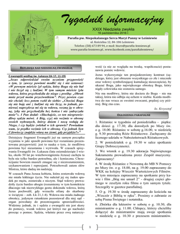 Tygodnik informacyjny XXIX Niedziela zwykła 16 października 2016 r. Parafia pw. Niepokalanego Serca Maryi Panny w Leśniewie ul. Kościelna 12, 84-106 Leśniewo Telefon: (58) 673 89 94, e-mail: [email protected] www.parafia-lesniewo.pl , www.facebook.com/parafialesniewo/ wość (a nie ze względu na troskę, współczucie) postanawia pomóc wdowie. REFLEKSJA NAD NIEDZIELNĄ EWANGELIĄ Jezus wykorzystuje ten przejaskrawiony kontrast (sędziego, który jest obrazem wszystkiego co złe i nieczułe oraz wdowy symbolizującej kumulację nieszczęścia), by ukazać Boga, jako największego obrońcę Boga, który nigdy człowieka nie zostawia samego. Z ewangelii według św. Łukasza (Łk 17, 11-19) „Jezus odpowiedział swoim uczniom przypowieść o tym, że zawsze powinni modlić się i nie ustawać: «W pewnym mieście żył sędzia, który Boga się nie bał i nie liczył się z ludźmi. W tym samym mieście żyła wdowa, która przychodziła do niego z prośbą: „Obroń mnie przed moim przeciwnikiem”. Przez pewien czas nie chciał; lecz potem rzekł do siebie: „Chociaż Boga się nie boję ani z ludźmi się nie liczę, to jednak, ponieważ naprzykrza mi się ta wdowa, wezmę ją w obronę, żeby nie przychodziła bez końca i nie zadręczała mnie”». I Pan dodał: «Słuchajcie, co ten niesprawiedliwy sędzia mówi. A Bóg, czyż nie weźmie w obronę swoich wybranych, którzy dniem i nocą wołają do Niego, i czy będzie zwlekał w ich sprawie? Powiadam wam, że prędko weźmie ich w obronę. Czy jednak Syn Człowieczy znajdzie wiarę na ziemi, gdy przyjdzie?»” Nie ma modlitwy, która nie dociera do Boga – nie ma takiej, która nie odbija się echem w niebie. Każda modlitwa do nas wraca ze swoimi owocami, prędzej czy później. Bóg zna czas. ks. Krzysztof OGŁOSZENIA PARAFIALNE 1. Różaniec w tygodniu od poniedziałku - piątku: dla dzieci g. 17.30; dla dorosłych po Mszy św. o g. 18.00. Różaniec w sobotę g.16.00, w niedzielę g. 9.30 prowadzą Róże Różańcowe. Zachęcamy do licznego udziału w Nabożeństwach Różańcowych. 2. W poniedziałek o g. 19.30 w salce spotkanie Grupy Dobroczynności. 3. We wtorek o g. 19.30 adoracja Najświętszego Sakramentu prowadzona przez Zespół muzyczny. Zapraszamy! 4. W środę Różaniec z Nowenną do MB N Pomocy po Mszy św. o g. 18.00, na g. 19.00 zapraszamy do WKK na kolejny Wieczór Wartościowych Filmów. W tym miesiącu zapraszamy na spotkanie przy kawie i film „Bóg nie umarł 2” - drugiej części głośnego w zeszłym roku filmu o tym samym tytule. Szczegóły w gazetce parafialnej. 5. O g. 19.30 w środę zapraszamy do kościoła na „Wieczór z Biblią w ręku”. Prosimy o zabranie ze sobą Pisma Świętego i notatnika. 6. Zbiórka dla lektorów w sobotę o g. 10.30, dla ministrantów o g. 11.00. Chłopcy, którzy chcieliby dołączyć do ministrantów mają swoje spotkania w niedzielę o g. 10.30 z prezesem ministrantów. Dzisiejszy fragment Ewangelii już na samym początku wyjaśnia w jaki sposób powinna być rozumiana prezentowana przypowieść: jest to nauka o tym, że modlitwa powinna być nieustanna i wytrwała. W czasach spisywania Ewangelii św. Łukasza (lata osiemdziesiąte I wieku, około 50 lat po wniebowstąpieniu Jezusa) zachęta ta była nie tylko bardzo potrzebna, ale i konieczna. Chrześcijanie bowiem musieli zmagać się z niezrozumieniem, szykanowaniem i represjami. Potrzebowali zatem słów Mistrza, które dadzą im nadzieję. W czasach Pana Jezusa kobieta, która zostawała wdową nie miała lekkiego życia. Nie należał jej się żaden spadek po mężu, zostawała z niczym. Stąd wdowy prowadziły życie bardzo ubogie (rozumiemy w tym kontekście dlaczego tak niezwykłego gestu dokonała wdowa, którą Jezus pochwalił, gdy wrzuciła ofiarę do skarbony w świątyni – zob. Łk 21,1-4). Wdowa nie miała żadnego obrońcy, jedynym ratunkiem pozostawał dla niej sąd – organ powołany do przestrzegania sprawiedliwości. Widzimy jednak, że i sędzia z ewangelii nie jest skory do pomocy, wszak wdowa już któryś raz go nachodzi prosząc o pomoc. Sędzia, właśnie przez ową natarczy- 1 Scholka dziecięca spotyka się w sobotę o g. 13.00 w salce przy kościele. 7. W sobotę o g. 17.00 Msza św. z liturgią niedzielną. 8. Zbliża się listopad: to miesiąc pamięci o zmarłych, w naszych modlitwach polecamy Bogu wszystkich, którzy już zakończyli ziemskie pielgrzymowanie. Włączamy się w modlitwę Kościoła. Tradycyjnie kartki z imionami zmarłych na zdrowaśki i Mszę Zbiorową, którą odprawimy w Dniu Zadusznym o g. 19.00 w intencji Zmarłych wraz z ofiarą możemy składać codziennie do koszyków wystawionych na bocznych ołtarzach. Wypominki roczne w wysokości 30 zł od osoby, możemy składać w zakrystii i w kancelarii parafialnej. 9. Bóg zapłać za złożone w ubiegłą niedzielę ofiary na fundusz stypendialny dla młodzieży. Zebraliśmy 1346 zł. Bóg zapłać, za składane dzisiaj ofiary na tacę budowlaną. 10. Miło nam zaprosić na naszą nową stronę internetową, która funkcjonuje pod adresem www.parafia-lesniewo.pl . Strona od wczoraj ma nową szatę graficzną i będzie systematycznie uzupełniana. 11. W dzisiejszą niedzielę młodzież może jeszcze zapisywać się na wyjazd na Wieczór Modlitwy Młodych, który odbędzie się w najbliższy piątek w Wejherowie. Koszt 10 zł, wyjazd o g. 18.30 spod kościoła. Powrót ok. g. 24. Osoby niepełnoletnie zabierają ze sobą podpisaną przez rodzica zgodę. 12. Małżeństwa zapraszamy na pierwszy po wakacjach spotkanie dla małżeństw, którego temat w tym miesiącu brzmi „Panie, ile razy? Przebaczenie w małżeństwie". Spotkanie odbędzie się w piątek o g. 19.30 w kościele Świętej Trójcy w Wejherowie. Informacje na plakacie. 13. W przyszłą niedzielę gościć będziemy w naszej parafii dwie siostry ze Zgromadzenia Sióstr Miłosierdzia, które w trwającym Roku Jubileuszowym Miłosierdzi
