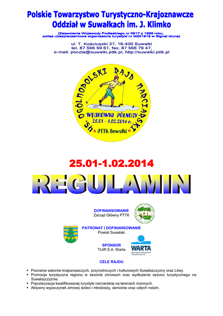 25.01-1.02.2014 DOFINANSOWANIE Zarząd Główny PTTK PATRONAT I DOFINANSOWANIE Powiat Suwalski SPONSOR TUiR S.A. Warta CELE RAJDU Poznanie walorów krajoznawczych, przyrodniczych i kulturowych Suwalszczyzny oraz Litwy. Promocja turystyczna regionu w sezonie zimowym oraz wydłużenie sezonu turystycznego na Suwalszczyźnie. Popularyzacja kwalifikowanej turystyki narciarskiej na terenach nizinnych. Aktywny wypoczynek zimowy dzieci i młodzieży, seniorów oraz całych rodzin. TRASA I Kierownik trasy: Andrzej Stróżecki Miejsce zbiórki: Budynek PTTK Oddział w Suwałkach, ul. T. Kościuszki 37 Termin zbiórki: 25 stycznia 2014, godz. 18.00 Przebieg trasy: 25.01.2014 godz. 18.30 przejazd busem z Suwałk do Wiżajn (gospodarstwo agroturystyczne KALINKA, ul. Półwysep 1 w Wiżajnach) 26-28.01.2014 wycieczki narciarskie po obu stronach granicy polsko-litewskiej od Bolci do Budziska 29.01.2014 transport z Wiżajn do Rutki Tartak (gospodarstwo agroturystyczne ANITA, ul. 3 Maja 9 w Rutce Tartak) 29-31.01.2014 wycieczki narciarskie po obu stronach granicy polsko-litewskiej od Bolci do Budziska 1.02.2014 godz. 8.00 transport z Rutki Tartak do Suwałk godz. 11.00 spotkanie w Suwałkach w Oddziale PTTK przy ul. T. Kościuszki 37 podczas zakończenia rajdu Cena: 370 zł/członkowie PTTK 385 zł/pozostali uczestnicy Świadczenia: opieka kierownika trasy, miejsca noclegowe w gospodarstwach agroturystycznych (z pościelą), ubezpieczenie od następstw nieszczęśliwych wypadków (NNW), transport autokarowy, znaczek rajdowy, odcisk pamiątkowej pieczęci, potwierdzenie do weryfikacji odznak: Miłośnik Suwalszczyzny i Mazur, Przyjaciel Suwałk. Informacje dodatkowe: W dniach 24/25 stycznia 2014 r. uczestnicy trasy mają zapewnione nieodpłatne noclegi w budynku Oddziału PTTK (potrzebny materac i śpiwór). Szczegółowy przebieg tras dziennych ustalany będzie w zależności od warunków pogodowych i śniegowych. Długość odcinków wynosi 15–20 km. Uczestnicy powinni posiadać Europejską Kartę Ubezpieczenia Zdrowotnego. Trasa zostanie odwołana w przypadku małej ilości osób. Na trasie będzie możliwość odbycia szkolenia dla kandydatów na przodownika turystyki narciarskiej, pod warunkiem, iż do 12 stycznia 2014 roku zgłoszą się min. 4 osoby. TRASA II Kierownicy trasy: Beata Karwel, Tadeusz Rufiński, Beata Musiałowska Miejsce zbiórki: Budynek PTTK Oddział w Suwałkach, ul. T. Kościuszki 37 Termin zbiórki: 25 stycznia 2014, godz. 7.30 25.01.2014 Przebieg trasy: godz. 8.00 przejazd autokarem do Plateliai na Litwie. Przypomnienie technik narciarstwa biegowego. 27.01-1.02.2014 wycieczki narciarskie po Żmudzkim Parku Narodowym oraz okolicach 1.02.2014 godz. 6.00 (czasu polskiego) przejazd autokarem z Plateliai do Suwałk, godz. 11.00 spotkanie w Suwałkach w Oddziale PTTK przy ul. T. Kościuszki 37 podczas zakończenia rajdu Cena: 450 zł/członkowie PTTK 465 zł/pozostali uczestnicy Świadczenia: opieka kierowników trasy, miejsca noclegowe (z pościelą) w Ośrodku, ubezpieczenie od następstw nieszczęśliwych wypadków (NNW) oraz koszty leczenia (KL), transport autokarowy, znaczek rajdowy, odcisk pamiątkowej pieczęci, potwierdzenie do weryfikacji odznak: Miłośnik Suwalszczyzny i Mazur, Przyjaciel Suwałk. Informacje dodatkowe: W dniach 24/25 stycznia 2014 r. uczestnicy trasy mają zapewnione nieodpłatne noclegi w budynku Oddziału PTTK (potrzebny materac i śpiwór). Szczegółowy przebieg tras będzie ustalany na miejscu w zależności od warunków pogodowych. Przypominamy, że wszyscy uczestnicy trasy powinni posiadać Europejską Kartę Ubezpieczenia Zdrowotnego (EKUZ). Trasa posiada ograniczoną ilość miejsc – 50. Witajcie Północnicy! Wędrówki Północy 2014 odbędą się na Litwie w Żmudzkim Parku Narodowym w mieście Plateliai (Płotele) położonym na północno-zachodnim krańcu Litwy, ok. 50 km na wschód od Morza Bałtyckiego i miasta Kłajpeda. Część osób spędziła już tam 40. Ogólnopolski Rajd Narciarski „WĘDRÓWKI PÓŁNOCY” w 2009 roku. Mam nadzieję, że zima okaże się co najmniej tak łaskawa jak w zeszłym roku i pozwoli na miłe wędrowanie po ośnieżonych szlakach. Miasto Plateliai, położone w okręgu telszańskim, nad jeziorem o tej samej nazwie, liczy ponad 1000 mieszkańców. Obecnie miejscowość wraz z jeziorem wchodzą w skład Żmudzkiego Parku Narodowego, który został utworzony w 1991 roku i przez, który można długo jechać drogami nie widząc żadnej chaty. Naturalne wzniesienia terenu, o niewielkich wysokościach i łagodnych zboczach tworzą bardzo malowniczy krajobraz porośnięty głównie lasami: jodłowymi, sosnowymi i brzozowymi. Jezioro, które kryje się w samym sercu parku, to jedno z największych i najczystszych jezior Litwy, gdzie znajduje się siedem wysp i liczne zatoki. Wokół jeziora znajdują się szlaki piesze i rowerowe. Podobnie jak w 2009 roku, nasz pobyt zarezerwowany jest w Hotelu Saltinelis (przez uczestników WP zwanym Alcatraz). Znajduje się tam basen, z którego będzie można korzystać nieodpłatnie (jest już w cenie pokoju) i sauna, za którą odpłatność wynosi 100 LTL za 3 godziny. Pokoje 2,3,4 osobowe z łazienkami. Nocleg z pościelą. W pokojach znajduję się: stolik, szafka, szafa ubraniowa oraz lodówka. W hotelu jest kuchnia z czajnikami i termosami. Wyżywienie w restauracji hotelu kosztuje: śniadanie ok. 7litów, obiad ok. 12 litów oraz kolacja ok. 7 litów. Mapy regionu bezpłatnie będzie można nabyć w Centrum Informacji Turystycznej. Poniżej przedstawiam listę rzeczy najpotrzebniejszych i niezbędnych, które należy ze sobą zabrać na WP: - oczywiście narty i strój narciarski, - rękawice, szalik, czapkę, okulary słoneczne, - buty turystyczne, kapcie i klapki, - bieliznę na zmianę, - strój kąpielowy (panowie kąpielówki), - apteczkę turystyczną i krem zimowy do twarzy, - „wdzianko” na spotkania wieczorne, - mały plecak, termos, kubek, miseczkę i