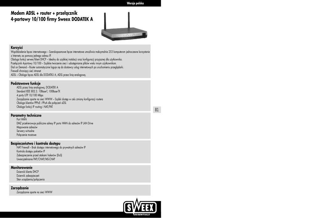 Wersja polska Modem ADSL + router + przełącznik 4-portowy 10/100 firmy Sweex DODATEK A Korzyści Współdzielenie łącza internetowego – Szerokopasmowe łącze internetowe umożliwia maksymalnie 253 komputerom jednoczesne korzystanie z Internetu za pomocą jednego adresu IP. Obsługa funkcji serwer/klient DHCP – Idealny do szybkiej instalacji oraz konfiguracji przyjaznej dla użytkownika. Przełącznik 4-portowy 10/100 – Szybkie tworzenie sieci i udostępnianie plików wielu innym użytkownikom. Dial on Demand – Router automatycznie loguje się do dostawcy usług internetowych po uruchomieniu przeglądarki. Firewall chroniący sieć intranet ADSL – Obsługa łącza ADSL dla DODATKU A, ADSL przez linię analogową. Podstawowe funkcje • • • • • • ADSL przez linię analogową, DODATEK A Standard IEEE 802.3. 10Base-T, 100Base-TX 4 porty UTP 10/100 Mbps Zarządzanie oparte na sieci WWW – Szybki dostęp w celu zmiany konfiguracji routera Obsługa klientów PPPoE i PPoA dla połączeń xDSL Obsługa funkcji IP routing i NAT/PAT Parametry techniczne • • • • • Port WAN DMZ przekierowuje publiczne adresy IP portu WAN do adresów IP LAN Drive Mapowanie adresów Serwery wirtualne Połączenie mostowe Bezpieczeństwo i kontrola dostępu • • • • NAT Firewall – Brak dostępu internetowego do prywatnych adresów IP Kontrola dostępu pakietów IP Zabezpieczenie przed atakami hakerów (DoS) Uwierzytelnianie PAP/CHAP/MS-CHAP Monitorowanie • Dziennik klienta DHCP • Dziennik zabezpieczeń • Stan urządzenia/połączenia Zarządzanie • Zarządzanie oparte na sieci WWW 81 Wersja polska Wersja polska Szybka konfiguracja w systemach Windows 95, 98 i ME Możliwe zastosowania Zbuduj sieć dla wielu użytkowników i błyskawicznie udostępnij łącze internetowe bez konieczności instalacji dodatkowego oprogramowania. Wbudowany standard PAT/NAT oraz firewall chronią przed użytkownikami zewnętrznymi, którzy próbują przeszukiwać Twój komputer. Uwaga: zaleca się instalację programowego firewalla. Wszystkie stosowane kable to skrętki dwużyłowe. Aby móc przystąpić do konfiguracji routera, komputer musi być wstępnie skonfigurowany. Poniżej podano podstawowe czynności konfiguracyjne. Kliknij prawym przyciskiem myszy ‘Otoczenie sieciowe’ i wybierz ‘Właściwości’. Pojawi się okno ‘Sieć’, służące do konfiguracji parametrów sieci. Jeśli Twój komputer jest wyposażony w modem, w oknie tym pojawi się również karta Dial-Up, protokół TCP/IP karty Dial-Up oraz protokół NetBEUI. Procedura instalacji Konfiguracja rozgałęźnika POTS (ADSL przez POTS, Dodatek A) Rozgałęźnik POTS oddziela sygnał ADSL od linii analogowej. Jego zastosowanie jest konieczne. W przeciwnym razie linia ADSL nie zostanie oddzielona od linii analogowej, co uniemożliwi połączenie z Internetem. Rozgałęźnik POTS umożliwia oddzielenie sygnału ADSL od linii głosowej. Rys. 2-3.1 i 2-3.2 przedstawiają sposób podłączenia kabli. Voice line Telephone NID Ethernet Cable 82 Następnie kliknij protokół ‘TCP/IP’ swojej karty sieciowej. Jeśli podano adres IP, kliknij opcję ‘Automatycznie uzyskaj adres IP’. Splitter Router Rys. 2-3.1 Modem/router ADSL podłączony przez rozgałęźnik POTS Telephone NID Microfilter ADSL Data line Ethernet Microfilter Router Teraz podłącz swój router szerokopasmowy do komputera; podłącz go do karty sieciowej za pomocą zwykłego (nieskrosowanego) kabla. Rys. 2-3.2 Modem/router ADSL podłączony przez różne mikrofiltry W W W. S W E E X . C O M Przejdź do menu ‘Start’ i kliknij ‘Uruchom’. Wpisz polecenie 'winipcfg' (bez cudzysłowu), a następnie wybierz swoją kartę sieciową w celu uzyskania informacji na jej temat. 83 Wersja polska Bieżący adres IP to xxx.xxx.xxx.xxx. Kliknij przycisk ‘Zwolnij wszystko’. Spowoduje to zmianę adresu IP na 0.0.0.0 Wersja polska Szybka konfiguracja w systemach Windows 2000 i XP Aby móc przystąpić do konfiguracji routera, komputer musi być wstępnie skonfigurowany. Poniżej podano podstawowe czynności konfiguracyjne. Kliknij prawym przyciskiem myszy ‘Otoczenie sieciowe’ i wybierz ‘Właściwości’. Pojawi się okno ‘Sieć’, służące do konfiguracji parametrów sieci. Wybierz opcję ‘Protokół internetowy’ (TCP/IP) i kliknij ‘OK’. Następnie kliknij przycisk ‘Odnów wszystko’. Router przypisze adres IP. Zaznacz opcję ‘Uzyskaj adres IP automatycznie’ i kliknij przycisk ‘OK’. 84 85 Na tym kończy się podstawowa konfiguracja w systemach Windows 95, 98 i ME. W razie potrzeby usuń stare połączenie Dial-Up Twojego dostawcy usług internetowych. Dołączona płyta CD-ROM zawiera dodatkowe informacje o zastosowaniach routera. W W W. S W E E X . C O M Przy wpisywaniu poleceń nie dodawaj apostrofów!! Przejdź do menu ‘Start’, kliknij ‘Uruchom’ i wpisz ‘CMD’. Zatwierdź klawiszem ‘Enter’. Wpisz polecenie ‘Ipconfig’ i naciśnij ‘Enter’. Wersja polska Wersja polska Konfiguracja bezprzewodowa Po zalogowaniu się na router możliwe będzie uruchomienie konfiguracji bezprzewodowej. Kliknij przycisk ‘Wireless’ (Bezprzewodowo), aby rozpocząć. Teraz wpisz polecenie ‘Ipconfig/release’ i naciśnij ‘Enter’. Następnie podaj SSID. Pamiętaj, aby podać nazwę używaną przez wszystkich użytkowników bezprzewodowych. Wybierz prawidłowy kanał i zdecyduj, czy chcesz użyć Encryption (Szyfrowanie). Adres IP został odnowiony. Również w tym przypadku będzie on wyglądał następująco: 0.0.0.0. Teraz wpisz polecenie ‘Ipconfig/renew’ i naciśnij ‘Enter’. 86 Następnie kliknij przycisk “Submit” (Zatwierdź) oraz “Save Settings” (Zapisz ustawienia) w ekranie po lewej. 87 Router przypisze teraz nowy adres IP. UWAGA!! Następująca procedura spowoduje usunięcie wszystkich danych wprowadzonych do routera. Oznacza to konieczność ponownego wpisania nazwy użytkownika, hasła, adresów MA