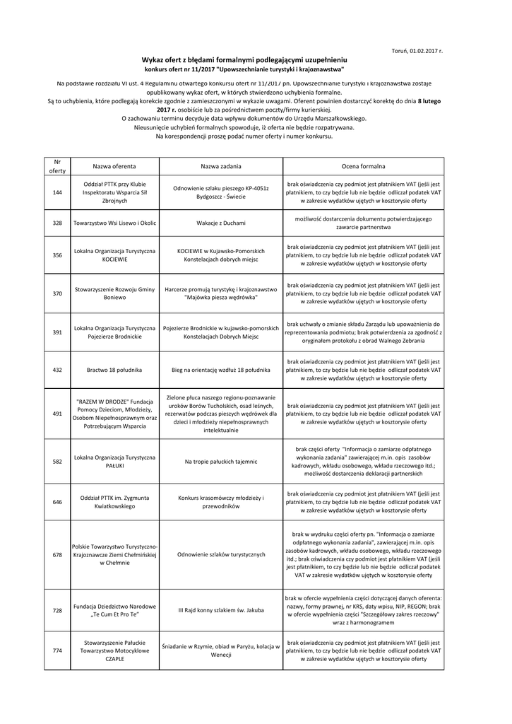 Toruń, 01.02.2017 r. Wykaz ofert z błędami formalnymi podlegającymi uzupełnieniu konkurs ofert nr 11/2017 "Upowszechnianie turystyki i krajoznawstwa" Na podstawie rozdziału VI ust. 4 Regulaminu otwartego konkursu ofert nr 11/2017 pn. Upowszechnianie turystyki i krajoznawstwa zostaje opublikowany wykaz ofert, w których stwierdzono uchybienia formalne. Są to uchybienia, które podlegają korekcie zgodnie z zamieszczonymi w wykazie uwagami. Oferent powinien dostarczyć korektę do dnia 8 lutego 2017 r. osobiście lub za pośrednictwem poczty/firmy kurierskiej. O zachowaniu terminu decyduje data wpływu dokumentów do Urzędu Marszałkowskiego. Nieusunięcie uchybień formalnych spowoduje, iż oferta nie będzie rozpatrywana. Na korespondencji proszę podać numer oferty i numer konkursu. Nr oferty Nazwa oferenta Nazwa zadania Ocena formalna 144 Oddział PTTK przy Klubie Inspektoratu Wsparcia Sił Zbrojnych Odnowienie szlaku pieszego KP-4051z Bydgoszcz - Świecie brak oświadczenia czy podmiot jest płatnikiem VAT (jeśli jest płatnikiem, to czy będzie lub nie będzie odliczał podatek VAT w zakresie wydatków ujętych w kosztorysie oferty 328 Towarzystwo Wsi Lisewo i Okolic Wakacje z Duchami możliwość dostarczenia dokumentu potwierdzającego zawarcie partnerstwa 356 Lokalna Organizacja Turystyczna KOCIEWIE KOCIEWIE w Kujawsko-Pomorskich Konstelacjach dobrych miejsc brak oświadczenia czy podmiot jest płatnikiem VAT (jeśli jest płatnikiem, to czy będzie lub nie będzie odliczał podatek VAT w zakresie wydatków ujętych w kosztorysie oferty 370 Stowarzyszenie Rozwoju Gminy Boniewo Harcerze promują turystykę i krajoznawstwo "Majówka piesza wędrówka" brak oświadczenia czy podmiot jest płatnikiem VAT (jeśli jest płatnikiem, to czy będzie lub nie będzie odliczał podatek VAT w zakresie wydatków ujętych w kosztorysie oferty 391 Lokalna Organizacja Turystyczna Pojezierze Brodnickie brak uchwały o zmianie składu Zarządu lub upoważnienia do Pojezierze Brodnickie w kujawsko-pomorskich reprezentowania podmiotu; brak potwierdzenia za zgodność z Konstelacjach Dobrych Miejsc oryginałem protokołu z obrad Walnego Zebrania 432 Bractwo 18 południka Bieg na orientację wzdłuż 18 południka brak oświadczenia czy podmiot jest płatnikiem VAT (jeśli jest płatnikiem, to czy będzie lub nie będzie odliczał podatek VAT w zakresie wydatków ujętych w kosztorysie oferty 491 "RAZEM W DRODZE" Fundacja Pomocy Dzieciom, Młodzieży, Osobom Niepełnosprawnym oraz Potrzebującym Wsparcia Zielone płuca naszego regionu-poznawanie uroków Borów Tucholskich, osad leśnych, rezerwatów podczas pieszych wędrówek dla dzieci i młodzieży niepełnosprawnych intelektualnie brak oświadczenia czy podmiot jest płatnikiem VAT (jeśli jest płatnikiem, to czy będzie lub nie będzie odliczał podatek VAT w zakresie wydatków ujętych w kosztorysie oferty 582 Lokalna Organizacja Turystyczna PAŁUKI Na tropie pałuckich tajemnic brak części oferty "Informacja o zamiarze odpłatnego wykonania zadania" zawierającej m.in. opis zasobów kadrowych, wkładu osobowego, wkładu rzeczowego itd.; możliwość dostarczenia deklaracji partnerskich 646 Oddział PTTK im. Zygmunta Kwiatkowskiego Konkurs krasomówczy młodzieży i przewodników brak oświadczenia czy podmiot jest płatnikiem VAT (jeśli jest płatnikiem, to czy będzie lub nie będzie odliczał podatek VAT w zakresie wydatków ujętych w kosztorysie oferty Odnowienie szlaków turystycznych brak w wydruku części oferty pn. "Informacja o zamiarze odpłatnego wykonania zadania", zawierającej m.in. opis zasobów kadrowych, wkładu osobowego, wkładu rzeczowego itd.; brak oświadczenia czy podmiot jest płatnikiem VAT (jeśli jest płatnikiem, to czy będzie lub nie będzie odliczał podatek VAT w zakresie wydatków ujętych w kosztorysie oferty III Rajd konny szlakiem św. Jakuba brak w ofercie wypełnienia części dotyczącej danych oferenta: nazwy, formy prawnej, nr KRS, daty wpisu, NIP, REGON; brak w ofercie wypełnienia części "Szczegółowy zakres rzeczowy" wraz z harmonogramem 678 Polskie Towarzystwo TurystycznoKrajoznawcze Ziemi Chełmińskiej w Chełmnie 728 Fundacja Dziedzictwo Narodowe „Te Cum Et Pro Te” 774 Stowarzyszenie Pałuckie Towarzystwo Motocyklowe CZAPLE brak oświadczenia czy podmiot jest płatnikiem VAT (jeśli jest Śniadanie w Rzymie, obiad w Paryżu, kolacja w płatnikiem, to czy będzie lub nie będzie odliczał podatek VAT Wenecji w zakresie wydatków ujętych w kosztorysie oferty 788 799 Fundacja "Leśna Droga" Odnowienie szlaków Nordic Walking "Gutdroga" na terenie gminy Zławieś Wielka i połączenie go z istniejącym międzygminnym szlakiem rowerowym brak oświadczenia czy podmiot jest płatnikiem VAT (jeśli jest płatnikiem, to czy będzie lub nie będzie odliczał podatek VAT w zakresie wydatków ujętych w kosztorysie oferty Europejskie Centrum wymiany brak oświadczenia czy podmiot jest płatnikiem VAT (jeśli jest Konkurs fotograficzny "W poszukiwaniu Młodzieży im. Kurta Schumachera płatnikiem, to czy będzie lub nie będzie odliczał podatek VAT najpiękniejszego krajobrazu Ziemi Chełmińskiej" w Chełmnie w zakresie wydatków ujętych w kosztorysie oferty Termin dostarczenia dokumentów skutkujących usunięciem ww. błędów fomalnych mija 8 lutego 2017 r. O zachowaniu terminu decyduje data wpływu dokumentów do Urzędu Marszałkowskiego. Adres do korespondencji: kontakt z pracownikiem: Urząd Marszałkowski Województwa Kujawsko-Pomorskiego Departament Sportu i Turystyki Pl. Teatralny 3 87-100 Toruń Marek Wiśniewski tel. 56 62 18 453