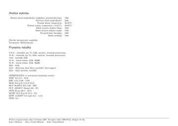 Analiza wykresu Ostatni dzień niepłodności względnej, przedowulacyjnej: Pierwszy dzień niepłodności: Poziom niższy temperatur: Poziom wyższy temperatur (+0,2◦ C): Dzień szczytu objawu śluzu: Dzień szczytu objawu szyjki: Początek fazy lutealnej: Dzień owulacji: 10dc 23dc 36.43◦ C 36.63◦ C 18dc 18dc 19dc 18dc Metoda interpretacji: angielska Termometr: Elektroniczny Prywatna notatka 5-9 dc - wiesiołek (po @), folik, maxivit, stosunek przerywany 12 dc - wiesiołek (po @), folik, maxivit, stosunek przerywany 11dc - lacidofil, folik 14 dc - siemie lniane, folik, MgB6 16 dc - siemie lniane, folik, MgB6 20dc - folik, 21dc - olbrzymia ilość śluzu, lacidofil i lactovaginal 22dc - śluzu niewiele, lacidofil MORFOLOGIA (w nawiasach przepisuję normy): WBC 4,6 (3,5 - 10,0) RBC 4,54 (3,80 - 5,80) HGB 13,6 g/fl (11,0 0 16,5) HCT 38,6PLT 255 (150 - 390) PCT .225MCV 85um3 (80 - 97) MCH 30 pg (26,5 - 33,5) MCHC 35,2 H g/dl (31,5 - 35) RDW 12,9MPV 8,8 um3 (6,5 - 11,0) PDW 14,1 Wykres wygenerowany dnia 6 kwietnia 2007. Początek cyklu: 2006-09-21, długosc 34 dni. http://28dni.pl http://forum.28dni.pl http://blog.28dni.pl