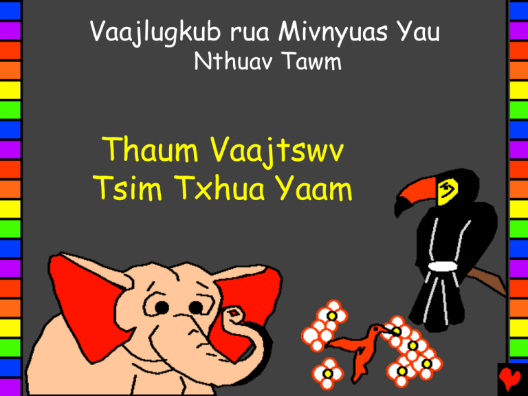 Vaajlugkub rua Mivnyuas Yau Nthuav Tawm Thaum Vaajtswv Tsim Txhua Yaam Tug Sau yog: Edward Hughes Tug Kus Dluab yog: Byron Unger; Lazarus Tug Hloov yog: Bob Davies; Tammy S. Tug Txhais yog: Andy Yang Tug Tsim yog: Bible for Children www.M1914.org ©2013 Bible for Children, Inc. Ntawv Tso Cai: Koj muaj cai muab zaaj nuav kaij lossis luam, tsuav yog koj tsi xob muab muag xwb. Leejtwg tsim peb? Phoo Vaajlugkub, Vaajtswv Txujlug, qha has tas noobneej tshwmsim lug le caag. Tau ntev lug lawm, Vaajtswv tsim thawj tug tuabneeg hab tis nwg npe hu ua Adaas. Vaajtswv tsim Adaas tawm ntawm moov aav lug. Thaum Vaajtswv tshuab paa rua Adaas, nwg muaj sa tuaj. Nwg nyob rua huv ib lub vaaj kws hu ua Edees. Uantej Vaajtswv tsim Adaas, Nwg tsim ib lub nplajteb zoo nkauj heev kws muaj tau yaam zoo heev. Vaajtswv tsim tej tojroob hab tajnraag, tej paajntoos tsw qaab hab tej ntoo sab sab, ... ... tej noog kws muaj tis ci hab tej muv kws yaa nrov ziv, tej ntseg luj kws luam dlej hab tej qwj kws nplag leev. Tseeb tag, Vaajtswv tsim txhua yaam kws muaj lug – txhua yaam. Puag thaum chivkeeb lug, uantej kws Vaajtswv tsim ib yaam dlaabtsi, tsi muaj dlaabtsi le tsuas yog Vaajtswv xwb. Tsi muaj tuabneeg lossis tej qhovchaw lossis ib yaam dlaabtsi le. Tsi muaj ib yaam dlaabtsi le. Tsi muaj qhov kaaj ntug hab tsi muaj qhov tsaus ntuj. Tsi muaj qhov moog sau hab qhov moog huv. Tsi muaj naagmo hab tsi muaj pigkig. Tsuas muaj Vaajtswv tuableeg xwb tug kws tsi muaj qhov pib. Ces Vaajtswv txawm pib ua dlejnum! Thaum chivkeeb, Vaajtswv tsim lub ntuj hab lub nplajteb. Hab lub nplajteb tsi muaj dlaabtsi hab nyob dlo dlus. Hab tsaus ntuj nti thoob plawg sau nplaim dlej havtxwv. Ces Vaajtswv txawm has. “Cale muaj qhov pumkev.” Hab txawm pumkev tuaj. Vaajtswv tisnpe rua qhov pumkev hu ua Nruab Nub hab Nwg tis qhov tsaus ntuj hu ua Mo Ntuj. Hab muaj caij tsaus ntuj hab muaj cai kaaj ntug yog thawj nub. Rua nub ob, Vaajtswv cais tej dlej nyob huv havtxwv, tej havtxwv hab tej paagdlej nyag nyob muaj nyag chaw huvqaab Ntuj Ceebtsheej. Rua nub peb, Vaajtswv has tas, “Cale muaj aav qhuav tshwm tuaj.” Hab nwg cale muaj. Vaajtswv saamfwm kuam tej nroj hab paajntoos hab nrojtsuag hab ntoo cale tshwm tuaj. Hab puab txawm tshwm tuaj. Hab muaj caij tsaus ntuj hab muaj cai kaaj ntug yog nub peb. Ces Vaajtswv txawm tsim lub nub, hab lub hli, hab ntau ntau lub nubqub kws tsi muaj leejtwg suav txheeb le. Hab muaj caij tsaus ntuj hab muaj cai kaaj ntug yog nub plaub. Tej tsaj nruab dleg hab ntseg hab noog yog tej yaam kws Vaajtswv yuav tsim ntxiv. Rua nub tsib Nwg tsim tej ntseg luj luj kws muaj kaugnav ntse hab tej ntseg miv miv, tej qab ceg-ntev hab tej noog ntxuaj tis ceev kws zoo zoo sab heev. Vaajtswv tsim txhua yaam ntseg puv nkaus tej dlej nyob huv nplajteb nuav hab txhua yaam noog nyob sau tej aav hab havtxwv hab nruabntug. Hab muaj caij tsaus ntuj hab muaj cai kaaj ntug yog nub tsib. Tom qaab ntawd, Vaajtswv rov has dlua. Vaajtswv has tas, “Ca lub nplajteb cale tshwm muaj txhua yaam tsajtxhu...” Txhua yaam tsaj hab kaabntsaum hab naab qaadlev txawm tshwm muaj tuaj. Nwg muaj tej ntxhw kws tsuj ua aav tseeg nkawg hab tej naagkus dlej kws najnub txav ntoo. Tej lab txhojpob hab tej kheb xyobtxhaj. Tej caab nplagleev hab tej ca ncaujpuv. Tej neeg cejdlaab ntev kws sab sab hab tej miv kws nyooj pws. Txhua yaam tsaj yog Vaajtswv tsim nub ntawd. Hab muaj caij tsaus ntuj hab muaj cai kaaj ntug yog nub rau. Vaajtswv tsim ibyaam ntxiv rua nub rau ntawd hab – ibyaam tshwjxeeb heev. Zag nuav muaj txhua yaam txhij rua Tuabneeg. Nwg muaj zaubmov nyob tom tajnraag hab muaj tsaj lug koom nwg. Hab Vaajtswv has tas, “Ca Peb tsim tuabneeg kuam muaj yaamntxwv zoo le Peb. Ca nwg muaj fwjchim kaav taagnrho txhua yaam huv nplajteb.” YOGLE VAAJTSWV TSIM TUABNEEG MUAJ YAAMNTXWV ZOO LE NWG; VAAJTSWV TSIM KUAM TUABNEEG MUAJ TUG YAAMNTXWV ZOO LE NWG ... Vaajtswv has rua Adaas. “Noj txhua yaam kws koj ntshaw huv lub vaaj. Tabsis tsi xob noj tsob txiv kws ua rua paub qhov phem hab qhov zoo. Yog koj noj tsob txiv ntawd nub twg ces koj yuav tuag nub ntawd.” Hab tug TSWV kws yog Vaajtswv has tas, “Nwg tsi zoo kws ca tug txivneej nyob ib leeg. Kuv yuav tsim ib tug paab lug rua nwg.” Vaajtswv coj txhua yaam noog hab tsajtxhu lug rua Adaas. Adaas tisnpe rua txhua yaam. Ntshai nwg yuav txawjntse heev mas txhaj le muaj peevxwm ua tau. Tabsis taagnrho tej noog hab tsajtxhu tsi muaj ib tug kws zoo ua khub nrug Adaas le. Vaajtswv ua rua Adaas tsaug tsaugzug heev. Vaajtswv txaj muab tug txivneej kws tsaugzug ntawd ib tug txhaa taav rhu tawm, Vaajtswv muab Adaas tug txhaa taav lug tsim ib tug Quaspuj. Tug quaspuj kws Vaajtswv tsim mas phim nkaus rua Adaas ua khub. Vaajtswv siv rau nub lug tsim txhua yaa. Ces Vaajtswv foom koobmoov rua nub xyaa hab muab ua nub su. Nyob rua huv lub vaaj Edees, Adaas hab Evas nwg tug quaspuj muaj kev kaajsab lug coj lawv le Vaajtswv has. Vaajtswv yog obtug tug TSWV, tug Pub Txhuayaam rua obtug hab yog obtug le Phoojywg. Thaum Vaajtswv Tsim Txhua Yaam Ib zaaj huv Vaajtswv Txujlug, phoo Vaajlugkub, yog nyob rua huv Chivkeeb 1-2 “Lub chaw rua Koj cov Lug nkaag kws muaj teeb ci.” Ntawv Nkauj 119:130 Qhov Xaus Zaaj Vaajlugkub nuv qha peb txug peb tug Vaajtswv zoo kawg nkaus kws tsim peb hab Nwg xaav kuam koj paub Nwg. Vaajtswv paub has tas peb tau ua ntau yaam phem, kws Nwg hu ua kev txhum. Txuj kev rau txim rua kev txhum yog kev tuag, tabsis Vaajtswv hlub koj kawg le kws Nwg xaa Nwg tuableeg Tub, Yexus, lug tuag sau ib tug Ntoo Khaublig hab raug rau txim hloov koj txuj kev txhum. Tomqaab ntawd Yexus sawv rov lug muaj sa hab rov moog nyob nwg lub tsev sau Ntuj Ceebtsheej! Yog koj ntseeg Yexus hab thov kuam Nwg zaam koj tej kev txhum, Nwg yuav ua le ntawd! Nwg yuav lug nyob huv koj taamsim nuav, hab koj yuav nrug Nwg nyob moog le ib txhis. Yog koj ntseeg has tas nuav yog qhov tseeb, ha le nuav rua Vaajtswv: Aub Yexus, kuv ntseeg has tas Koj yog Vaajtswv, hab lug yug ua ib tug tuabneeg lug tuag hloov kuv tej kev txhum, hab n