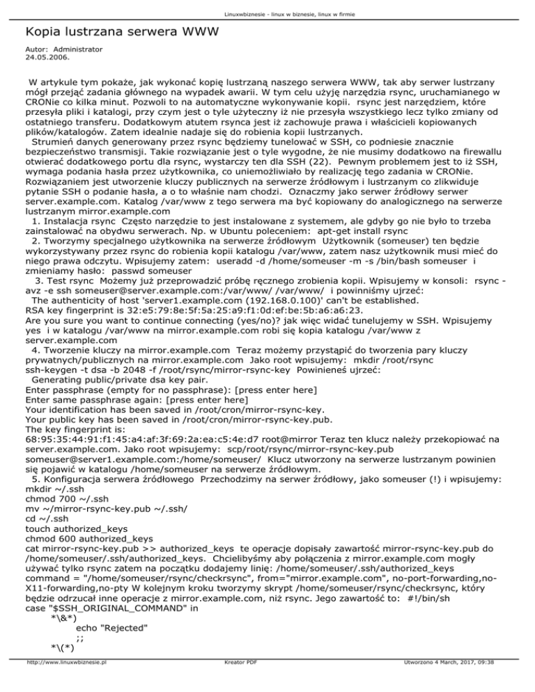 Linuxwbiznesie - linux w biznesie, linux w firmie Kopia lustrzana serwera WWW Autor: Administrator 24.05.2006. W artykule tym pokaże, jak wykonać kopię lustrzaną naszego serwera WWW, tak aby serwer lustrzany mógł przejąć zadania głównego na wypadek awarii. W tym celu użyję narzędzia rsync, uruchamianego w CRONie co kilka minut. Pozwoli to na automatyczne wykonywanie kopii. rsync jest narzędziem, które przesyła pliki i katalogi, przy czym jest o tyle użyteczny iż nie przesyła wszystkiego lecz tylko zmiany od ostatniego transferu. Dodatkowym atutem rsynca jest iż zachowuje prawa i właścicieli kopiowanych plików/katalogów. Zatem idealnie nadaje się do robienia kopii lustrzanych. Strumień danych generowany przez rsync będziemy tunelować w SSH, co podniesie znacznie bezpieczeństwo transmisji. Takie rozwiązanie jest o tyle wygodne, że nie musimy dodatkowo na firewallu otwierać dodatkowego portu dla rsync, wystarczy ten dla SSH (22). Pewnym problemem jest to iż SSH, wymaga podania hasła przez użytkownika, co uniemożliwiało by realizację tego zadania w CRONie. Rozwiązaniem jest utworzenie kluczy publicznych na serwerze źródłowym i lustrzanym co zlikwiduje pytanie SSH o podanie hasła, a o to właśnie nam chodzi. Oznaczmy jako serwer źródłowy serwer server.example.com. Katalog /var/www z tego serwera ma być kopiowany do analogicznego na serwerze lustrzanym mirror.example.com 1. Instalacja rsync Często narzędzie to jest instalowane z systemem, ale gdyby go nie było to trzeba zainstalować na obydwu serwerach. Np. w Ubuntu poleceniem: apt-get install rsync 2. Tworzymy specjalnego użytkownika na serwerze źródłowym Użytkownik (someuser) ten będzie wykorzystywany przez rsync do robienia kopii katalogu /var/www, zatem nasz użytkownik musi mieć do niego prawa odczytu. Wpisujemy zatem: useradd -d /home/someuser -m -s /bin/bash someuser i zmieniamy hasło: passwd someuser 3. Test rsync Możemy już przeprowadzić próbę ręcznego zrobienia kopii. Wpisujemy w konsoli: rsync avz -e ssh [email protected]:/var/www/ /var/www/ i powinniśmy ujrzeć: The authenticity of host 'server1.example.com (192.168.0.100)' can't be established. RSA key fingerprint is 32:e5:79:8e:5f:5a:25:a9:f1:0d:ef:be:5b:a6:a6:23. Are you sure you want to continue connecting (yes/no)? jak więc widać tunelujemy w SSH. Wpisujemy yes i w katalogu /var/www na mirror.example.com robi się kopia katalogu /var/www z server.example.com 4. Tworzenie kluczy na mirror.example.com Teraz możemy przystąpić do tworzenia pary kluczy prywatnych/publicznych na mirror.example.com Jako root wpisujemy: mkdir /root/rsync ssh-keygen -t dsa -b 2048 -f /root/rsync/mirror-rsync-key Powinieneś ujrzeć: Generating public/private dsa key pair. Enter passphrase (empty for no passphrase): [press enter here] Enter same passphrase again: [press enter here] Your identification has been saved in /root/cron/mirror-rsync-key. Your public key has been saved in /root/cron/mirror-rsync-key.pub. The key fingerprint is: 68:95:35:44:91:f1:45:a4:af:3f:69:2a:ea:c5:4e:d7 root@mirror Teraz ten klucz należy przekopiować na server.example.com. Jako root wpisujemy: scp/root/rsync/mirror-rsync-key.pub [email protected]:/home/someuser/ Klucz utworzony na serwerze lustrzanym powinien się pojawić w katalogu /home/someuser na serwerze źródłowym. 5. Konfiguracja serwera źródłowego Przechodzimy na serwer źródłowy, jako someuser (!) i wpisujemy: mkdir ~/.ssh chmod 700 ~/.ssh mv ~/mirror-rsync-key.pub ~/.ssh/ cd ~/.ssh touch authorized_keys chmod 600 authorized_keys cat mirror-rsync-key.pub >> authorized_keys te operacje dopisały zawartość mirror-rsync-key.pub do /home/someuser/.ssh/authorized_keys. Chcielibyśmy aby połączenia z mirror.example.com mogły używać tylko rsync zatem na początku dodajemy linię: /home/someuser/.ssh/authorized_keys command = "/home/someuser/rsync/checkrsync", from="mirror.example.com", no-port-forwarding,noX11-forwarding,no-pty W kolejnym kroku tworzymy skrypt /home/someuser/rsync/checkrsync, który będzie odrzucał inne operacje z mirror.example.com, niż rsync. Jego zawartość to: #!/bin/sh case "$SSH_ORIGINAL_COMMAND" in *\&*) echo "Rejected" ;; *\(*) http://www.linuxwbiznesie.pl Kreator PDF Utworzono 4 March, 2017, 09:38 Linuxwbiznesie - linux w biznesie, linux w firmie *\{*) *\;*) echo "Rejected" ;; echo "Rejected" ;; echo "Rejected" ;; *\<*) echo "Rejected" ;; *\`*) echo "Rejected" ;; rsync\ --server*) $SSH_ORIGINAL_COMMAND ;; *) echo "Rejected" ;; esac Nadajemy mu prawo 700. 6. Testowanie rsynca na mirror.example.com Teraz sprawdzimy czy z mirror.example.com możemy zrobić kopię katalogu /var/www z serwera źródłowego, nie będąc pytanym o hasło. Jako root wpisujemy: rsync -avz --delete --exclude=**/stats --exclude=**/error --exclude=**/files/pictures -e "ssh -i /root/rsync/mirror-rsync-key" [email protected]:/var/www/ /var/www/ Użyte opcje oznaczają: - delete - pliki usunięte na serwerze źródłowym mają też być usunięte na lustrzanym, - exclude - wskazuje maskę, dla plików/katalogów, które nie powinny być kopiowane Powinieneś ujrzeć receiving file list ... done sent 71 bytes received 643 bytes 476.00 bytes/sec total size is 64657 speedup is 90.56 bez prośby o hasło ! 7. Zadanie w CRONie dodajemy wpis do tablic CRONa, który co 5 minut będzie robił kopię lustrzaną. Wpisujemy jako root: crontab -e i potem: */5 * * * * /usr/bin/rsync -azq --delete --exclude=**/stats --exclude=**/ error -exclude=**/files/pictures -e "ssh -i /root/rsync/mirror-rsync-key" [email protected]:/var/www/ /var/www/ http://www.linuxwbiznesie.pl Kreator PDF Utworzono 4 March, 2017, 09:38
