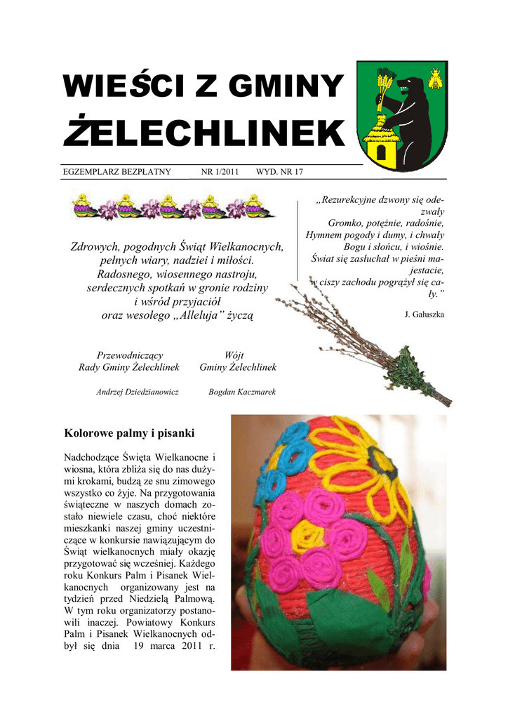 WIEŚCI Z GMINY ŻELECHLINEK EGZEMPLARZ BEZPŁATNY NR 1/2011 WYD. NR 17 Zdrowych, pogodnych Świąt Wielkanocnych, pełnych wiary, nadziei i miłości. Radosnego, wiosennego nastroju, serdecznych spotkań w gronie rodziny i wśród przyjaciół oraz wesołego „Alleluja” życzą Przewodniczący Rady Gminy Żelechlinek Wójt Gminy Żelechlinek Andrzej Dziedzianowicz Bogdan Kaczmarek Kolorowe palmy i pisanki Nadchodzące Święta Wielkanocne i wiosna, która zbliża się do nas dużymi krokami, budzą ze snu zimowego wszystko co żyje. Na przygotowania świąteczne w naszych domach zostało niewiele czasu, choć niektóre mieszkanki naszej gminy uczestniczące w konkursie nawiązującym do Świąt wielkanocnych miały okazję przygotować się wcześniej. Każdego roku Konkurs Palm i Pisanek Wielkanocnych organizowany jest na tydzień przed Niedzielą Palmową. W tym roku organizatorzy postanowili inaczej. Powiatowy Konkurs Palm i Pisanek Wielkanocnych odbył się dnia 19 marca 2011 r. „Rezurekcyjne dzwony się odezwały Gromko, potężnie, radośnie, Hymnem pogody i dumy, i chwały Bogu i słońcu, i wiośnie. Świat się zasłuchał w pieśni majestacie, w ciszy zachodu pogrążył się cały.” J. Gałuszka w Prażkach w gminie Będków. Jak wszystkim wiadomo Józef znosi post, dlatego organizatorzy nastawili się na biesiadę. Gminę Żelechlinek na konkursie reprezentowało KGW Żelechlinek w składzie: Urszula Makowska, Renata Golenia, Janina Piechota, Ewa Grzyb, Anna Celigowska, Iwona Kędzierska, Grażyna Susik. Panie wystawiły do konkursu pisankę wykonaną metodą tradycyjną i nowoczesną oraz palmę wielkanocną wykonaną metodą tradycyjną i współczesną. Oprócz tego przygotowały przepiękny stół wielkanocny, na którym nie zabrakło święconki i przysmaków, które zgodnie z tradycją królują na naszych stołach w Wielkanoc. Stoisko odwiedzane było przez wielu gości, którzy mogli skosztować wszystkich świątecznych smakołyków i poczuć tę niezwykłą atmosferę wiosennych świąt. Konkurs jak co roku ma na celu zachowanie od zapomnienia i popularyzację tradycji i sztuki ludowej. Za udział w konkursie reprezentacja naszej gminy otrzymała dyplom i upominek, który Panie z Żelechlinka przekazały w użytkowanie GDK w Żelechlinku. Wszystkim Paniom, które pięknie reprezentowały naszą Gminę w konkursie składamy serdeczne podziękowania. 2 Żelechlin na ostatkach … IV Powiatowe Ostatki – 8 marca 2011 roku świętowano w Łaznowie. Nowy gospodarz Gminy Rokiciny Wójt Barbara Robak zadbała, aby podczas zabawy nie zabrakło dobrego humoru, jadła i muzyki. Rozpoczęto, jak zwykle od powitania gości, którzy również dość licznie zaszczycili uroczystość. Potem rozpoczęto konkurs. 8 delegacji z terenu powiatu tomaszowskiego zaprezentowało na scenie program artystyczny, głównie skecze i przyśpiewki ludowe. Naszą gminę reprezentowało Koło Gospodyń Wiejskich z Żelechlina w składzie: Wiesława Janowska, Urszula Szymczak, Wiesława Szewczyk, Iwona Gabryszewska, Monika Wolska, Danuta Błazińska, Grażyna Szadkowska, Aneta Malka, Teresa Bedyniak, Celina Maciołek, Iwona Kubiak i Agnieszka Kowalczyk. Paniom przygrywali: Łukasz Janeczek, Szymon Janeczek oraz Paweł Grad. Uwagę przykuwały stroje uczestników: muzycy przebrani za niemowlaki w pampersach i ze smoczkiem w buzi, diablica ze świecącymi rogami, długim ogonem i ostrymi widłami, Żwirek i Muchomorek, cyganki, lekarze ginekolodzy ze swoją pacjentką, kominiarczyk i czarownica. Nasza delegacja nie mogła pozostać niezauważona. Weszła na scenę z impetem, muzyką i przytupem. Czego jak czego, ale pomysłowo- 3 ści, energii i młodzieńczego ducha nie można naszym Paniom odmówić. Rozpoczęły żwawą piosenką przedstawiającą zespół, a następnie zaprezentowały skecz, podczas którego niektórzy pozbyli się części garderoby. Jakie było poruszenie wśród widzów, nie trudno się domyśleć. Na koniec skoczną piosenką zaprosiły do dalszej zabawy. Występ KGW Żelechlin został nagrodzony gromkimi brawami. Podczas ogłaszania werdyktu, zgodnie z którym nasza reprezentacja zajęła II miejsce, słychać było z sali niezadowolenie oglądających, bo przecież Żelechlin był najlepszy, ale nie możemy zawsze wygrywać. Naszym Paniom dziękujemy i życzymy dalszej aktywności. 4 Seniorki z wizytą w teatrze To już prawie rok jak Klub Seniora działający przy GDK w Żelechlinku wznowił swoją działalność. Do Klubu dołączają nowi członkowie, niestety do chwili obecnej nie ma nawet jednego mężczyzny. Nie przeszkadza to jednak Paniom aktywnie uczestniczyć w życiu społecznym i kulturalnym Gminy, czego wielokrotnie dały dowód. Na wniosek Seniorek Dyrektor Gminnego Domu Kultury w Żelechlinku zorganizowała dla nich w dniu 24.03.2011r. wyjazd do Teatru Wielkiego w Łodzi. Po długich namysłach dotyczących repertuaru wybrano operetkę „Hrabinę Marica” – libretto w trzech aktach, jedną z najbardziej węgierskich dzieł Kalmana. Akcja libretta toczy się po pierwszej wojnie światowej, gdy cesarstwo austro-węgierskie legło w gruzach. Hrabina Marica od dawna spędza czas w Paryżu, Budapeszcie lub w Wiedniu, z dala od swojego majątku. Jej posiadłością opiekuje się nowy zarządca – Bela, którym w rzeczywistości jest bankrut - Hrabia Tassilo. Ukrywa on swoje pochodzenie, bo chce samodzielnie wyjść z finansowych opresji. Jest sumienny, pracowity i przystojny. Zwraca to uwagę Hrabiny, która z czasem zakochuje się w swoim pracowniku, zresztą z wzajemnością. Gdy kłamstwo Tassila wychodzi na jaw zrozpaczona odchodzi. Jednak siła uczuć obojga nie pozwala zniszczyć tej miłości. Wszystko kończy się jak w bajce. Panie były pod wrażeniem tego pięknego i niezwykle barwnego widowiska obfitującego w dynamiczne węgierskie - czardaszowe i cygańskie rytmy. Wiele komicznych scen, w które obfitowała operetka sprawiało, że widzo
