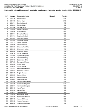 Lista osób zakwalifikowanych na studia stacjonarne I stopnia w roku akademickim 2016/2017 LP Numer Nazwisko Imię 1 205578 Aspras Rafał 177 2 201808 Banaś Eryk 213 3 203374 Barański Jakub 175 4 208344 Bartnicki Jan 189 5 202854 Bączek Jakub 179 6 205380 Berski Krzysztof 183 7 202356 Blasiak Miłosz 180 8 200094 Brzeziński Paweł 183 9 211574 Cegliński Robert 180 10 201489 Cetliński Bartosz 182 11 201095 Chęciński Michał 175 12 201417 Chmal Szymon 182 13 203628 Cholewa Patryk 181 14 203526 Choromański Filip 174 15 209263 Ciborowski Jakub 179 16 206506 Ciepliński Adrian 178 17 209218 Cupiał Bartłomiej 176 18 201660 Cybulski Krzysztof 179 19 203549 Dalak Bartłomiej 178 20 210873 Dąbrowska Zofia 176 21 207223 Domagalski Maciej 178 22 200328 Dryja Hubert 179 23 205329 Dudko Michał 196 24 207927 Fiedorowicz Konrad 175 25 206857 Findeisen Mateusz 189 26 209437 Frajda Damian 179 27 206229 Galant Adam 179 28 210797 Gałan Mateusz 191 29 208545 Gawryś Michał 175 30 211388 Grzegorzewski Kamil 176 31 201736 Gutkowski Krzysztof 176 32 202271 Hawliczek Grzegorz 180 33 208960 Heldt Paweł 183 34 210126 Jamski Piotr 182 35 205673 Jurek Wojciech 181 36 205070 Kaczyński Daniel 175 37 207729 Karwowski Mateusz 180 38 209486 Koczan Mateusz 180 39 205962 Kolasa Katarzyna 176 40 208763 Kołaczkowski Adam 179 COI-PW Rekrutacja letnia 2016/2017 Uwagi 11-07-2016 14:59:36 Punkty Strona: 1 / 3 Lista osób zakwalifikowanych na studia stacjonarne I stopnia w roku akademickim 2016/2017 LP Numer Nazwisko Imię 41 201276 Konieczna Anna 176 42 209462 Konopiński Krzysztof 182 43 211329 Koprowski Bartosz 177 44 202830 Krasuski Marcin 178 45 207827 Król Bogdan 176 46 202583 Królak Bartłomiej 175 47 211596 Kruk Hubert 183 48 206800 Kupski Oskar 186 49 207401 Kuźma Igor 177 50 202538 Kwaśniak Patryk 180 51 209287 Lewandowski Marcin 182 52 205347 Lipski Maciej 183 53 209654 Lisowski Marcin 201 54 205232 Łyś Konrad 183 55 209407 Łyżwa Marek 183 56 209046 Macieja Mateusz 182 57 202930 Makowski Paweł 178 58 200519 Matusek Paweł 176 59 204364 Matycz Wojciech 177 60 200255 Milewski Patryk 177 61 200137 Muca Kamil 179 62 208091 Musiatowicz Wojciech 180 63 211271 Niedziałek Kacper 175 64 203950 Pajączkowski Kamil 181 65 201880 Pawlikowska Aleksandra 176 66 202355 Petruczynik Szymon 194 67 202060 Piekutowski Mikołaj 174 68 212313 Pleszyński Jan 183 69 206122 Podurgiel Krzysztof 181 70 203372 Pogodziński Piotr 180 71 207364 Rączy Kacper 182 72 203319 Rejent Jakub 182 73 209354 Romaniuk Mateusz 180 74 201649 Różaniecki Wojciech 174 75 206385 Rybicki Damian 177 76 208774 Rząca Jacek 174 77 200289 Samul Kamil 175 78 207829 Sikorski Leonard 174 79 210919 Sipak Wojciech 181 80 205602 Socha Łukasz 177 COI-PW Rekrutacja letnia 2016/2017 Uwagi 11-07-2016 14:59:36 Punkty Strona: 2 / 3 Lista osób zakwalifikowanych na studia stacjonarne I stopnia w roku akademickim 2016/2017 LP Numer Nazwisko Imię 81 200149 Sochański Marcin 177 82 202654 Sopiński Mateusz 177 83 203929 Stawiarska Karina 177 84 201771 Strachowski Bartosz 178 85 210095 Szewczyk Miron 177 86 201258 Szwaczkiewicz Gabriel 189 87 205643 Szweda Kacper 174 88 201137 Szymański Karol 177 89 202275 Śledź Michał 182 90 210052 Tarnowski Maciej 197 91 211812 Tomaszewski Filip 174 92 200516 Tymiński Kamil 181 93 204338 Utnicki Rafał 179 94 208425 Wasik Maciej 175 95 210733 Wawrzyniak Damian 174 96 208780 Weiss Michał 174 97 203469 Wilk Krzysztof 187 98 211604 Wiśniewski Adam 182 99 200052 Witkowski Piotr 183 100 211363 Wlazło Daniel 186 101 201287 Wołoch Józef 179 102 208886 Woźniak Michał 181 103 202063 Wydrzyński Mateusz 183 104 204464 Zalewski Maciej 174 105 206618 Zanio Mateusz 190 106 203806 Zarczuk Paweł 180 107 206917 Zych Paweł 189 COI-PW Rekrutacja letnia 2016/2017 Uwagi 11-07-2016 14:59:36 Punkty Strona: 3 / 3