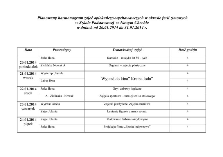 Planowany harmonogram zajęć opiekuńczo-wychowawczych w okresie ferii zimowych w Szkole Podstawowej w Nowym Chechle w dniach od 20.01.2014 do 31.01.2014 r. Data Prowadzący Jarka Ilona 20.01.2014 poniedziałek Zielińska Nowak A. Temat/rodzaj zajęć Ilość godzin Karaoke – muzyka lat 80 - tych 4 Orgiami – zajęcia plastyczne 4 21.01.2014 wtorek Wystemp Urszula Labus Ewa Wyjazd do kina” Kraina lodu” 4 22.01.2014 środa Jarka Ilona Gry i zabawy logiczne 4 Zajęcia sportowe – turniej tenisa stołowego 4 23.01.2014 czwartek Wyrwas Arleta Zajęcia plastyczne. Zajęcia ruchowe 4 Zając Jolanta Lepienie figurek z masy solnej. 4 24.01.2014 piątek Zając Jolanta Malowanie farbami akrylowymi 4 Projekcja filmu „Epoka lodowcowa” 4 A. Zielińska –Nowak Jarka Ilona 4 27.01.2014 Zielińska - Nowak A. poniedziałek Zając Jolanta Turniej gier planszowych. Zajęcia plastyczne 4 4 28.01.2014 wtorek Strzoda Anna Konkurs piosenki. Wykonywanie dekoracji i strojów na zabawę karnawałową. Zabawy ruchowe przy muzyce. Zielińska Nowak A. Zajęcia komputerowe. 4 29.01.2014 środa Labus Ewa Zabawy ruchowe. Gry planszowe 4 Strzoda Anna 4 30.01.2014 czwartek Labus Ewa Projekcja filmu. Wykonywanie kartek walentynkowych i upominków. Gry i zabawy w języku angielskim. Wyrwas Arleta Poranek filmowy. Gry komputerowe. 4 31.01.2014 Wielki Małgorzata Tenis stołowy. Siatkówka. Gry zespołowe na sali gimnastycznej.. Zajęcia ruchowe przy muzyce. Turniej gier warcaby. 4 piątek Wyrwas Arleta Zajęcia na terenie szkoły odbywać się będą w godz. 9.00 – 13.00 4 4 4