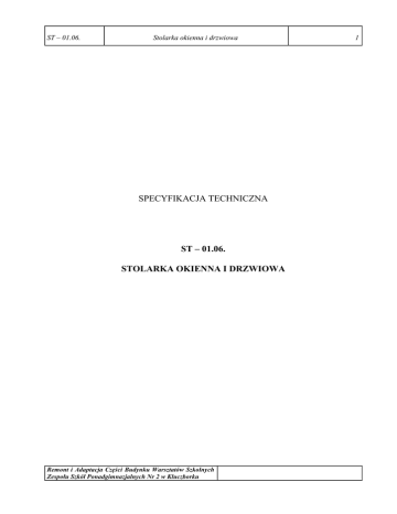 ST – 01.06. Stolarka okienna i drzwiowa SPECYFIKACJA TECHNICZNA ST – 01.06. STOLARKA OKIENNA I DRZWIOWA Remont i Adaptacja Części Budynku Warsztatów Szkolnych Zespołu Szkół Ponadgimnazjalnych Nr 2 w Kluczborku 1 ST – 01.06. Stolarka okienna i drzwiowa 2 1. WSTĘP 1.1. Przedmiot ST Niniejsza Szczegółowa Specyfikacja Techniczna odnosi się do wymagań technicznych dotyczących wykonania i odbioru robót związanych z montażem stolarki okiennej oraz stolarki i ślusarki drzwiowej w ramach zadania inwestycyjnego: „Remon i Adaptacja Części Budynku Warsztatów Szkolnych Zespołu Szkół Ponadgimnazjalnych Nr 2 na Pracownie Specjalistyczne Centrum Kształcenia Ustawicznego w Kluczborku”. 1.2. Zakres stosowania ST Specyfikacja techniczna stosowana jest jako dokument przetargowy i kontraktowy przy zlecaniu i realizacji robót wymienionych w punkcie 1.1. 1.3. Zakres robót objętych ST Zakres robót objętych niniejszą Specyfikacją dotyczy prowadzenia następujących robót: − montaż stolarki okiennej PCV, − montaż naświetli stałych PCV wewnętrznych i zewnętrznych − montaż drzwi i bram zewnętrznych metalowych − montaż drzwi wewnętrznych PCV i p.poż. − montaż stolarki drzwiowej wewnętrznej drewnianej, − montaż parapetów zewnętrznych z blachy powlekanej 1.4. Określenia podstawowe Określenia podstawowe podane w niniejszej ST są zgodne z obowiązującymi odpowiednimi normami i ST-00.00 – „Wymagania ogólne”. 1.5. Ogólne wymagania dotyczące robót Wykonawca robót jest odpowiedzialny za jakość ich wykonania oraz zgodność z dokumentacją projektową, ST i poleceniami inspektora nadzoru. Roboty prowadzić zgodnie z Rozporządzeniem Ministra Infrastruktury z dnia 6 lutego 2003 r. w sprawie bezpieczeństwa i higieny pracy podczas wykonywania robót budowlanych (Dz. U. z 2003 r. Nr 48, poz. 401). 2. MATERIAŁY 2.1. Ogólne wymagania dotyczące materiałów Ogólne wymagania dotyczące materiałów w części ST – 00.00 – „Wymagania ogólne”. 2.2. Szczegółowe wymagania dotyczące materiałów Szczegółowe wymagania dotyczące materiałów zawarto w części opisowej i rysunkowej dokumentacji projektowej. Do wykonania poszczególnych robót ogólnobudowlanych należy zastosować materiały zgodne z: − dokumentacją projektową, − przywołanymi instrukcjami ITB, − właściwościami określonymi w ST-00.00. Właściwości użytych materiałów muszą odpowiadać polskim normom, świadectwom oraz instrukcjom technicznym dopuszczenia do stosowania wydanym przez odpowiednie instytucje badawcze. Dopuszczone do jednostkowego stosowania w obiekcie budowlanym mogą być wyroby wykonane wg indywidualnej dokumentacji technicznej, sporządzonej przez projektanta obiektu lub z nim uzgodnionej, dla których dostawca wydal oświadczenie wskazujące, że zapewniono zgodność wyrobu z tą dokumentacją oraz z obowiązującymi przepisami i normami. Materiały przed wbudowaniem, każdorazowo powinny być jak określono w specyfikacji, bądź inne, o ile zatwierdzone zostaną przez Inspektora nadzoru. Dane charakterystyczne materiału i wyrobów: Stolarka okienna: Materiał: PCV Profil: minimum czterokomorowy Współczynnik przenikania ciepła dla całego okna U: max 1,0 W/m2 x K Szyba: zespolona dwuszybowa, natomiast w oknach, przewidzianych projektem należy zamontować szyby zespolone dwuszybowe mleczne, a w naświetlach poliwęglan komorowy Ościeżnica PCV: minimalna wysokość 70 mm uzbrojona profilem stalowym zamkniętym. Przewiązki poziome: podział w oknach przewiązkami o minimalnej szerokości 100 mm uzbrojonymi stalą zamkniętą Nawietrzaki okienne: nawietrzaki z regulacją zamykania i otwierania we wszystkich oknach Sposób otwierania i podziały: wg dokumentacji projektowej. Remont i Adaptacja Części Budynku Warsztatów Szkolnych Zespołu Szkół Ponadgimnazjalnych Nr 2 w Kluczborku ST – 01.06. Stolarka okienna i drzwiowa 3 Kolorystyka: wg dokumentacji projektowej Okucia: − posiadające aprobaty techniczne, − posiadające funkcję rozszczelniania (mikroszczeliny), − okucia do okien uchylno-nawiewnych powinny umożliwiać rozwieranie skrzydeł o co najmniej 150, − okucia przy oknach uchylnych powinny umożliwiać ich otwieranie do mycia do kąta 900, − okucia nie mogą mieć możliwości otwierania od zewnątrz. Klamki: metalowe malowane w kolorze okien Stolarka drzwiowa zewnętrzna: współczynnik przenikania ciepła dla ślusarki drzwiowej U max 2,6 W/m2 x k materiał: drzwi stalowe z izolacją termiczną (ciepłe). wyposażenie drzwi: Wszystkie drzwi wyposażone w: samozamykacz z tłumieniem hydraulicznym z regulacją prędkości obrotową oraz możliwością blokady, uchwyty, klamki: każde skrzydło drzwiowe wyposażyć w uchwyt lub klamkę wg stanu istniejącego, zamki: każde drzwi wyposażone w 2 zamki wpuszczane zapadkowo-zasuwkowe wielozastawkowe i bębenkowe lub rolkowo-zasuwkowe. Część drzwi wewnętrznych wyposażyć w zamek szyfrowy. kolor: wg projektu. Stolarka drzwiowa wewnętrzna materiał: drzwi z PCV z profili wzmocnionych pełne drzwi drewniane pełne wzór i kolor uzgodnić z inspektorem nadzoru wszystkie drzwi wyposażone w klamki z szyldami, zamki z wkładką bębenkową drzwi stalowe wewnętrzne ognioodporne EI120 wyposażyć zgodnie z projektem zewewnętrzne: Prefabrykowane z blachy powlekanej w kolorze brązu 3. SPRZĘT Ogólne wymagania dotyczące sprzętu podano w ST-00.00 Do wykonania wszystkich robót należy użyć sprzętu zgodnego z zestawieniem załączonym do kosztorysu ofertowego. Sprzęt powinien być jak określono w specyfikacji, bądź inny, o ile zatwierdzony zostanie przez Inspektora nadzoru. 4. TRANSPORT Transport zgodnie z warunkami ogólnymi w ST-00.00. W pracach należy używać środki transportu zapewniające właściwą jakość przewożonych towarów. Sposób transportu powinien być zgodny z wymaganiami producenta zawartymi w aprobacie technicznej wyrobu. Załadunek