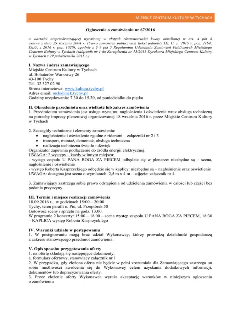 MIEJSKIE CENTRUM KULTURY W TYCHACH Ogłoszenie o zamówieniu nr 67/2016 o wartości nieprzekraczającej wyrażonej w złotych równowartości kwoty określonej w art. 4 pkt 8 ustawy z dnia 29 stycznia 2004 r. Prawo zamówień publicznych (tekst jednolity Dz. U. z 2015 r. poz. 2164; Dz.U. z 2016 r. poz. 1020); zgodnie z § 9 pkt 5 Regulaminu Udzielania Zamówień Publicznych Miejskiego Centrum Kultury w Tychach (załącznik nr 1 do Zarządzenia nr 15/2015 Dyrektora Miejskiego Centrum Kultury w Tychach z 29 października 2015 r.) I. Nazwa i adres zamawiającego Miejskie Centrum Kultury w Tychach ul. Bohaterów Warszawy 26 43-100 Tychy Tel. 32 327 02 90 Strona internetowa: www.kultura.tychy.pl Adres email: [email protected] Godziny urzędowania: 7.30 do 15.30, od poniedziałku do piątku II. Określenie przedmiotu oraz wielkość lub zakres zamówienia 1. Przedmiotem zamówienia jest usługa wynajmu nagłośnienia i oświetlenia wraz obsługą techniczną na potrzeby imprezy plenerowej organizowanej 18 września 2016 r. przez Miejskie Centrum Kultury w Tychach 2. Szczegóły techniczne i elementy zamówienia: nagłośnienie i oświetlenie zgodne z riderami – załączniki nr 2 i 3 transport, montaż, demontaż, obsługa techniczna realizacja techniczna światło i dźwięk Organizator zapewnia podłączenie do źródła energii elektrycznej. UWAGA: 2 występy – każdy w innym miejscu: - występ zespołu U PANA BOGA ZA PIECEM odbędzie się w plenerze: niezbędne są – scena, nagłośnienie i oświetlenie - występ Roberta Kasprzyckiego odbędzie się w kaplicy: niezbędne są – nagłośnienie oraz oświetlenie UWAGA: dostępna jest scena o wymiarach: 2,5 m x 4 m – zdjęcie: załącznik nr 4 3. Zamawiający zastrzega sobie prawo odstąpienia od udzielenia zamówienia w całości lub części bez podania przyczyny. III. Termin i miejsce realizacji zamówienia 18.09.2016 r., w godzinach 15:00 – 20:00 Tychy, teren parafii o. Pio, ul. Przepiórek 50 Gotowość sceny i sprzętu na godz. 13.00. W programie 2 koncerty: 15:00 – 18.00 – scena występ zespołu U PANA BOGA ZA PIECEM, 18:30 – KAPLICA występ Roberta Kasprzyckiego IV. Warunki udziału w postępowaniu 1. W postępowaniu mogą brać udział Wykonawcy, którzy prowadzą działalność gospodarczą z zakresu stanowiącego przedmiot zamówienia. V. Opis sposobu przygotowania oferty 1. na ofertę składają się następujące dokumenty: a. formularz ofertowy, stanowiący załącznik nr 1 2. W przypadku, gdy złożona oferta nie będzie w pełni zrozumiała dla Zamawiającego zastrzega on sobie możliwości zwrócenia się do Wykonawcy celem uzyskania dodatkowych informacji, dokumentów lub doprecyzowania oferty. 3. Przez złożenie oferty Wykonawca wyraża akceptację warunków w niniejszym ogłoszeniu o zamówieniu MIEJSKIE CENTRUM KULTURY W TYCHACH VI. Miejsce oraz termin składania ofert 1. Ofertę można złożyć w następujący sposób: a. osobiście lub przesłać na adres siedziby Zamawiającego: Miejskie Centrum Kultury w Tychach, 43-100 Tychy, ul. Bohaterów Warszawy 26; b. drogą emailową: [email protected] c. faksem: 32 327 02 91, w. 25 w terminie do 15 września 2016 r., do godz. 15.00. Oferty złożone po terminie oraz oferty częściowe nie będą rozpatrywane VII. Kryteria oceny ofert i ich znaczenie 1. Przy wyborze ofert kryterium oceny stanowi: cena – 100% wagi kryterium. 2. Cena oferty musi uwzględniać wszystkie koszty realizacji zamówienia, również te, których nie można było przewidzieć w chwili składania oferty, a które mogłyby mieć wpływ na prawidłową i terminową realizację zamówienia. 3. Oferty złożone po terminie oraz oferty częściowe nie będą rozpatrywane. VIII. Miejsce i termin ogłoszenia o wyborze najkorzystniejszej oferty: Ogłoszenie o wyborze najkorzystniejszej oferty, wraz z wartościami poszczególnych ofert brutto, zostanie przesłane do Wykonawców biorących udział w postępowaniu oraz na stronie BIP Miejskiego Centrum Kultury w Tychach (bez podania wartości ofert), w zakładce: „Zamówienia publiczne” w terminie do: 16 września 2016 r., do godz. 12.00 IX. Informacje dodatkowe Osobą odpowiedzialną merytorycznie za opis przedmiotu zamówienia jest: Anna Śmieszek-Szkutek, tel. 32 327 02 90, w. 25; email: [email protected] X. Załączniki stanowiące integralną część ogłoszenia o zamówieniu: a. Formularz ofertowy – załącznik nr 1 b. Rider techniczny – załącznik nr 2