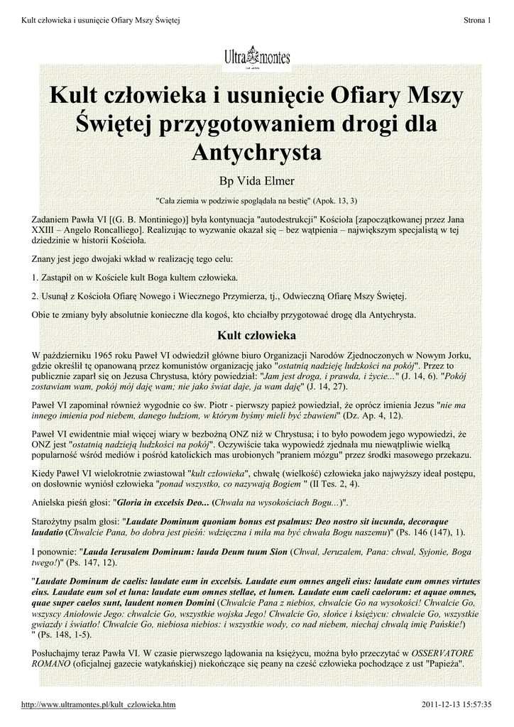 Kult człowieka i usunięcie Ofiary Mszy Świętej Strona 1 Kult człowieka i usunięcie Ofiary Mszy Świętej przygotowaniem drogi dla Antychrysta Bp Vida Elmer "Cała ziemia w podziwie spoglądała na bestię" (Apok. 13, 3) Zadaniem Pawła VI [(G. B. Montiniego)] była kontynuacja "autodestrukcji" Kościoła [zapoczątkowanej przez Jana XXIII – Angelo Roncalliego]. Realizując to wyzwanie okazał się – bez wątpienia – największym specjalistą w tej dziedzinie w historii Kościoła. Znany jest jego dwojaki wkład w realizację tego celu: 1. Zastąpił on w Kościele kult Boga kultem człowieka. 2. Usunął z Kościoła Ofiarę Nowego i Wiecznego Przymierza, tj., Odwieczną Ofiarę Mszy Świętej. Obie te zmiany były absolutnie konieczne dla kogoś, kto chciałby przygotować drogę dla Antychrysta. Kult człowieka W październiku 1965 roku Paweł VI odwiedził główne biuro Organizacji Narodów Zjednoczonych w Nowym Jorku, gdzie określił tę opanowaną przez komunistów organizację jako "ostatnią nadzieję ludzkości na pokój". Przez to publicznie zaparł się on Jezusa Chrystusa, który powiedział: "Jam jest droga, i prawda, i życie..." (J. 14, 6). "Pokój zostawiam wam, pokój mój daję wam; nie jako świat daje, ja wam daję" (J. 14, 27). Paweł VI zapominał również wygodnie co św. Piotr - pierwszy papież powiedział, że oprócz imienia Jezus "nie ma innego imienia pod niebem, danego ludziom, w którym byśmy mieli być zbawieni" (Dz. Ap. 4, 12). Paweł VI ewidentnie miał więcej wiary w bezbożną ONZ niż w Chrystusa; i to było powodem jego wypowiedzi, że ONZ jest "ostatnią nadzieją ludzkości na pokój". Oczywiście taka wypowiedź zjednała mu niewątpliwie wielką popularność wśród mediów i pośród katolickich mas urobionych "praniem mózgu" przez środki masowego przekazu. Kiedy Paweł VI wielokrotnie zwiastował "kult człowieka", chwałę (wielkość) człowieka jako najwyższy ideał postępu, on dosłownie wyniósł człowieka "ponad wszystko, co nazywają Bogiem " (II Tes. 2, 4). Anielska pieśń głosi: "Gloria in excelsis Deo... (Chwała na wysokościach Bogu...)". Starożytny psalm głosi: "Laudate Dominum quoniam bonus est psalmus: Deo nostro sit iucunda, decoraque laudatio (Chwalcie Pana, bo dobra jest pieśń: wdzięczna i miła ma być chwała Bogu naszemu)" (Ps. 146 (147), 1). I ponownie: "Lauda Ierusalem Dominum: lauda Deum tuum Sion (Chwal, Jeruzalem, Pana: chwal, Syjonie, Boga twego!)" (Ps. 147, 12). "Laudate Dominum de caelis: laudate eum in excelsis. Laudate eum omnes angeli eius: laudate eum omnes virtutes eius. Laudate eum sol et luna: laudate eum omnes stellae, et lumen. Laudate eum caeli caelorum: et aquae omnes, quae super caelos sunt, laudent nomen Domini (Chwalcie Pana z niebios, chwalcie Go na wysokości! Chwalcie Go, wszyscy Aniołowie Jego: chwalcie Go, wszystkie wojska Jego! Chwalcie Go, słońce i księżycu: chwalcie Go, wszystkie gwiazdy i światło! Chwalcie Go, niebiosa niebios: i wszystkie wody, co nad niebem, niechaj chwalą imię Pańskie!) " (Ps. 148, 1-5). Posłuchajmy teraz Pawła VI. W czasie pierwszego lądowania na księżycu, można było przeczytać w OSSERVATORE ROMANO (oficjalnej gazecie watykańskiej) niekończące się peany na cześć człowieka pochodzące z ust "Papieża". http://www.ultramontes.pl/kult_czlowieka.htm 2011-12-13 15:57:35 Kult człowieka i usunięcie Ofiary Mszy Świętej Strona 2 "Sława (honor, cześć) człowiekowi, sława myśli, sława nauce, sława technice, sława pracy, sława śmiałości człowieka, sława syntezie naukowych i organizacyjnych zdolności człowieka, który w przeciwieństwie do innych zwierząt, wie jak przekazać swojego ducha i swoją manualną sprawność tym instrumentom podboju. Chwała człowiekowi, królowi ziemi, i dzisiaj księciu przestworzy"...(1). Jednakże jest interesującym pamiętać, że podczas gdy Paweł VI zwiastował chwałę człowieka, astronauci podróżujący w przestrzeni uznali za stosowne odczytać na głos cytat z Biblii chwalący Boga, Stwórcę nieba i ziemi. Ale Paweł VI był bardziej zafascynowany ludzkim dokonaniem niż Boskim dziełem. Powiedział on: "Człowiek jest zarówno wielki jak i boski, w jego pochodzeniu i w jego przeznaczeniu. Dlatego też sławmy człowieka, sławmy jego godność, jego ducha i jego życie". (Do ojców soborowych, 7. XII. 1965). "My również, więcej niż ktokolwiek inny, wyznajemy kult człowieka" (2). To starożytny wąż w rajskim ogrodzie pierwszy ofiarował swoje usługi dla popierania kultu człowieka. On mówił do Ewy: Jeżeli posłuchacie mnie i zrobicie co wam proponuję "będziecie jako bogowie" (Rodz. 3, 5). Tak, kult człowieka jest najlepszym przygotowywaniem drogi dla Antychrysta. Usunięcie Ofiary Mszy Świętej Drugim największym aktem zniszczenia dokonanym przez Pawła VI było usunięcie Ofiary Mszy Świętej z Kościoła, która posiadała zawartą w niej moc powstrzymywania szatana i jego Antychrysta. W celu usunięcia starożytnej Ofiary Mszy Świętej, Paweł VI z pomocą sześciu protestanckich pastorów sfabrykował nową liturgię przeznaczoną dla kultu człowieka. Nazwał ją Mszą Nowego Porządku (Msza Novus Ordo). Następnie przedstawił ją Kościołowi do akceptacji. Przyjęcie było mniej niż entuzjastyczne. Wielu ludzi wyraziło swoje niezadowolenie poprzez spadek uczestnictwa w kościelnych nabożeństwach. Ale ci, którzy pozostali, przyjęli fałszerstwo bez specjalnej niechęci. To zjawisko może być wytłumaczone jedynie przez skuteczne szatańskie zwodzenie, które było zagwarantowane dla Antychrysta. "I cała ziemia z podziwem spoglądała na bestię" (Apok. 13, 4)... Ugodowi badacze Istnienie Antychrysta zmusza nas wszystkich do określenia swojej postawy. Musimy wziąć udział w walce przeciw "człowiekowi grzechu" (II Tes. 2, 3). W tej wojnie nie ma miejsca ani na żaden dialog, ani na kompromis. "Kto nie jest ze mną, przeciw mnie jest"