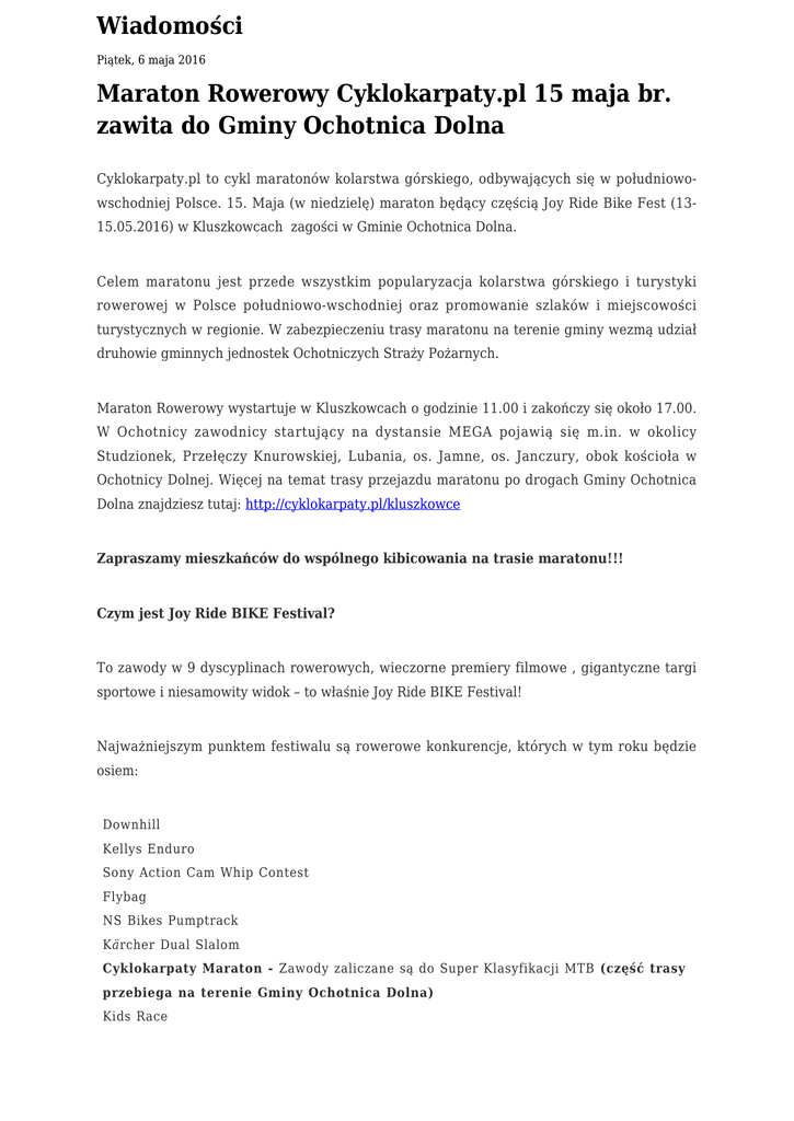 Wiadomości Piątek, 6 maja 2016 Maraton Rowerowy Cyklokarpaty.pl 15 maja br. zawita do Gminy Ochotnica Dolna Cyklokarpaty.pl to cykl maratonów kolarstwa górskiego, odbywających się w południowowschodniej Polsce. 15. Maja (w niedzielę) maraton będący częścią Joy Ride Bike Fest (1315.05.2016) w Kluszkowcach zagości w Gminie Ochotnica Dolna. Celem maratonu jest przede wszystkim popularyzacja kolarstwa górskiego i turystyki rowerowej w Polsce południowo-wschodniej oraz promowanie szlaków i miejscowości turystycznych w regionie. W zabezpieczeniu trasy maratonu na terenie gminy wezmą udział druhowie gminnych jednostek Ochotniczych Straży Pożarnych. Maraton Rowerowy wystartuje w Kluszkowcach o godzinie 11.00 i zakończy się około 17.00. W Ochotnicy zawodnicy startujący na dystansie MEGA pojawią się m.in. w okolicy Studzionek, Przełęczy Knurowskiej, Lubania, os. Jamne, os. Janczury, obok kościoła w Ochotnicy Dolnej. Więcej na temat trasy przejazdu maratonu po drogach Gminy Ochotnica Dolna znajdziesz tutaj: http://cyklokarpaty.pl/kluszkowce Zapraszamy mieszkańców do wspólnego kibicowania na trasie maratonu!!! Czym jest Joy Ride BIKE Festival? To zawody w 9 dyscyplinach rowerowych, wieczorne premiery filmowe , gigantyczne targi sportowe i niesamowity widok – to właśnie Joy Ride BIKE Festival! Najważniejszym punktem festiwalu są rowerowe konkurencje, których w tym roku będzie osiem: Downhill Kellys Enduro Sony Action Cam Whip Contest Flybag NS Bikes Pumptrack Kärcher Dual Slalom Cyklokarpaty Maraton - Zawody zaliczane są do Super Klasyfikacji MTB (część trasy przebiega na terenie Gminy Ochotnica Dolna) Kids Race