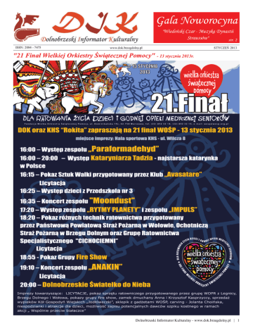 Gala Noworocyna "Wiedeński Czar- Muzyka Dynastii Straussów" str. 2 ISSN: 2084 - 7475 www.dok.brzegdolny.pl "21 Finał Wielkiej Orkiestry Świątecznej Pomocy" - 13 stycznia 2013r. STYCZEŃ 2013 Dolnobrzeski Informator Kulturalny - www.dok.brzegdolny.pl | 1 "Wiedeński Czar - Muzyka Dynastii Straussów" - 19 stycznia 2013r. 19 stycznia 2013r. godz. 18:00 Kompleks HotelowoSportowy "Rokita" Bezpłatne bilety do odbioru w sekretariacie DOK, ul. Kolejowa 29 Burmistrz Brzegu Dolnego oraz Dyrektor Dolnobrzeskiego Ośrodka Kultury zapraszają na GALĘ NOWOROCZNĄ "Wiedeński Czar - Muzyka Dynastii Straussów" w wykonaniu Orkiestry Symfonicznej Filharmonii Opolskiej pod batutą Bartosza Żurakowskiego W programie: Franz von Suppe Uwertura Ein Morgen, ein Mittag, ein Abend in Wien Johann Strauss II -Walc Opowieści lasku wiedeńskiego (Geschichten aus dem Wienerwald) op. 325 Eduard Strauss - Carmen Quadrille op. 134 Emil Waldteufel - Espana Waltz op. 236 Johann Strauss II - Diplomaten Polka Francaise op. 448 Johann Strauss II -Satanella Polka op. 124 Johann Strauss I - Cachucha Galopp op. 97 Eduard Strauss - Boccaccio Quadrille op. 180 Johann Strauss II - Fledermaus Quadrille op. 363 Emile Waldteufel - Walc Estudiantina op. 191 Johann Strauss II - Marsz hiszpański (Spanischer Marsch) op. 433 Johann Strauss II -Walc Róże południa (Rosen aus dem Suden) op. 388 Eduard Strauss-Alpenrose Polka Mazurka op. 127 Johann Strauss II - Walc Wiedeńska krew (Wiener Blut) op. 354 Johann Strauss II - Furioso Polka op. 260 Johann Strauss II - Liebesbotschaft Galopp Josef Strauss-Sport Polka op. 170 Johann Strauss - Walc Nad pięknym modrym Dunajem (An der schónen blauen Donau) op. 314 Johann Strauss - Radezky March Ferie z DOK szczegóły na www.dok.brzegdolny.pl 2 | Dolnobrzeski Informator Kulturalny - www.dok.brzegdolny.pl Koncert kolęd w wykonaniu sekcji muzycznej - 20 grudnia 2012r. W Galerii DOK odbył się Świąteczny Koncert, który instrumentalnie wprowadził zebraną publiczność w atmosferę świąt. Piękne kolędy i pastorałki popłynęły ze strun gitary i klawiszy pianina. Koncert przygotowała sekcja muzyczna DOK pod kierunkiem Pani Małgorzaty Wrzesińskiej i Pana Stanisława Korszlaka. Kiermasz ozdób świątecznych - 18 grudnia 2012r. J konaniem prac oraz efektownym wykorzystaniem naturalnych materiałów. Młodzież przekazała pięknego anioła na licytację podczas Wielkiej Orkiestry Świątecznej Pomocy. ak co roku w okresie przedświątecznym w Galerii DOK przy ul. Zwycięstwa odbył się kiermasz ozdób świątecznych i rękodzieła przygotowanego przez wychowanków Zespołu Placówek Resocjalizacyjnych w Brzegu Dolnym. Wśród wielu artystycznych tworzyw mogliśmy zobaczyć unikatowe ozdoby świąteczne, anioły, obrazy, gwiazdy betlejemskie czy kartki świąteczne. Uczniowie po raz kolejny zaskoczyli misternym wy- I Dolnobrzeski Festiwal Bożonarodzeniowy - 16 grudnia 2012r. O ryginalne stroiki, bombki, gwiazdki, aniołki, kartki i ozdoby świąteczne i wiele innych ciekawych wyrobów, które mogły stać się niebanalnym prezentem pod choinkę podczas I Dolnobrzeskiego Festiwalu Bożonarodzeniowego , organizowanego przez Powiatowy Zespół Szkół oraz Dolnobrzeski Ośrodek Kultury. Gości w atmosferę nadchodzących świąt wprowadził koncert kolęd i pastorałek wykonany przez dzieci i młodzież z sekcji wokalnej DOK , Chóru ‘Radość” i Chóru „Oremus”. Publicz- ność obejrzała jasełka w wykonaniu młodzieży PZS. Autorami świątecznych ozdób byli: Powiatowy Zespół Szkół, Środowiskowego Domu Samopomocy, Jolanta Choińska, Powiatowy Zespół Placówek Resocjalizacyjnych, Publiczne Gimnazjum nr 1, Stowarzyszenie Kobiet Aktywnych, Iwona Judzińska, Świetlica Naborów, Szkoła Podstawowa nr 1, Szkoła Podstawowa nr 6, Związek Emerytów i Rencistów. Dolnobrzeski Informator Kulturalny - www.dok.brzegdolny.pl | 3 Wieczór kolęd w DOK - 14 grudnia 2012r. B oże Narodzenie to Święto szczególnie ulubione przez dzieci. W sali widowiskowej DOK 14.12.2012r. o godz. 18:00 w pięknej świątecznej scenerii Dolnobrzeskiego Ośrodka Kultury odbył się koncert przy komplecie publiczności występujący w nim głównie młodzi albo bardzo młodzi artyści otrzymali gromkie brawa. Na scenie zaśpiewali kolędy uczestnicy sekcji wokalnej z DOK pod kierunkiem Małgorzaty Aleksander- Tęczy. 50 plus przy świecach i fotografiach - 12 grudnia 2012r. „Przy świecach i starych fotografiach” – pod takim hasłem w środę, 12 grudnia w Gołębniku przy ul. Kolejowej odbyło się pierwsze spotkanie w ramach dolnobrzeskiego klubu 50 plus. Klub powstał w tym roku i jego głównym celem jest aktywizacja oraz pomoc w zagospodarowaniu wolnego czasu dla osób, które zakończyły już okres aktywności zawodowej. Gościem specjalnym inauguracyjnego spotkania była pani Halina Żak, prezes Stowarzyszenia Pierwszych Osadników Ziemi Dolnobrzeskiej oraz pani Krystyna Lewandowska. Osoby, które ten grudniowy wieczór postanowiły spędzić w miłym gronie, mogły wysłuchać niezwykle ciekawych historii związanych z Brzegiem Dolnym i nie tylko. Zainteresowanie spotkaniem było dość spore. I Powiatowy Przegląd Teatrów Szkolnych - 5 grudnia 2012r. 5 Osoby po 50. roku życia niejednokrotnie udowodniły, że nadal chcą się rozwijać i to na wielu płaszczyznach, począwszy od aktywności fizycznej przez rozwijanie zainteresowań twórczych aż po naukę języków obcych. Następne spotkanie Klubu 50 Plus z cyklu „Zabawa słowem, poezja HAIKU – fotografowanie słowem otaczającej nas przyrody”, odbędzie się 23 stycznia 2013r. o godzinie 17:00. Gościem wieczoru będzie Anna Ejfler – przewodnicząca sekcji HAIKU Uniwersytetu Trzeciego Wieku UE we Wrocławiu. grudnia 2012r. w ramach obchodów Światowego Dnia Walki z AIDS, odbył się Powiatowy Przeglądu Sztuk Teatralnych o tematyce HIV/AIDS „Wiedza ratuje życie”. Projekt miał na celu uświadomienie młodym l