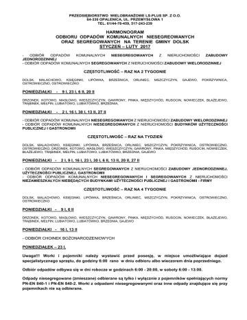 PRZEDSIĘBIORSTWO WIELOBRANŻOWE LS-PLUS SP. Z O.O. 64-330 OPALENICA, UL. PRZEMYSŁOWA 1 TEL. 61/44-78-459, 517-243-239 HARMONOGRAM ODBIORU ODPADÓW KOMUNALNYCH NIESEGREOWANYCH ORAZ SEGREGOWANYCH NA TERENIE GMINY DOLSK STYCZEŃ – LUTY 2017 ODBIÓR ODPADÓW KOMUNALNYCH NIESEGREGOWANYCH Z NIERUCHOMOŚCI ZABUDOWY JEDNORODZINNEJ - ODBIÓR ODPADÓW KOMUNALNYCH SEGREGOWANYCH Z NIERUCHOMOŚCI ZABUDOWY WIELORODZINNEJ CZĘSTOTLIWOŚĆ – RAZ NA 2 TYGODNIE DOLSK, MALACHOWO, KSIĘGINKI, OSTROWIECZNO, OSTROWIECZKO PONIEDZIAŁKI - LIPÓWKA, BRZEŚNICA, ORLINIEC, MSZCZYCZYN, GAJEWO, POKRZYWNICA, 9 I, 23 I, 6 II, 20 II DRZONEK, KOTOWO, MASŁOWO, WIESZCZYCZYN, GAWRONY, PINKA, MIĘDZYCHÓD, RUSOCIN, NOWIECZEK, BŁAŻEJEWO, TRĄBINEK, MEŁPIN, LUBIATOWO, LUBIATÓWKO, BRZEDNIA, PONIEDZIAŁKI - 2 I, 16 I, 30 I, 13 II, 27 II - ODBIÓR ODPADÓW KOMUNALNYCH NIESEGREGOWANYCH Z NIERUCHOMOŚCI ZABUDOWY WIELORODZINNEJ - ODBIÓR ODPADÓW KOMUNALNYCH NIESEGREGOWANYCH Z NIERUCHOMOŚCI BUDYNKÓW UŻYTECZNOŚCI PUBLICZNEJ I GASTRONOMII CZĘSTOTLIWOŚĆ – RAZ NA TYDZIEŃ DOLSK, MALACHOWO, KSIĘGINKI, LIPÓWKA, BRZEŚNICA, ORLINIEC, MSZCZYCZYN, POKRZYWNICA, OSTROWIECZNO, OSTROWIECZKO, DRZONEK, KOTOWO, MASŁOWO, WIESZCZYCZYN, GAWRONY, PINKA, MIĘDZYCHÓD, RUSOCIN, NOWIECZEK, BŁAŻEJEWO, TRĄBINEK, MEŁPIN, LUBIATOWO, LUBIATÓWKO, BRZEDNIA, GAJEWO PONIEDZIAŁKI - 2 I, 9 I, 16 I, 23 I, 30 I, 6 II, 13 II, 20 II, 27 II - ODBIÓR ODPADÓW KOMUNALNYCH SEGREGOWANYCH Z NIERUCHOMOŚCI ZABUDOWY JEDNORODZINNEJ, UŻYTECZNOŚCI PUBLICZNEJ, GASTRONOMII - ODBIÓR ODPADÓW KOMUNALNYCH NIESEGREGOWANYCH I SEGREGOWANYCH Z NIERUCHOMOŚCI NIEZAMIESZKAŁYCH NIEBĘDĄCYCH BUDYNKAMI UŻYTECZNOŚCI PUBLICZNEJ I GASTRONOMII - FIRMY CZĘSTOTLIWOŚĆ – RAZ NA 4 TYGODNIE DOLSK, MALACHOWO, KSIĘGINKI, LIPÓWKA, BRZEŚNICA, ORLINIEC, MSZCZYCZYN, POKRZYWNICA, OSTROWIECZNO, OSTROWIECZKO PONIEDZIAŁKI - 9 I, 6 II DRZONEK, KOTOWO, MASŁOWO, WIESZCZYCZYN, GAWRONY, PINKA, MIĘDZYCHÓD, RUSOCIN, NOWIECZEK, BŁAŻEJEWO, TRĄBINEK, MEŁPIN, LUBIATOWO, LUBIATÓWKO, BRZEDNIA, GAJEWO PONIEDZIAŁKI - 16 I, 13 II - ODBIÓR CHOINEK BOŻONARODZENIOWYCH PONIEDZIAŁEK – 23 I, Uwaga!!! Worki i pojemniki należy wystawić przed posesję, w miejsce umożliwiające dojazd specjalistycznego sprzętu, do godziny 6:00 rano w dniu odbioru albo wieczorem dnia poprzedniego. Odbiór odpadów odbywa się w dni robocze w godzinach 6:00 - 20:00, w soboty 6:00 - 13:00. Odpady niesegregowane (zmieszane) odbierane są tylko i wyłącznie z pojemników spełniających normy PN-EN 840-1 i PN-EN 840-2. Worki z odpadami niesegregowanymi oraz inne odpady znajdujące się przy pojemnikach nie są odbierane.