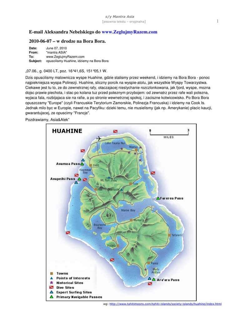 s/y Mantra Asia [pisownia tekstu – oryginalna] 1 E-mail Aleksandra Nebelskiego do www.ZeglujmyRazem.com 2010-06-07 – w drodze na Bora Bora. Date: From: To: Subject: June 07, 2010 "mantra ASIA" www.ZeglujmyRazem.com opuscilismy Huahine, idziemy na Bora Bora „07.06., g. 0400 LT, poz. 16°41,6S, 151°05,1 W. Dzis opuscilismy malownicza wyspe Huahine, gdzie stalismy przez weekend, i idziemy na Bora Bora - ponoc najpiekniejsza wyspa Polinezji. Huahine, sliczny porcik na wyspie-atolu, jak wszystkie Wyspy Towarzystwa. Ciekawe jest tu to, ze do zewnetrznej rafy, otaczajacej nieslychanie rozczlonkowana, jak fjord, wyspe, mozna dojsc prawie piechota, i stac po kolana tuz przed poteznym przybojem: od zewnatrz przez rafe wali potezna, wyjaca fala, rozbijajaca sie na rafie, a po stronie wewnetrznej spokoj, i zaciszne kotwicowisko. Po Bora Bora opuszczamy "Europe" (czyli Francuskie Terytorium Zamorskie, Polinezja Francuska) i idziemy na Cook Is. Jednak milo byc w Europie, nawet na Pacyfiku: dzieki temu, nie musielismy (jak np. Amerykanie) placic kaucji, gwarantujacej, ze opuscimy "Francje". Pozdrawiamy, Asia&Alek” HUAHINE wg: http://www.tahitimoons.com/tahiti-islands/society-islands/huahine/index.html s/y Mantra Asia 2 http://www.worldatlas.com/webimage/countrys/oceania/lgcolor/soccolor.htm
