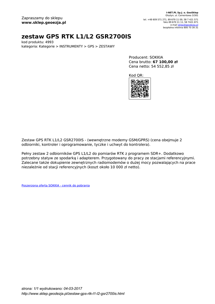 I-NET.PL Sp.J. o. GeoSklep Olsztyn, ul. Cementowa 3/301 Zapraszamy do sklepu www.sklep.geoezja.pl tel. +48 609 571 271, 89 670 11 00, 58 7 421 571 faks 89 670 11 11, 58 7421 871 e-mail [email protected] bezpłatna infolinia 800 70 30 31 zestaw GPS RTK L1/L2 GSR2700IS kod produktu: 4993 kategoria: Kategorie > INSTRUMENTY > GPS > ZESTAWY Producent: SOKKIA Cena brutto: 67 100,00 zł Cena netto: 54 552,85 zł Kod QR: Zestaw GPS RTK L1/L2 GSR2700IS - (wewnętrzne modemy GSM/GPRS) (cena obejmuje 2 odbiorniki, kontroler i oprogramowanie, tyczke i uchwyt do kontrolera). Pełny zestaw 2 odbiorników GPS L1/L2 do pomiarów RTK z programem SDR+. Dodatkowo potrzebny statyw ze spodarką i adapterem. Przygotowany do pracy ze stacjami referencyjnymi. Zalecane także dokupienie zewnętrznych radiomodemów o dużej mocy pozwalających na prace niezależnie od stacji referencyjnych (koszt około 10 000 zł netto). Poszerzona oferta SOKKIA - cennik do pobrania strona: 1/1 wydrukowano: 04-03-2017 http://www.sklep.geodezja.pl/zestaw-gps-rtk-l1-l2-gsr2700is.html
