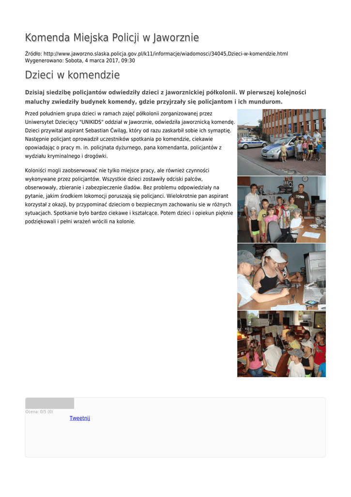 Komenda Miejska Policji w Jaworznie Źródło: http://www.jaworzno.slaska.policja.gov.pl/k11/informacje/wiadomosci/34045,Dzieci-w-komendzie.html Wygenerowano: Sobota, 4 marca 2017, 09:30 Dzieci w komendzie Dzisiaj siedzibę policjantów odwiedziły dzieci z jaworznickiej półkolonii. W pierwszej kolejności maluchy zwiedziły budynek komendy, gdzie przyjrzały się policjantom i ich mundurom. Przed południem grupa dzieci w ramach zajęć półkolonii zorganizowanej przez Uniwersytet Dziecięcy "UNIKIDS" oddział w Jaworznie, odwiedziła jaworznicką komendę. Dzieci przywitał aspirant Sebastian Ćwiląg, który od razu zaskarbił sobie ich symaptię. Następnie policjant oprowadził uczestników spotkania po komendzie, ciekawie opowiadając o pracy m. in. policjnata dyżurnego, pana komendanta, policjantów z wydziału kryminalnego i drogówki. Koloniści mogli zaobserwować nie tylko miejsce pracy, ale również czynności wykonywane przez policjantów. Wszystkie dzieci zostawiły odciski palców, obserwowały, zbieranie i zabezpieczenie śladów. Bez problemu odpowiedziały na pytanie, jakim środkiem lokomocji poruszają się policjanci. Wielokrotnie pan aspirant korzystał z okazji, by przypominać dzieciom o bezpiecznym zachowaniu sie w różnych sytuacjach. Spotkanie było bardzo ciekawe i kształcące. Potem dzieci i opiekun pięknie podziękowali i pełni wrażeń wrócili na kolonie. Ocena: 0/5 (0) Tweetnij