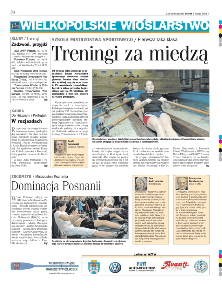 34 Głos Wielkopolski wtorek 7 lutego 2006 r. WIELKOPOLSKIE WIOSLARSTWO Zadzwoń, przyjdź AZS AWF Poznań, tel. 87-71557, tel./fax 87-71-390, przystań – Jezioro Maltańskie, hangar 8. Posnania Poznań, tel. 82-78000, tel./fax 0-61-82-06-101, przystań – ul. Wioślarska 72, tel. 87-70585. Klub Wioślarski 1904 Poznań, tel./fax 83-30-293 www.kw04.com Poznańskie Towarzystwo Wioślarzy Tryton, tel. 83-33-665, fax 83-34-287, www.tryton.najlepsi.net Towarzystwo Wioślarzy Polonia Poznań, tel./fax 87-73-630 Kaliskie Towarzystwo Wioślarskie, tel./fax 75-74-669, przystań – ul. Wał Piastowski 1, tel. 75leg 73-379 www.ktw.101.pl KADRA Do Hiszpanii i Portugalii W rozjazdach R ozpoczęły się przygotowania do nowego sezonu polskiej kadry narodowej. Na obóz do Hiszpanii pojechały między innymi: Ilona Mokronowska, Magdalena Kemnitz, Rafał Abrahamczyk i Artur Śledzik (wszyscy z Posnanii). Już spakował walizki Dominik Kubiak (również z Posnanii), który pojedzie na obóz do Portugalii. Z kolei Julia Michalska (Tryton) otrzymała zaproszenie leg na obóz FISA. SZKOŁA MISTRZOSTWA SPORTOWEGO / Pierwsza taka klasa Treningi za miedzą Od nowego roku szkolnego w poznańskiej Szkole Mistrzostwa Sportowego utworzona została pierwsza licealna klasa wioślarska, w której uczy się oraz trenuje 15 zawodniczek i zawodników. Łącznie w szkole przy ulicy Cegielskiego uczy się 25 wioślarzy, ale dziesięcioro z nich jest dopiero na etapie gimnazjum. Klasa sportowa umożliwia powiązanie nauki z treningiem. Każdego dnia (poza niedzielą) już od godziny 7.30 15-osobowa grupa pod kierunkiem trenera Przemysława Abrahamczyka odbywa półtoragodzinny poranny trening. O godzinie 9.40 rozpoczynają się lekcje w szkole, które trwają zwykle do godziny 15, a o godzinie 15.40 nadchodzi czas na drugi trening. Poznaniakom i młodzieDawid Grabowski zawodnik Posnanii Początkowo było nam wszystkim bardzo ciężko i fizycznie dostaliśmy porządnie w kość, Dwa treningi dziennie to było dla nas zupełnie coś nowego. 2X PAWEŁ MIECZNIK KLUBY / Treningi Uczniowie klasy sportowej Szkoły Mistrzostwa Sportowego korzystają z obiektów treningowych Posnanii i tam wiosłują w basenie, zmagają się z ergometrem oraz ćwiczą w skromnej siłowni. ży mieszkającej w internacie jest łatwiej, ale chyba najgorzej ma mieszkający w Kostrzynie Arek Adamski. Aby zdążyć na poranny trening musi zerwać się z łóżka już po piątej rano, wychodzi godz. 6 by zdążyć na autobus. ERGOMETR / Mistrzostwa Poznania Dominacja Posnanii sali Posnanii odbyły się XI Otwarte Mistrzostwa Poznania na Egrometrze Wioślarskim. Zawody zdominowali gospodarze, którzy wygrali wszystkie konkurencje poza jedną – wśród seniorów triumfował Michał Płotkowiak (KW-04). A to zwycięzcy pozostałych kategorii: dziewczynki – Marta Maciejewska, chłopcy – Wiktor Szymański, juniorki – Aleksandra Deierling, juniorzy – Dawid Grabowski, seniorki – Katarzyna Sammler, Seniorki wagi lekkiej – Iwona Buda, seniorzy wagi lekkiej – Piotr leg Abrahmaczyk. KRYSTIAN SZRAMA W Na zdjęciu, na pierwszym planie Angelika Grabowska z Posnanii, która jednak tego startu w kategorii dziewcząt nie może zaliczyć do najbardziej udanych. Wraca do domu około godziny 20. A trzeba jeszcze znaleźć czas na odrobienie lekcji i naukę. W grupie „pierwszaków” trenera Abrahamczyka są między innymi tak obiecujący zawodnicy jak: Michał Ratajczak z KW-04, Ewa Andrzejewska Przemysław Abrahamczyk dyrektor SMS trener w SMS Poznańskie wioślarstwo jest bardzo silne, działa tutaj przecież pięć klubów więc powołanie klasy sportowej o takim profilu było na pewno słusznym pociągnięciem. Chociaż wcale nie było łatwo przekonać do tego władze w Warszawie. Najważniejszy jest jednak efekt i od września działa już taka klasa. A że to słuszna droga pokazały już przykłady innych dyscyplin sportowych jak choćby gimnastyki sportowej, na kanwie której powstała Szkoła Mistrzostwa Sportowego czy pływania z takimi postaciami jak Artur Wojdat i Rafał Szukała. Najważniejszą rolą szkoły jest pogodzenie nauki ze sportem. partnerzy WZTW www.wioslarstwo.poznan.pl Dawid Grabowski z Posnanii, Marta Wojtkowiak z KW-04 czy Daria Filary z AZS AWF Poznań. Trener twierdzi, że to bardzo obiecująca grupa, która przy rzetelnej pracy będzie mogła w przyleg szłości wiele zwojować. Trenujemy sześć razy w tygodniu po trzy godziny czyli około 18 godzin, a dotychczas nikt z nich nie wykonywał większej pracy niż 7-8 godzin tygodniowo. W normalnym trybie nigdy bym nie zebrał takiej grupy w jednym miejscu na dwóch treningach dziennie. Poza tym szkoła znajduje się bardzo blisko przystani nad Wartą i młodzież nie musi korzystać z żadnych środków transportu miejskiego przechodząc tylko przez park. Gdy zaczniemy pływać na Jeziorze Maltańskim będą mieli trochę dalej, ale i tak nie są to porażające odległości.
