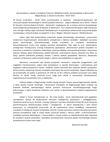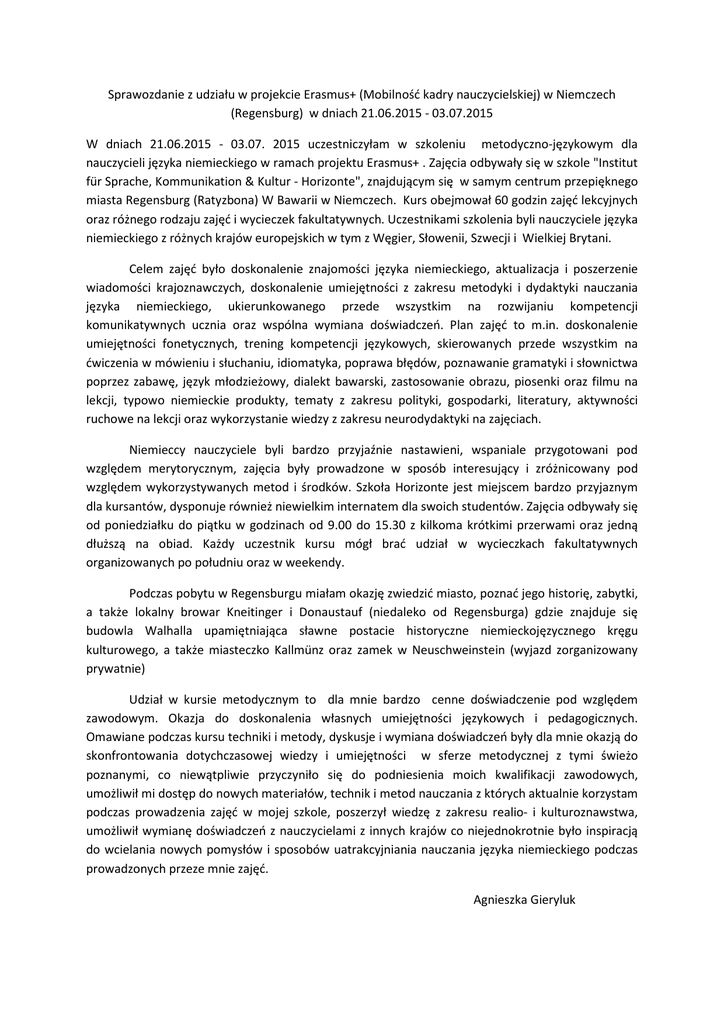 Sprawozdanie z udziału w projekcie Erasmus+ (Mobilność kadry nauczycielskiej) w Niemczech (Regensburg) w dniach 21.06.2015 - 03.07.2015 W dniach 21.06.2015 - 03.07. 2015 uczestniczyłam w szkoleniu metodyczno-językowym dla nauczycieli języka niemieckiego w ramach projektu Erasmus+ . Zajęcia odbywały się w szkole "Institut für Sprache, Kommunikation & Kultur - Horizonte", znajdującym się w samym centrum przepięknego miasta Regensburg (Ratyzbona) W Bawarii w Niemczech. Kurs obejmował 60 godzin zajęć lekcyjnych oraz różnego rodzaju zajęć i wycieczek fakultatywnych. Uczestnikami szkolenia byli nauczyciele języka niemieckiego z różnych krajów europejskich w tym z Węgier, Słowenii, Szwecji i Wielkiej Brytani. Celem zajęć było doskonalenie znajomości języka niemieckiego, aktualizacja i poszerzenie wiadomości krajoznawczych, doskonalenie umiejętności z zakresu metodyki i dydaktyki nauczania języka niemieckiego, ukierunkowanego przede wszystkim na rozwijaniu kompetencji komunikatywnych ucznia oraz wspólna wymiana doświadczeń. Plan zajęć to m.in. doskonalenie umiejętności fonetycznych, trening kompetencji językowych, skierowanych przede wszystkim na ćwiczenia w mówieniu i słuchaniu, idiomatyka, poprawa błędów, poznawanie gramatyki i słownictwa poprzez zabawę, język młodzieżowy, dialekt bawarski, zastosowanie obrazu, piosenki oraz filmu na lekcji, typowo niemieckie produkty, tematy z zakresu polityki, gospodarki, literatury, aktywności ruchowe na lekcji oraz wykorzystanie wiedzy z zakresu neurodydaktyki na zajęciach. Niemieccy nauczyciele byli bardzo przyjaźnie nastawieni, wspaniale przygotowani pod względem merytorycznym, zajęcia były prowadzone w sposób interesujący i zróżnicowany pod względem wykorzystywanych metod i środków. Szkoła Horizonte jest miejscem bardzo przyjaznym dla kursantów, dysponuje również niewielkim internatem dla swoich studentów. Zajęcia odbywały się od poniedziałku do piątku w godzinach od 9.00 do 15.30 z kilkoma krótkimi przerwami oraz jedną dłuższą na obiad. Każdy uczestnik kursu mógł brać udział w wycieczkach fakultatywnych organizowanych po południu oraz w weekendy. Podczas pobytu w Regensburgu miałam okazję zwiedzić miasto, poznać jego historię, zabytki, a także lokalny browar Kneitinger i Donaustauf (niedaleko od Regensburga) gdzie znajduje się budowla Walhalla upamiętniająca sławne postacie historyczne niemieckojęzycznego kręgu kulturowego, a także miasteczko Kallmünz oraz zamek w Neuschweinstein (wyjazd zorganizowany prywatnie) Udział w kursie metodycznym to dla mnie bardzo cenne doświadczenie pod względem zawodowym. Okazja do doskonalenia własnych umiejętności językowych i pedagogicznych. Omawiane podczas kursu techniki i metody, dyskusje i wymiana doświadczeń były dla mnie okazją do skonfrontowania dotychczasowej wiedzy i umiejętności w sferze metodycznej z tymi świeżo poznanymi, co niewątpliwie przyczyniło się do podniesienia moich kwalifikacji zawodowych, umożliwił mi dostęp do nowych materiałów, technik i metod nauczania z których aktualnie korzystam podczas prowadzenia zajęć w mojej szkole, poszerzył wiedzę z zakresu realio- i kulturoznawstwa, umożliwił wymianę doświadczeń z nauczycielami z innych krajów co niejednokrotnie było inspiracją do wcielania nowych pomysłów i sposobów uatrakcyjniania nauczania języka niemieckiego podczas prowadzonych przeze mnie zajęć. Agnieszka Gieryluk