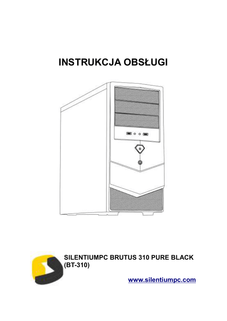 INSTRUKCJA OBSŁUGI SILENTIUMPC BRUTUS 310 PURE BLACK (BT-310) www.silentiumpc.com SilentiumPC Brutus 310 to kompaktowa obudowa zgodna ze standardem ATX/mATX, z miejscem na zasilacz umiejscowionym na spodzie, co dodatkowo poprawia wentylację zamontowanych komponentów. Obudowa kompatybilna jest z schładzaczami CPU o wysokości do 155mm oraz z kartami graficznymi o długości do maksimum 310mm (294mm w przypadku kart z zamontowanym systemem chłodzenia wystającym poza obrys PCB karty). Do komfortowego podłączenia płyty głównej zalecane jest stosowanie zasilaczy z wiązką zasilającą 24pin o długości nie mniejszej niŜ 45cm oraz wiązką zasilającą 4/8pin o długości nie mniejszej niŜ 50cm. Zawartość pudełka: • obudowa Brutus 310 Pure Black • opakowanie z akcesoriami do montaŜu Dane techniczne: • wymiary: 435x482x182mm • standard: mATX/ATX • waga netto: 4.50 KG • ilość zatok: • zewnętrzne: • 3 x 5,25” • wewnętrzne: • 5 x 3,5” • miejsca na karty rozszerzeń: 7 • maksymalna długość karty graficznej: 310mm • maksymalna wysokość chłodzenia CPU: 155mm • system chłodzenia (jeden wentylator w komplecie): przód: 1 x wentylator 120mm (opcja) tył: 1 x wentylator 120mm (1200 obr./min. ~15 dB/A) • spód: 1x wentylator 120mm (opcja) • góra: 1x wentylator 120mm (opcja) porty na panelu przednim: • 2 x USB 2.0 • 1 x Słuchawki (HD audio) • 1 x Mikrofon (HD audio) zasilacz (standard ATX PS2): brak w komplecie • • • • Instalacja płyty głównej: • odkręć szybko-śrubki i zdejmij boczny panel obudowy • wkręć dystanse (znajdują się w opakowaniu z akcesoriami) zgodnie z otworami montaŜowymi na płycie głównej • wciśnij w tylni otwór maskownicę złączy płyty głównej (dostarczana z płytą główną) • przykręć płytę główną śrubami • upewnij się Ŝe płyta jest dobrze przymocowana Instalacja napędu zewnętrznego: • odkręć szybko-śrubki i zdejmij oba panele boczne obudowy • złap przedni panel za specjalny otwór u spodu i pociągnij do siebie • za pomocą krzyŜakowego śrubokrętu wyłam zaślepkę • wsuń napęd w zatokę 5,25” • przykręć napęd za pomocą załączonych śrubek Instalacja napędu HDD 3,5” • • • odkręć szybko-śrubki i zdejmij oba panele boczne obudowy wsuń napęd HDD do wewnętrznej zatoki 3,5” przykręć napęd za pomocą załączonych śrubek Instalacja kart PCI • za pomocą krzyŜakowego śrubokrętu wyłam zaślepkę PCI • ze szczególną ostroŜnością zamontuj kartę • dokręć kartę śrubką Instalacja zasilacza • umieść zasilacz w specjalnie przeznaczonym dla niego miejscu na spodzie obudowy • przykręć zasilacz 4 śrubami • podłącz komponenty, zwróć uwagę na to, Ŝe obudowa posiada zaciski na kable pozwalając na ich odpowiednie ułoŜenie, nie uŜywane kable moŜna ukryć za klatką na napędy 3,5” Podłączenie POWER/RESET/AUDIO/USB • podłącz Power SW, Reset SW, oraz złącze monitorujące pracę HDD do odpowiednich gniazd na płycie głównej • podłącz złącze USB oraz przewody HD audio do odpowiednich gniazd na płycie głównej • do poprawnej instalacji uŜyj instrukcji obsługi płyty głównej MANUAL SILENTIUMPC BRUTUS 310 PURE BLACK (BT-310) www.silentiumpc.com SilentiumPC Brutus 310 is a compact ATX/mATX computer case with PSU space located on the bottom. This solution provides better cooling for PSU and other components. This case is compatible with CPU coolers with maximum height of 155mm and graphic cards with maximum lenght of 310mm (294mm when graphic card's cooling is overlapping it's PCB). For maximum compatibility it is recommended to use power supplies with at least 45cm long main power 24pin connector cord and at least 50cm long 4/8pin power cord. In the box: • brutus 310 Pure Black case • accessories bag Technical data: • case dimensions: 435x482x182mm • standard: mATX/ATX • nett weight: 4.50 KG • drive bays: • external: • 3 x 5,25” • internal: • 5 x 3,5” • expansion slots: 7 • maximum graphics card lenght: 310mm • maximum CPU cooler height: 155mm • cooling (one fan included): • front: 1 x 120mm fan(option) • rear: 1 x 120mm fan (1200 rpm ~15 dB/A) • • • bottom: 1x 120mm fan (option) • top: 1x 120mm fan (option) front panel I/O ports: • 2 x USB 2.0 • 1 x Headphones(HD audio) • 1 x Mic(HD audio) PSU(ATX PS2 standard): not included Motherboard installation: • open side panel using thumbscrews • refer to the motherboard holes for standoff placement. Put brass standoffs in place (brass standoffs in the accessory bag) • put I/O shield in the back of the case (it is delivered with the motherboard) • align motherboard with standoffs and mount to case • check if motherboard is mounted correctly External drive installation: • open both side panels using the thumbscrews • remove front panel using the hole on the bottom of bezel • use philips screwdriver to remove drive shield • place drive in the drive bay • use screws to attach drive 3,5” HDD installation: • open both side panels using the thumbscrews • place HDD in internal 3,5” drive bay • use screws to secure it in place PCI slot arrangement • • • use philips screwdriver to remove slot cover with extra care insert the PCI Express/AGP/PCI card into the expansion slot secure it with a screw PSU installation • insert power supply accordingly inside the computer case • use 4 screws to fix the power supply on the rear side • connect components. Use the cord clamps to keep cables in order. Notice the unused cables can be stashed behind the 3'5” HDD cage Front panel leads and wires • plug the Power SW lead, Reset SW lead and hard drive status lead into the corresponding sockets on the motherboard • plug in the USB and HD audio cables to the corresponding sockets on the motherboard • please refer to your motherboard manual for proper installation