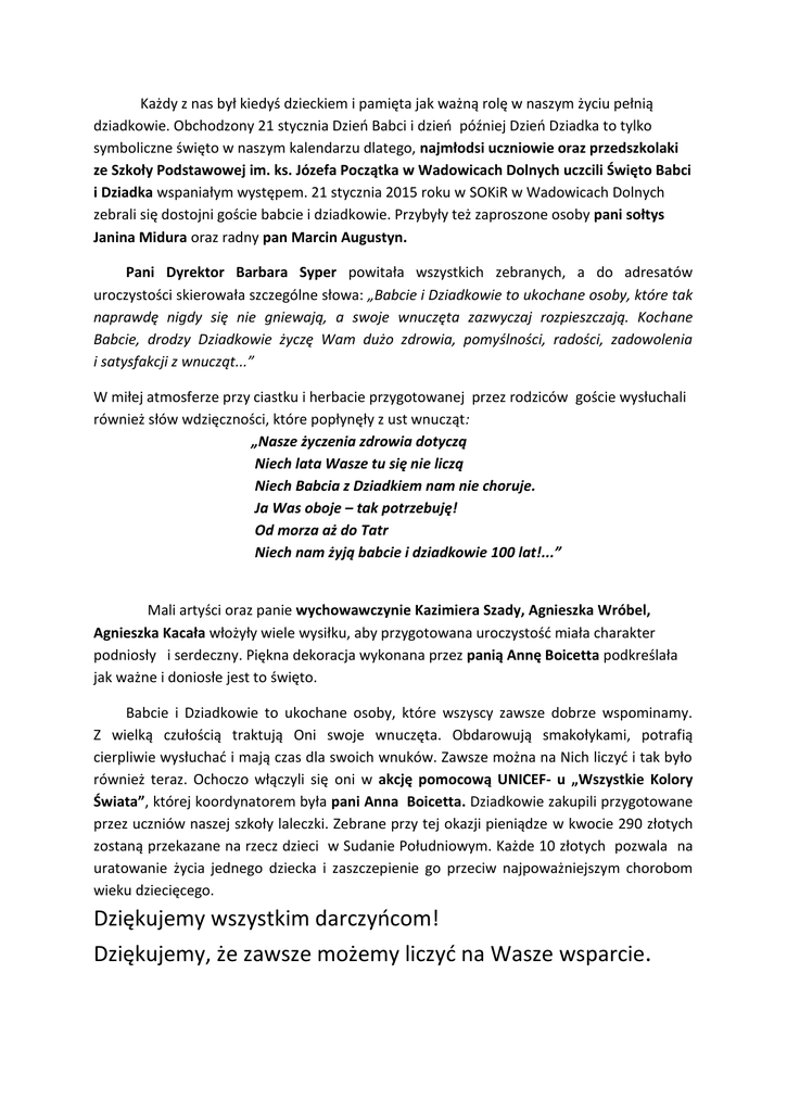 Każdy z nas był kiedyś dzieckiem i pamięta jak ważną rolę w naszym życiu pełnią dziadkowie. Obchodzony 21 stycznia Dzień Babci i dzień później Dzień Dziadka to tylko symboliczne święto w naszym kalendarzu dlatego, najmłodsi uczniowie oraz przedszkolaki ze Szkoły Podstawowej im. ks. Józefa Początka w Wadowicach Dolnych uczcili Święto Babci i Dziadka wspaniałym występem. 21 stycznia 2015 roku w SOKiR w Wadowicach Dolnych zebrali się dostojni goście babcie i dziadkowie. Przybyły też zaproszone osoby pani sołtys Janina Midura oraz radny pan Marcin Augustyn. Pani Dyrektor Barbara Syper powitała wszystkich zebranych, a do adresatów uroczystości skierowała szczególne słowa: „Babcie i Dziadkowie to ukochane osoby, które tak naprawdę nigdy się nie gniewają, a swoje wnuczęta zazwyczaj rozpieszczają. Kochane Babcie, drodzy Dziadkowie życzę Wam dużo zdrowia, pomyślności, radości, zadowolenia i satysfakcji z wnucząt...” W miłej atmosferze przy ciastku i herbacie przygotowanej przez rodziców goście wysłuchali również słów wdzięczności, które popłynęły z ust wnucząt: „Nasze życzenia zdrowia dotyczą Niech lata Wasze tu się nie liczą Niech Babcia z Dziadkiem nam nie choruje. Ja Was oboje – tak potrzebuję! Od morza aż do Tatr Niech nam żyją babcie i dziadkowie 100 lat!...” Mali artyści oraz panie wychowawczynie Kazimiera Szady, Agnieszka Wróbel, Agnieszka Kacała włożyły wiele wysiłku, aby przygotowana uroczystość miała charakter podniosły i serdeczny. Piękna dekoracja wykonana przez panią Annę Boicetta podkreślała jak ważne i doniosłe jest to święto. Babcie i Dziadkowie to ukochane osoby, które wszyscy zawsze dobrze wspominamy. Z wielką czułością traktują Oni swoje wnuczęta. Obdarowują smakołykami, potrafią cierpliwie wysłuchać i mają czas dla swoich wnuków. Zawsze można na Nich liczyć i tak było również teraz. Ochoczo włączyli się oni w akcję pomocową UNICEF- u „Wszystkie Kolory Świata”, której koordynatorem była pani Anna Boicetta. Dziadkowie zakupili przygotowane przez uczniów naszej szkoły laleczki. Zebrane przy tej okazji pieniądze w kwocie 290 złotych zostaną przekazane na rzecz dzieci w Sudanie Południowym. Każde 10 złotych pozwala na uratowanie życia jednego dziecka i zaszczepienie go przeciw najpoważniejszym chorobom wieku dziecięcego. Dziękujemy wszystkim darczyńcom! Dziękujemy, że zawsze możemy liczyć na Wasze wsparcie.