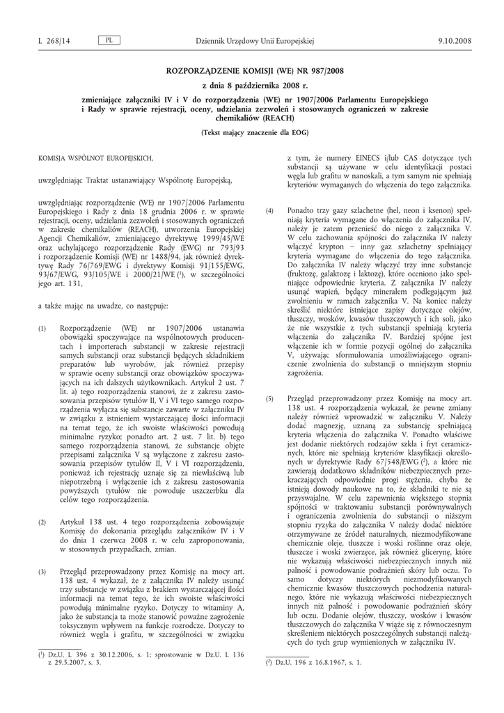 L 268/14 PL Dziennik Urzędowy Unii Europejskiej 9.10.2008 ROZPORZĄDZENIE KOMISJI (WE) NR 987/2008 z dnia 8 października 2008 r. zmieniające załączniki IV i V do rozporządzenia (WE) nr 1907/2006 Parlamentu Europejskiego i Rady w sprawie rejestracji, oceny, udzielania zezwoleń i stosowanych ograniczeń w zakresie chemikaliów (REACH) (Tekst mający znaczenie dla EOG) z tym, że numery EINECS i/lub CAS dotyczące tych substancji są używane w celu identyfikacji postaci węgla lub grafitu w nanoskali, a tym samym nie spełniają kryteriów wymaganych do włączenia do tego załącznika. KOMISJA WSPÓLNOT EUROPEJSKICH, uwzględniając Traktat ustanawiający Wspólnotę Europejską, uwzględniając rozporządzenie (WE) nr 1907/2006 Parlamentu Europejskiego i Rady z dnia 18 grudnia 2006 r. w sprawie rejestracji, oceny, udzielania zezwoleń i stosowanych ograniczeń w zakresie chemikaliów (REACH), utworzenia Europejskiej Agencji Chemikaliów, zmieniającego dyrektywę 1999/45/WE oraz uchylającego rozporządzenie Rady (EWG) nr 793/93 i rozporządzenie Komisji (WE) nr 1488/94, jak również dyrek tywę Rady 76/769/EWG i dyrektywy Komisji 91/155/EWG, 93/67/EWG, 93/105/WE i 2000/21/WE (1), w szczególności jego art. 131, (4) Ponadto trzy gazy szlachetne (hel, neon i ksenon) speł niają kryteria wymagane do włączenia do załącznika IV, należy je zatem przenieść do niego z załącznika V. W celu zachowania spójności do załącznika IV należy włączyć krypton – inny gaz szlachetny spełniający kryteria wymagane do włączenia do tego załącznika. Do załącznika IV należy włączyć trzy inne substancje (fruktozę, galaktozę i laktozę), które oceniono jako speł niające odpowiednie kryteria. Z załącznika IV należy usunąć wapień, będący minerałem podlegającym już zwolnieniu w ramach załącznika V. Na koniec należy skreślić niektóre istniejące zapisy dotyczące olejów, tłuszczy, wosków, kwasów tłuszczowych i ich soli, jako że nie wszystkie z tych substancji spełniają kryteria włączenia do załącznika IV. Bardziej spójne jest włączenie ich w formie pozycji ogólnej do załącznika V, używając sformułowania umożliwiającego ograni czenie zwolnienia do substancji o mniejszym stopniu zagrożenia. (5) Przegląd przeprowadzony przez Komisję na mocy art. 138 ust. 4 rozporządzenia wykazał, że pewne zmiany należy również wprowadzić w załączniku V. Należy dodać magnezję, uznaną za substancję spełniającą kryteria włączenia do załącznika V. Ponadto właściwe jest dodanie niektórych rodzajów szkła i fryt ceramicz nych, które nie spełniają kryteriów klasyfikacji określo nych w dyrektywie Rady 67/548/EWG (2), a które nie zawierają dodatkowo składników niebezpiecznych prze kraczających odpowiednie progi stężenia, chyba że istnieją dowody naukowe na to, że składniki te nie są przyswajalne. W celu zapewnienia większego stopnia spójności w traktowaniu substancji porównywalnych i ograniczenia zwolnienia do substancji o niższym stopniu ryzyka do załącznika V należy dodać niektóre otrzymywane ze źródeł naturalnych, niezmodyfikowane chemicznie oleje, tłuszcze i woski roślinne oraz oleje, tłuszcze i woski zwierzęce, jak również glicerynę, które nie wykazują właściwości niebezpiecznych innych niż palność i powodowanie podrażnień skóry lub oczu. To samo dotyczy niektórych niezmodyfikowanych chemicznie kwasów tłuszczowych pochodzenia natural nego, które nie wykazują właściwości niebezpiecznych innych niż palność i powodowanie podrażnień skóry lub oczu. Dodanie olejów, tłuszczy, wosków i kwasów tłuszczowych do załącznika V wiąże się z równoczesnym skreśleniem niektórych poszczególnych substancji należą cych do tych grup wymienionych w załączniku IV. a także mając na uwadze, co następuje: (1) Rozporządzenie (WE) nr 1907/2006 ustanawia obowiązki spoczywające na wspólnotowych producen tach i importerach substancji w zakresie rejestracji samych substancji oraz substancji będących składnikiem preparatów lub wyrobów, jak również przepisy w sprawie oceny substancji oraz obowiązków spoczywa jących na ich dalszych użytkownikach. Artykuł 2 ust. 7 lit. a) tego rozporządzenia stanowi, że z zakresu zasto sowania przepisów tytułów II, V i VI tego samego rozpo rządzenia wyłącza się substancje zawarte w załączniku IV w związku z istnieniem wystarczającej ilości informacji na temat tego, że ich swoiste właściwości powodują minimalne ryzyko; ponadto art. 2 ust. 7 lit. b) tego samego rozporządzenia stanowi, że substancje objęte przepisami załącznika V są wyłączone z zakresu zasto sowania przepisów tytułów II, V i VI rozporządzenia, ponieważ ich rejestrację uznaje się za niewłaściwą lub niepotrzebną i wyłączenie ich z zakresu zastosowania powyższych tytułów nie powoduje uszczerbku dla celów tego rozporządzenia. (2) Artykuł 138 ust. 4 tego rozporządzenia zobowiązuje Komisję do dokonania przeglądu załączników IV i V do dnia 1 czerwca 2008 r. w celu zaproponowania, w stosownych przypadkach, zmian. (3) Przegląd przeprowadzony przez Komisję na mocy art. 138 ust. 4 wykazał, że z załącznika IV należy usunąć trzy substancje w związku z brakiem wystarczającej ilości informacji na temat tego, że ich swoiste właściwości powodują minimalne ryzyko. Dotyczy to witaminy A, jako że substancja ta może stanowić poważne zagrożenie toksycznym wpływem na funkcje rozrodcze. Dotyczy to również węgla i grafitu, w szczególności w związku (1) Dz.U. L 396 z 30.12.2006, s. 1; sprostowanie w Dz.U. L 136 z 29.5.2007, s. 3. (2) Dz.U. 196 z 16.8.1967, s. 1. 9.10.2008 (6) (7) PL Dziennik Urzędowy Unii Europejskiej Zmiany przewidziane w niniejszym rozporządzeniu, a w szczególności zmiany dotyczące kompostu i biogazu, pozostają bez uszczerbku dla przepisów wspólnotowych w odniesieniu do odpadów. Środki prz