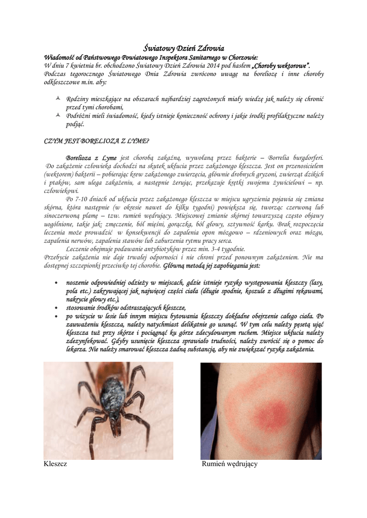 Światowy Dzień Zdrowia Wiadomość od Państwowego Powiatowego Inspektora Sanitarnego w Chorzowie: W dniu 7 kwietnia br. obchodzono Światowy Dzień Zdrowia 2014 pod hasłem „Choroby wektorowe”. Podczas tegorocznego Światowego Dnia Zdrowia zwrócono uwagę na boreliozę i inne choroby odkleszczowe m.in. aby: Rodziny mieszkające na obszarach najbardziej zagrożonych miały wiedzę jak należy się chronić przed tymi chorobami, Podróżni mieli świadomość, kiedy istnieje konieczność ochrony i jakie środki profilaktyczne należy podjąć. CZYM JEST BORELIOZA Z LYME? Borelioza z Lyme jest chorobą zakaźną, wywołaną przez bakterie – Borrelia burgdorferi. Do zakażenie człowieka dochodzi na skutek ukłucia przez zakażonego kleszcza. Jest on przenosicielem (wektorem) bakterii – pobierając krew zakażonego zwierzęcia, głównie drobnych gryzoni, zwierząt dzikich i ptaków, sam ulega zakażeniu, a następnie żerując, przekazuje krętki swojemu żywicielowi – np. człowiekowi. Po 7-10 dniach od ukłucia przez zakażonego kleszcza w miejscu ugryzienia pojawia się zmiana skórna, która następnie (w okresie nawet do kilku tygodni) powiększa się, tworząc czerwoną lub sinoczerwoną plamę – tzw. rumień wędrujący. Miejscowej zmianie skórnej towarzyszą często objawy uogólnione, takie jak: zmęczenie, ból mięśni, gorączka, ból głowy, sztywność karku. Brak rozpoczęcia leczenia może prowadzić w konsekwencji do zapalenia opon mózgowo – rdzeniowych oraz mózgu, zapalenia nerwów, zapalenia stawów lub zaburzenia rytmu pracy serca. Leczenie obejmuje podawanie antybiotyków przez min. 3-4 tygodnie. Przebycie zakażenia nie daje trwałej odporności i nie chroni przed ponownym zakażeniem. Nie ma dostępnej szczepionki przeciwko tej chorobie. Główną metodą jej zapobiegania jest: noszenie odpowiedniej odzieży w miejscach, gdzie istnieje ryzyko występowania kleszczy (lasy, pola etc.) zakrywającej jak najwięcej części ciała (długie spodnie, koszule z długimi rękawami, nakrycie głowy etc.), stosowanie środków odstraszających kleszcze, po wizycie w lesie lub innym miejscu bytowania kleszczy dokładne obejrzenie całego ciała. Po zauważeniu kleszcza, należy natychmiast delikatnie go usunąć. W tym celu należy pęsetą ująć kleszcza tuż przy skórze i pociągnąć ku górze zdecydowanym ruchem. Miejsce ukłucia należy zdezynfekować. Gdyby usunięcie kleszcza sprawiało trudności, należy zwrócić się o pomoc do lekarza. Nie należy smarować kleszcza żadną substancją, aby nie zwiększać ryzyka zakażenia. Kleszcz Rumień wędrujący CZYM JEST ODKLESZCZOWE ZAPALENIE MÓZGU? Kleszczowe zapalenie mózgu (KZM) jest ciężką, ostrą chorobą zakaźną ośrodkowego układu nerwowego, która może prowadzić do zgonu lub trwałych następstw neurologicznych u 35-58% pacjentów. Dlaczego KZM jest tak niebezpieczne? Przenoszony przez kleszcze wirus KZM atakuje układ nerwowy (mózg lub rdzeń kręgowy). Choroba może mieć ciężki przebieg i prowadzić do trwałych następstw w postaci porażenia nerwów, niedowładów kończyn, zaburzeń koncentracji lub depresji, a nawet zgonu. Jak leczy się KZM? Współczesna medycyna nie dysponuje lekiem przeciw wirusowi KZM. W czasie leczenia możliwe jest tylko łagodzenie objawów np. obniżanie gorączki, łagodzenie bólu itp. Powikłania wymagają długotrwałej rehabilitacji. Jak można zarazić się KZM? Wirus KZM przenoszony jest przez kleszcze w czasie ukłucia i żerowania. Można zarazić się nim także spożywając niepasteryzowane produkty mleczne pochodzące od zakażonych zwierząt np.: mleko lub ser kozi lub owczy. Czy KZM zagraża nam w ciągu całego roku? Tak. Częstość zachorowań wynika z sezonowej aktywności kleszczy, która może rozpocząć się już w lutym i trwać nieprzerwanie do końca listopada. Najwięcej zachorowań zgłasza się latem i jesienią. Kto jest narażony na KZM? Każdy, kto aktywnie spędza czas w plenerze w miejscach bytowania kleszczy. Zagrożone są dzieci, młodzież, osoby dorosłe i starsze mieszkające w tych regionach oraz przebywające w nich czasowo np. podczas wakacji lub wyjazdów weekendowych. Ryzyko zachorowania na KZM zależy bowiem od stylu życia i aktywności, a nie od wieku. Jak można chronić się przed KZM? Obecnie szczepienia są uznawane za najskuteczniejsze zabezpieczenie przed kleszczowym zapaleniem mózgu i jego następstwami. Są zalecane przez Głównego Inspektora Sanitarnego dla osób na stałe lub czasowo przebywających na terenach nasilonego występowania tej choroby. Zapobieganie poprzez stosowanie preparatów odstraszających owady (repelentów) i/lub noszenie specjalnej odzieży ochronnej nie okazały się wystarczająco skuteczne. Jak działa szczepienie przeciw KZM? Prawidłowo przeprowadzone szczepienie wywołuje w organizmie osoby zaszczepionej produkcję swoistych przeciwciał, przeciw wirusowi KZM. Natychmiast po ukłuciu przez zakażonego kleszcza, przeciwciała te zwalczają zakażenie. Kiedy najlepiej rozpocząć szczepienia przeciw KZM? Szczepienie można rozpocząć w dowolnym czasie. Najlepiej rozpocząć je zimą lub wczesną wiosną, by zapewnić odporność przed początkiem sezonu żerowania kleszczy na wiosnę. Dla osób wyjeżdżających na wakacje lub tych, którzy późno zdecydowali się na szczepienie, lekarz może zalecić przyspieszony schemat szczepienia zaczynający się, na co najmniej 3 tygodnie przed wyjazdem lub wakacjami. By uzyskać pełną, długotrwałą ochronę szczepienie podstawowe należy zakończyć przyjmując trzecią dawkę w czasie tego samego sezonu aktywności kleszczy lub najpóźniej przed rozpoczęciem następnego sezonu. Jak długo trwa ochrona po szczepieniu? Cykl szczepienia podstawowego zabezpiecza przed zachorowaniem na okres 3 lat. Po tym czasie zalecane są szczepienia przypominające podawane w odstępach kilkuletnich (3 do 5 lat) w zależności od wi