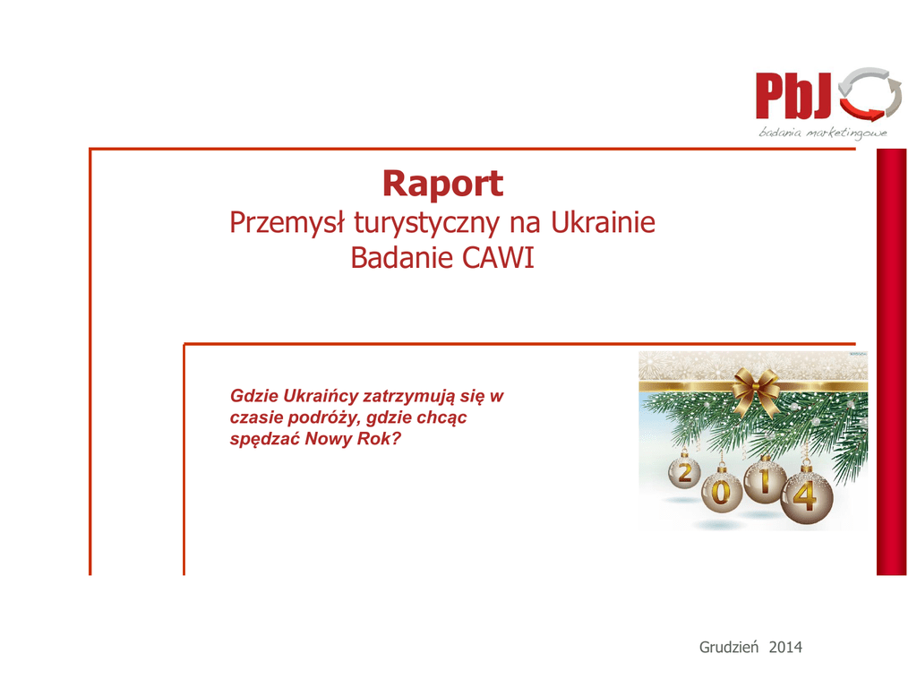 Raport Przemysł turystyczny na Ukrainie Badanie CAWI Gdzie Ukraińcy zatrzymują się w czasie podróży, gdzie chcąc spędzać Nowy Rok? Grudzień 2014 Wnioski Większość ukraińskich respondentów (85%) stwierdziła, że podróżuje raz w roku i częściej. Trzy czwarte respondentów podróżujących (71%) deklaruje, że najczęściej podróżuje po Ukrainie. Za granice jeździ najczęściej 29% badanych. Dwie trzecie respondentów (62%) twierdzi, że głównym powodem ich podróży jest turystyka. Na drugim miejscu wymieniane są podróże służbowe – tak odpowiada 27%. Podczas wycieczek po Ukrainie dwie trzecie respondentów (65%) preferuje zatrzymanie się w mieszkaniu do wynajęcia. Jest to zdecydowanie najbardziej popularny sposób podróżowania dla Ukraińców. W Hotelu wybiera pobyt 19% badanych. 15% zatrzymuje się u znajomych lub krewnych. Przy wyborze miejsca zatrzymania się respondenci kierują się przede wszystkim ceną. Ma to kluczowe znaczenie dla co czwartego respondenta (25%). Przyzwyczajenie ma znaczenie dla 22%. Wygoda dla 19%. Zdecydowana większość respondentów (90%), jest skłonna zapłacić za mieszkania w podróży nie więcej niż 400 hrywien dziennie. Przemysł turystyczny na Ukrainie 2 Wnioski Dwie trzecie respondentów (67%) stwierdziło, że decyduje się rezerwować noclegi przez telefon. Tradycyjnie na Nowy Rok najbardziej atrakcyjnym regionem Ukrainy pozostają kurorty karpackie - tak mówi jeden na trzech respondentów. Dla 21% to Lwów jest najbardziej atrakcyjny na spędzenie Nowego Roku. Jeśli respondenci świętowaliby Nowy Rok w jednym z wybranych regionów, dwie trzecie z nich (65%) najchętniej zatrzymaliby się w wynajętym mieszkaniu. Jednym słowem bez względu na okoliczności wyjazdu Ukraińcy preferują zatrzymywanie się w mieszkaniach prywatnych, co powoduje, że inwestycja w apartamenty na terenach Ukrainy staje się być atrakcyjna. Nowy Rok 54% badanych zamierzało spędzać w swoim domu; 19% badanych zamierzało wyjechać do innej miejscowości na Ukrainie, a 8% za granicę. Wpływ sytuacji politycznej na Ukrainie pokrzyżował plany noworoczne 11% badanych– musieli odwołać podróż lub wyjechać nie planując tego wcześniej. Dla 75% sytuacja społeczno-polityczna na Ukrainie nie miała wpływu na plany noworoczne. Przemysł turystyczny na Ukrainie 3 1.Jak często podróżujesz? Raz na kilka lat 14% Raz w roku 31% Kilka razy w roku 45% Co miesiąc Co tydzień Nigdy 6% 3% 1% Przemysł turystyczny na Ukrainie 4 2.Gdzie najczęściej podróżujesz? Za granicę; 29% Na Ukrainie; 71% Przemysł turystyczny na Ukrainie 5 3. Jaki są główne cele Twoich wyjazdów: Turystyczne 62% Służbowe Pielgrzymki Zdrowotne Inne 27% 4% 2% 5% Przemysł turystyczny na Ukrainie 6 4 . Podczas wycieczki na Ukrainę wolisz mieszkać: W wynajętym mieszkaniu, apartamencie 65% W Hotelu 19% U przyjaciół, znajomych lub krewnych Gdzie indziej 15% 1% Przemysł turystyczny na Ukrainie 7 5. Co jest przyczyną takich preferencji? Korzystna cena 25% Jestem przyzwyczajony 22% Wszystko jest na wyciągnięcie ręki 19% Dobry serwis 11% Niezawodny 10% Dogodna forma płatności 8% Bezpieczeństwo Inne 4% 1% Przemysł turystyczny na Ukrainie 8 6 . Ile jesteś gotów zapłacić za mieszkanie? 200 hrywien dziennie 37% Od 200 do 400 hrywien dziennie 53% Powyżej 400 hrywien dziennie Inne odpowiedzi 9% 1% Przemysł turystyczny na Ukrainie 9 7 . Jak wolisz zarezerwować nocleg? Przez telefon z właścicielem apartamentu /hotelu 66% W on-line Inaczej 31% 3% Przemysł turystyczny na Ukrainie 10 Jaki region Ukrainy uważasz za najbardziej atrakcyjny na Nowy Rok? Karpaty 33% Lwów 21% Krym 16% Kijów 15% Odessa 10% Donieck 2% Charków 2% Inne 1% Przemysł turystyczny na Ukrainie 11 9.Gdybyś wyjeżdżał/a aby świętować Nowy Rok, gdzie wolisz się zatrzymać? W mieszkaniu prywatnym 65% W pensjonacie 19% W hotelu W hostelu Gdzie indziej 9% 3% 4% Przemysł turystyczny na Ukrainie 12 10 . Jaka cena za osobę za noc wydaje Ci się do przyjęcia przy wynajmowaniu mieszkania w okresie Nowego Roku? Do 200 hrywien 35% Od 200 do 400 hrywien 39% Od 400 do 600 hrywien 16% Od 600 do 800 hrywien 6% Od 800 do 1000 hrywien 2% 1000 hrywien i powyżej 2% Przemysł turystyczny na Ukrainie 13 11.Gdzie chcesz świętować Nowy Rok? W swoim rodzinnym mieście 54% W innym regionie Ukrainy 19% Nie jestem zdecydowany/a 12% Za granicą W swoim mieście, w restauracji/klubie Gdzie indziej 8% 5% 2% Przemysł turystyczny na Ukrainie 14 12. Jak sądzisz czy sytuacja społecznopolityczna na Ukrainie może mieć wpływ na Twoje plany na Nowy Rok? Nie, i tak mi nie planuje nigdzie wyjechać na Nowy Rok 50% Nie, nie chciałbym odwoływać zaplanowanej podróży 25% Jeszcze nie zdecydowałem 12% Tak, muszę odwołać zaplanowaną podróż 9% Tak, myślałem, że pozostanę w domu , ale teraz wyjadę 2% Inne odpowiedzi 2% Przemysł turystyczny na Ukrainie 15 13. Z kim chcesz, świętować Nowy Rok? Z rodziną 45% Z przyjaciółmi 40% Sam na sam z ukochaną osobą 12% Sam 2% Inne odpowiedzi 2% Przemysł turystyczny na Ukrainie 16 14.Ile planujesz wydać w tym roku na Nowy Rok? Do 200 hrywien 6% Od 200 do 400 hrywien 24% Od 400 do 600 hrywien 23% Od 600 do 800 hrywien 15% Od 800 do 100 hrywien 17% 1000 hrywien i powyżej 15% Przemysł turystyczny na Ukrainie 17 15. Ile planujesz wydać w tym roku na prezenty, dla swoich bliskich? Do 200 hrywien Od 200 do 400 hrywien 11% 12% Od 400 do 600 hrywien Od 600 do 800 hrywien Od 800 do 1000 hrywien 30% 11% 13% 1000 hrywien i powyżej 22% Przemysł turystyczny na Ukrainie 18 Płeć i wiek badanych Mężczyzna Kobieta 43% 57% 18-24 33% 25-34 29% 35-44 24% 45-54 55-64 10% 4% Przemysł turystyczny na Ukrainie 19 Dochód Do 2000 hrywien miesięcznie 21% Od 2000 do 4000 hrywien miesięcznie Od 4000 do 6000 hrywien miesięcznie Więcej niż 6000 hrywien miesięcznie 38% 19% 23% Badanie zostało przeprowadzone w grudniu 2013 r. metodą CAWI wśród mieszkańców U