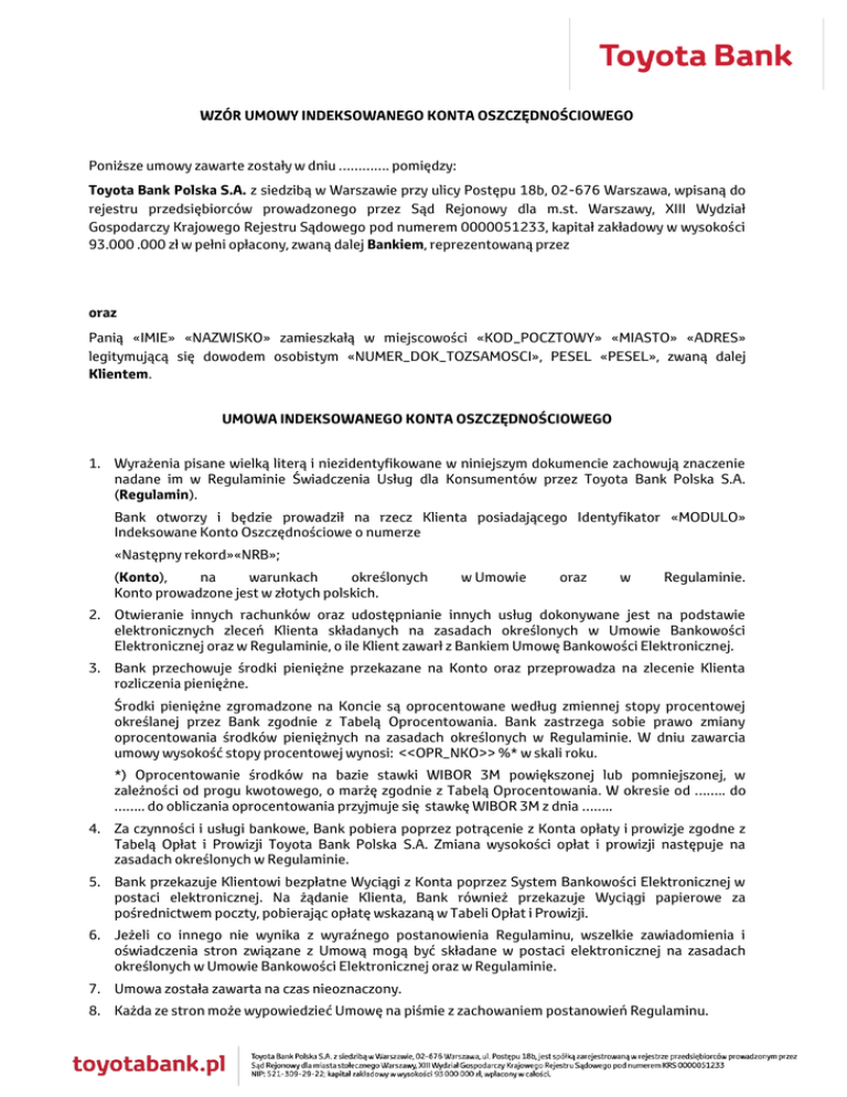 WZÓR UMOWY INDEKSOWANEGO KONTA OSZCZĘDNOŚCIOWEGO Poniższe umowy zawarte zostały w dniu …………. pomiędzy: Toyota Bank Polska S.A. z siedzibą w Warszawie przy ulicy Postępu 18b, 02-676 Warszawa, wpisaną do rejestru przedsiębiorców prowadzonego przez Sąd Rejonowy dla m.st. Warszawy, XIII Wydział Gospodarczy Krajowego Rejestru Sądowego pod numerem 0000051233, kapitał zakładowy w wysokości 93.000 .000 zł w pełni opłacony, zwaną dalej Bankiem, reprezentowaną przez oraz Panią «IMIE» «NAZWISKO» zamieszkałą w miejscowości «KOD_POCZTOWY» «MIASTO» «ADRES» legitymującą się dowodem osobistym «NUMER_DOK_TOZSAMOSCI», PESEL «PESEL», zwaną dalej Klientem. UMOWA INDEKSOWANEGO KONTA OSZCZĘDNOŚCIOWEGO 1. Wyrażenia pisane wielką literą i niezidentyfikowane w niniejszym dokumencie zachowują znaczenie nadane im w Regulaminie Świadczenia Usług dla Konsumentów przez Toyota Bank Polska S.A. (Regulamin). Bank otworzy i będzie prowadził na rzecz Klienta posiadającego Identyfikator «MODULO» Indeksowane Konto Oszczędnościowe o numerze «Następny rekord»«NRB»; (Konto), na warunkach określonych Konto prowadzone jest w złotych polskich. w Umowie oraz w Regulaminie. 2. Otwieranie innych rachunków oraz udostępnianie innych usług dokonywane jest na podstawie elektronicznych zleceń Klienta składanych na zasadach określonych w Umowie Bankowości Elektronicznej oraz w Regulaminie, o ile Klient zawarł z Bankiem Umowę Bankowości Elektronicznej. 3. Bank przechowuje środki pieniężne przekazane na Konto oraz przeprowadza na zlecenie Klienta rozliczenia pieniężne. Środki pieniężne zgromadzone na Koncie są oprocentowane według zmiennej stopy procentowej określanej przez Bank zgodnie z Tabelą Oprocentowania. Bank zastrzega sobie prawo zmiany oprocentowania środków pieniężnych na zasadach określonych w Regulaminie. W dniu zawarcia umowy wysokość stopy procentowej wynosi: <<OPR_NKO>> %* w skali roku. *) Oprocentowanie środków na bazie stawki WIBOR 3M powiększonej lub pomniejszonej, w zależności od progu kwotowego, o marżę zgodnie z Tabelą Oprocentowania. W okresie od …….. do …….. do obliczania oprocentowania przyjmuje się stawkę WIBOR 3M z dnia …….. 4. Za czynności i usługi bankowe, Bank pobiera poprzez potrącenie z Konta opłaty i prowizje zgodne z Tabelą Opłat i Prowizji Toyota Bank Polska S.A. Zmiana wysokości opłat i prowizji następuje na zasadach określonych w Regulaminie. 5. Bank przekazuje Klientowi bezpłatne Wyciągi z Konta poprzez System Bankowości Elektronicznej w postaci elektronicznej. Na żądanie Klienta, Bank również przekazuje Wyciągi papierowe za pośrednictwem poczty, pobierając opłatę wskazaną w Tabeli Opłat i Prowizji. 6. Jeżeli co innego nie wynika z wyraźnego postanowienia Regulaminu, wszelkie zawiadomienia i oświadczenia stron związane z Umową mogą być składane w postaci elektronicznej na zasadach określonych w Umowie Bankowości Elektronicznej oraz w Regulaminie. 7. Umowa została zawarta na czas nieoznaczony. 8. Każda ze stron może wypowiedzieć Umowę na piśmie z zachowaniem postanowień Regulaminu. 9. Od niniejszej umowy Klient może odstąpić bez podania przyczyn składając stosowne oświadczenie na piśmie w terminie czternastu dni od dnia jej zawarcia. Do zachowania tego terminu wystarczy wysłanie oświadczenia przed jego upływem na adres Banku. Klient wyraża jednakże zgodę by Bank rozpoczął świadczenie usług przed upływem powyższego terminu. Wzór oświadczenia o odstąpieniu stanowi załącznik do niniejszej Umowy oraz znajduje się na stronie www.toyotabank.pl. 10. Klient potwierdza otrzymanie Regulaminu, Tabeli Opłat i Prowizji oraz Tabeli Oprocentowania. Dokumenty te są ponadto dostępne na www.toyotabank.pl. 11. Organem właściwym w sprawach ochrony konsumentów jest Prezes Urzędu Ochrony Konkurencji i Konsumentów. Organem sprawującym nadzór nad Bankiem jest Komisja Nadzoru Finansowego. 12. Klient może zgłosić reklamację dotyczącą produktów i usług świadczonych przez Bank. Reklamacja powinna zawierać dokładny opis reklamowanej nieprawidłowości i może zostać złożona: a) na piśmie - w siedzibie Banku lub za pośrednictwem poczty, b) ustnie - telefonicznie lub osobiście w siedzibie Banku, c) elektronicznie za pośrednictwem poczty elektronicznej lub internetowego kanału dostępu Systemu Bankowości Elektronicznej. Reklamacja powinna zostać wniesiona niezwłocznie po powzięciu przez Klienta zastrzeżeń. Późniejsze złożenie reklamacji może skutkować przedłużeniem okresu jej rozpatrywania, w szczególności z uwagi na konieczność uzyskiwania danych archiwalnych. Bank ma prawo żądać dodatkowych informacji, które uzna za niezbędne do rozpatrzenia reklamacji. Bank rozpatrzy reklamację w terminie 30 dni od jej otrzymania oraz poinformuje Klienta na piśmie, za pośrednictwem poczty elektronicznej lub poprzez System Bankowości Elektronicznej o swoim rozstrzygnięciu. Odpowiedź na reklamację za pośrednictwem poczty elektronicznej Bank wyśle wyłącznie na wniosek Klienta. W szczególnie skomplikowanych przypadkach uniemożliwiających rozpatrzenie reklamacji i udzielenie odpowiedzi termin 30 dni może zostać przedłużony, o czym Bank uprzednio poinformuje Klienta. Ogólne zasady przyjmowania i rozpatrywania reklamacji dostępne są na stronie internetowej www.toyotabank.pl. 13. W przypadku gdy w następstwie reklamacji złożonej przez Klienta spór nie został rozwiązany, oprócz postępowania sądowego, Klient może skorzystać z następujących postępowań w sprawie pozasądowego rozstrzygania sporów konsumenckich: a) Bankowego Arbitrażu Konsumenckiego, który działa przy Związku Banków Polskich zgodnie z Regulaminem Bankowego Arbitrażu Konsumenckiego dostępnym na stronie internetowej http://zbp.pl. Do wniosku o wszczęcie postępowania przed Arbitrem Bankowym należy dołączyć doku