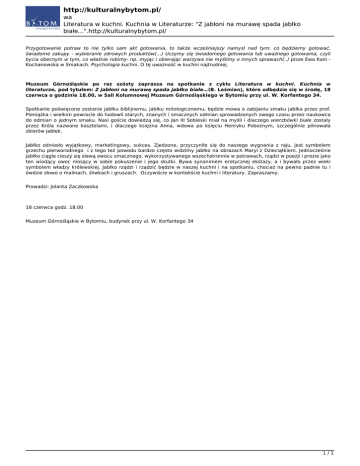 http://kulturalnybytom.pl/ wa Literatura w kuchni. Kuchnia w Literaturze: "Z jabłoni na murawę spada jabłko białe...".http://kulturalnybytom.pl/ Przygotowanie potraw to nie tylko sam akt gotowania, to także wcześniejszy namysł nad tym: co będziemy gotować, świadome zakupy - wybieranie zdrowych produktów(…) Uczymy się świadomego gotowania lub uważnego gotowania, czyli bycia obecnym w tym, co właśnie robimy- np. myjąc i obierając warzywa nie myślimy o innych sprawach(..) pisze Ewa Kain Kochanowska w Smakach. Psychologia kuchni. O tę uważność w kuchni najtrudniej. Muzeum Górnośląskie po raz szósty zaprasza na spotkanie z cyklu Literatura w kuchni. Kuchnia w literaturze, pod tytułem: Z jabłoni na murawę spada jabłko białe…(B. Leśmian), które odbędzie się w środę, 18 czerwca o godzinie 18.00, w Sali Kolumnowej Muzeum Górnośląskiego w Bytomiu przy ul. W. Korfantego 34. Spotkanie poświęcone zostanie jabłku biblijnemu, jabłku mitologicznemu, będzie mowa o zabijaniu smaku jabłka przez prof. Pieniążka i wielkim powrocie do hodowli starych, znanych i smacznych odmian sprowadzonych swego czasu przez naukowca do odmian o jednym smaku. Nasi goście dowiedzą się, co Jan III Sobieski miał na myśli i dlaczego wierzbówki białe zostały przez Króla nazwane kosztelami, i dlaczego księżna Anna, wdowa po księciu Henryku Pobożnym, szczególnie pilnowała zbiorów jabłek. Jabłko odniosło wyjątkowy, marketingowy, sukces. Zjedzone, przyczyniło się do naszego wygnania z raju, jest symbolem grzechu pierworodnego i z tego też powodu bardzo często widzimy jabłko na obrazach Maryi z Dzieciątkiem. Jednocześnie jabłko ciągle cieszy się sławą owocu smacznego, wykorzystywanego wszechstronnie w potrawach, rządzi w poezji i prozie jako ten wiodący owoc niosący w sobie pokuszenie i jego skutki. Bywa synonimem erotycznej ekstazy, a i bywało przez wieki symbolem władzy królewskiej. Jabłko rządzi i rządzić będzie w naszej kuchni i na spotkaniu, chociaż na pewno padnie tu i ówdzie słowo o malinach, śliwkach i gruszach. Oczywiście w kontekście kuchni i literatury. Zapraszamy. Prowadzi: Jolanta Zaczkowska 18 czerwca godz. 18.00 Muzeum Górnośląskie w Bytomiu, budynek przy ul. W. Korfantego 34 1/1 Powered by TCPDF (www.tcpdf.org)