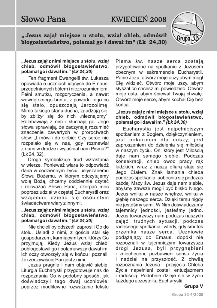 KWIECIEN 2008 Jezus zajął miejsce u stołu, wziął chleb, odmówił błogosławieństwo, połamał go i dawał im” (Łk 24,30) „Jezus zajął z nimi miejsce u stołu, wziął chleb, odmówił błogosławieństwo, połamał go i dawał im.” (Łk 24,30) Ten fragment Ewangelii św. Łukasza opowiada o uczniach idących do Emaus, przepełnionych bólem i niezrozumieniem. Pełni smutku, rozgoryczenia, a nawet wewnętrznego buntu, z powodu tego co się stało, opuszczają Jerozolimę. Mimo takiego stanu ducha, zgadzają się, by zbliżył się do nich „nieznajomy”. Rozmawiają z nim i słuchają go. Jego słowa sprawiają, że zaczynają rozumieć znaczenie zawartych w proroctwach słów: I mówili do siebie: Czy serce nie ” rozpalało się w nas, gdy rozmawiał z nami w drodze i wyjaśniał nam Pisma?” (Łk 24, 32). Droga symbolizuje trud wzrastania w wierze. Ponieważ wiara to odpowiedź dana w codziennym życiu, usłyszanemu Słowu Bożemu, w którym odczytujemy wolę Bożą, chcemy codziennie czytać i rozważać Słowo Pana, czerpać moc poprzez udział w częstej Eucharystii oraz wzajemne dzielić się osobistym świadectwem wiary z innymi. „Jezus zajął z nimi miejsce u stołu, wziął chleb, odmówił błogosławieństwo, połamał go i dawał im.” (Łk 24,30) Nie chcieli by odszedł, zaprosili Go do stołu. Usiadł z nimi, z gościa stał się gospodarzem, karmiącym tych, którzy Go przyjmują. Kiedy Jezus wziął chleb, pobłogosławił go i połamawszy dawał im, ich oczy otworzyły się w końcu i poznali, że rzeczywiście Pan jest z nimi. Jezus pragnie i nam objawić siebie. Liturgia Eucharystii przygotowuje nas do rozpoznania Go w podobny sposób, jak doświadczyli tego dwaj uczniowie: poprzez modlitewne rozważanie tekstu Pisma św. nasze serca zostają przygotowane na spotkanie z Jezusem obecnym w sakramencie Eucharystii. Panie Jezu, otwórz moje oczy,abym mógł Cię widzieć. Otwórz moje uszy, abym słyszał co chcesz mi powiedzieć. Otwórz moje usta, abym śpiewał Twoją chwałę. Otwórz moje serce, abym kochał Cię bez końca. „Jezus zajął z nimi miejsce u stołu, wziął chleb, odmówił błogosławieństwo, połamał go i dawał im.” (Łk 24,30) Eucharystia jest najpełniejszym spotkaniem z Bogiem, dziękczynieniem, j e s t p o k a r m e m d l a d u s z y, j e s t zaproszeniem do dzielenia się miłością w naszym życiu. On, który jest Miłością daje nam samego siebie. Podczas konsekracji, chleb owoc pracy rąk ludzkich, wraz z naszą ofiarą staje się Jego Ciałem. Znak łamania chleba podczas spotkania, uobecnia się podczas każdej Mszy św. Jezus daje nam siebie, abyśmy zawsze mogli być blisko Niego. Jezus wnika w nasze wnętrze, wnika w głębię naszego serca. Dzięki temu nigdy nie jesteśmy sami. W Nim doświadczamy tajemnicy jedności, jesteśmy jedno. Jezus towarzyszy nam podczas naszych zajęć, trudnych sytuacji, podczas radosnego spotkania i wtedy, gdy smutek przenika nasze serca. Uczniowie podążający do Emaus, dopóki nie rozpoznali w tajemniczym towarzyszu drogi Jezusa, byli przygnębieni i zniechęceni, pozbawieni sensu życia i nadziei na przyszłość. Z chwilą rozpoznania Jezusa i przyjęcia Chleba Życia napełnieni zostali entuzjazmem i radością. Podobnie dzieje się w życiu każdego uczestnika Eucharystii. Grupa V Grupa 33 4/2008 Jezus zajął miejsce u stołu, wziął chleb, odmówił błogosławieństwo, połamał go i dawał im” (Łk 24,30) Świadectwo …Proszę Cię, Panie Jezu, o łaskę ” skupienia, by myśli moje były przy Tobie, by oczy moje były zwrócone na ołtarz, a serce moje oddane tylko Tobie”. (modlitwa ministranta przed służbą) Czym dla mnie jest Eucharystia? Jest pokarmem mojego serca. A co daje mi Eucharystia? Daje siłę, moc i odwagę, by nie stać bezczynnie, jeśli ktoś potrzebuje pomocy. By być blisko Jezusa, nawet wtedy, gdy inni śmieją się z mojej postawy. W jaki sposób Eucharystia wpływa na moje życie? Zmienia moje serce, a owocem jej jest dawanie przykładu innym - w pracy, na ulicy, w domu - jak można żyć Słowem Boga. Jestem świadom tego, że to sam Pan Jezus zaprasza mnie na ucztę. On mi się daje cały i ja chcę oddać Mu swoją wolę, swój czas, swoje życie Chcę żyć dla Niego, Jemu służyć. Dzięki temu moje życie ma sens i nawet w pochmurne dni potrafię się uśmiechać. Eucharystia nie zawsze była dla mnie najważniejsza. Jak pracowałem na budowie nie miałem kontaktu z Panem Bogiem. Ważniejsi byli koledzy niż On. A Eucharystia była tylko w niedzielę, i to raczej z przyzwyczajenia. Kiedy zmieniłem pracę nie było już kolegów. Miałem więcej czasu, może nawet zbyt wiele. Zacząłem czegoś szukać, co by KWIECIEN 2008 mi pomogło zmienić moje życie na radośniejsze i szczęśliwsze. Zacząłem częściej chodzić na Eucharystię. Spotkałem Jezusa! To było najważniejsze. Wcześniej aż tak osobiście Go nie znałem, przechodziłem obok Niego, żyłem bez głębszej relacji z Nim, bez prawdziwej miłości. Teraz jest inaczej, codziennie uczestniczę we Mszy św., chcę żyć Jego wolą, Jego Słowem i choć nie zawsze czuję Jego obecność, to wierzę że zawsze jest ze mną, przecież to obiecał: będę z wami aż do końca świata. Kiedyś marzyłem by być ministrantem. Teraz dzięki duszpasterstwu osób żyjących w stanie wolnym mogę służyć przy ołtarzu i to nie sam, ale razem z moimi kolegami, którzy podobnie jak ja uznali w Jezusie swojego Pana i Zbawiciela. Każda służba przy ołtarzu pozwala mi być blisko Pana Jezusa i mieć zawsze oczy zwrócone na Niego, a serce oddane tylko Jemu. Staram się potem żyć podobnie przez cały dzień, aby w każdym napotkanym człowieku służyć Jezusowi: Boże, ” którego dobroć powołała mnie do Twej służby, spraw, bym uświęcony uczestnictwem w Twych tajemnicach przez dzień dzisiejszy i całe me życie szedł tylko drogą zbawienia. Przez Chrystusa Pana 