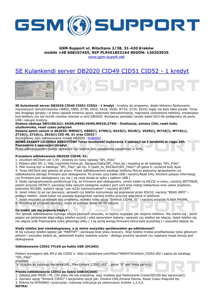 GSM-Support ul. Bitschana 2/38, 31-420 Kraków mobile +48 608107455, NIP PL9451852164 REGON: 120203925 www.gsm-suport.net SE Kulankendi server DB2020 CID49 CID51 CID52 - 1 kredyt SE Kulankendi server DB2020 CID49 CID51 CID52 - 1 kredyt - kredyty do programu, dzięki któremu flashowanie najnowszych SonyEricssonów (W850, K800, K790, K610, K618, V630, W710, Z710, Z610) nigdy nie było takie proste. Teraz bez drogiego sprzętu i w łatwy sposób zmienisz język, wykonasz dekustomizacje, naprawisz uszkodzone telefony, zresetujesz kod telefonu czy też licznik rozmów również w serii DB2020. Wystarczy posiadać zwykły kabel DCU-60 podłączany do portu USB i zakupić kredyty. Dodana obsługa DB3150(A2): K630i,K850i,V640i,W910i,Z750i - finalizacja, zmiana CDA, reset kodu użytkownika, reset czasu połączeń Dodano patch unlock w db2020: W850(i), K800(i), K790(i), K610(i), K618(i), V630(i), W710(i), W710(c), Z710(i), Z710(c), Z610(i) CID 49, 51 oraz CID52 ! Szczegółowy opis odblokowania modeli DB2020 - POBIERZ NOWE ZASADY LICZENIA KREDYTÓW! Teraz możliwość wykonania 3 operacji na 1 telefonie w ciągu 24h. Poprzednio 1 operacja=1kredyt. Przed odblokowaniem należy sprawdzić czy bateria jest naładowana conajmniej w 50%. Procedura odblokowania DB2020 CID49, 51: 1. Uruchom KKClient ver 1,54 , stworzy on nowy katalog "SFL_Files" 2. Pobierz pliki SFL z: http://gsminfo.home.pl/_ftp/guar/Data/SFL_Files.zip i wypakuj je do katalogu "SFL_Files" 3. Pliki muszą być w katalogu "SFL_Files" jak np: X:\path_to_KKClient\SFL_Files\*.sfl gdzie X: oznacza twój dysk 4. Teraz KKClient jest gotowy do pracy. Przed odblokowaniem każdego telefonu Mocno polecamy sprawdzenie czy odblokowanie danego firmware jest obsługiwane. Po prostu użyj kabla USB i naciśnij Read Info, KKclient pokaże informację czy firmware jest obsługiwany czy nie ( na razie działa to tylko z kablem USB ) 5. Kiedy oprogramowanie poinformuje Cię, że firmware jest obsługiwany, zmień kabel na RS232 w menu, naciśnij SETTINGS, potem przycisk DETECT, poczekaj kilka sekund następnie wybierz port com oraz rodzaj kabla/boxa oraz ustaw prędkośc, polecamy 921600, wybierz opcję "use rs232 communication" i naciśnij ACCEPT. 6. Jeżeli robisz to po raz pierwszy, sprawdź czy telefon komunikuje się poprawnie przez RS232, naciśnij "READ INFO" i podłącz telefon. Jeżeli kabel nie posiada AutoIgnition naciśnij krótko przycisk włączania w telefonie. 7. Jeżeli wszystko przebiegło bez problemu, wybierz tylko opcję "Simlock CID49, 51" i naciśnij przycisk FLASH PHONE. 8. Poczekaj aż program skończy, może to potrwać około 46-50 sekund. Co zrobić jak się pojawią błędy? Ten sposób odblokowania wymaga użycia pewnych sztuczek, co będzie wyglądac jak ubijanie telefonu. Nie martw się - jeżeli pojawi sie jakikolwiek błąd odłącz telefon wyjmij i włóż spowrotem baterię i sprawdz czy telefon sie włącza. Jeżeli telefon się nie włącza zrób Flashowanie tylko głównego pliku ( z tą samą wersją firmware która była wcześniej ) i wszystko będzie ok. Kiedy telefon jest nieobsługiwany, a ja mimo wszystko spróbowałem go odblokować? W tej sytuacji telefon będzie jak "MARTWY", ponieważ brak pliku recovery. Więc telefon trzeba przeflashowac tylko głównym plikiem i wszystko bedzie ok, jakkolwiek kredyt zostanie zużyty - dlatego prosimy sprawdź czy napewno twoja wersja jest obsługiwana. Odblokowanie CID52 TYLKO po kablu USB (DCU60) Pobierz wymagany plik SFL2 dla CID52 z: http://rapidshare.com/files/74605479/Unlock_CID52.sfl2 i zapisz do katalogu "SFL_Files" przykład: "x:\ścieżka do katalogu kkclienta\SFL_Files\Unlock_CID52.sfl2" , gdzie "X" jest literą partycji. Proces odblokowania CID52 po kablu USB(DCU60) 1. Załaduj pliki MAIN i FS, CID pliku nie ma znaczenia, więc możliwe jest flashowanie CrossCID(CID bez ograniczeń). 2. Zaznacz opcję "Simlock CID52" i opcjonalne opcje jak: Zmiana CDA,Zmiana Pasma, Reset Czasu Połączeń itp. 3. Kliknia na WYKONAJ i przeczytaj i wykonaj instrukcje po zakonczeniu kroków 1,2,3,4. NOTKA: Proszę pamiętać,że metoda Simlock z CID52 wymaga zapisu MAIN + FS więc cała wszystkie informacje użytkownika będą wymazane z telefonu! Platorma 3150(A2): Fleszowanie/zmiana języka/Czyszczenie kodu użytkownika/Reset czasu połączeń/Zmiana CDA 1. Pobierz MAIN i FS z żadana paczką językową 2. Załaduj MAIN i FS do bufora KK(kliknij na przycisk otwórz plik dla MAIN i FS) 3. Zaznacz opcje Finalizacja i inne żądane opcje(np. Czyszczenie kodu użytkownik) i kliknij na FLESZUJ TEL.) 4. Na koniec fleszowania uruchomi się proces sprawdzania certyfikatów która może trochę potrwać(do 3 minut), w zależności od modelu telefonu lub flesza. Na tym poziomie proszę NIE WYCIAGAĆ bateri z telefonu! To może uszkodzić trwale telefon. 5. Po zakończeniu KK pokaże całkowity czas użyty dla operacji fleszowania. 6. Odłącz kabel,wyciągnij baterie, włóż baterię i włącz telefon. 7. Poczekaj aż pasek postępu dojdzie do końca(nie przerywaj tej operacji), w większości przypadków pasek postępu może być niewidoczny(tylko niebieski pasek), nie przejmuj się tym i odczekaj 1-2 minuty. 8. Telefon sam się przeładuje(proszę nadal czekać) i włączy się w poprawnie w ciągu kilku sekund. 9. telefon jest gotowy do użycia. Przydatne informacje: Gdy podczas fleszowania platfromy A2 wystąpi jakiś błąd i przerwie flashowanie to telefon NIE będzie uszkodzony(firmware) lub częściowo zaprogramowany. Oznacza to,że proces fleszowania od początku do Weryfikacji Certyfikatów jest BEZPIECZNY i nie powoduje żadnych zmian w telefonie, jednakże NIE zalecamy przerywać procesu fleszowania ponieważ zawsze COŚ może się wydarzyć. Obsługiwane modele dla pozostałych operacji: Platfroma DB3150(A2): K630i,K850i,V640i,W910i,Z750i W850, W850i K550, K550i, K550c K800, K800i K810, K810i K790, K790i K610, K610i K618, K618i V630, V630i W710, W710i, W710c Z710, Z710i, Z7