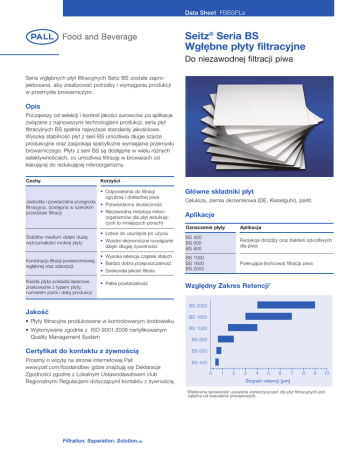 Data Sheet FBBSPLa Seitz® Seria BS Wgłębne płyty filtracyjne Do niezawodnej filtracji piwa Seria wgłębnych płyt filtracyjnych Seitz BS została zaprojektowana, aby zrealizować potrzeby i wymagania produkcji w przemyśle browarniczym. Opis Począwszy od selekcji i kontroli jakości surowców po aplikacje związane z najnowszymi technologiami produkcji, seria płyt filtracyjnych BS spełnia najwyższe standardy jakościowe. Wysoka stabilność płyt z serii BS umożliwia długie szarże produkcyjne oraz zaspokaja specyficzne wymagania przemysłu browarniczego. Płyty z serii BS są dostępne w wielu różnych selektywnościach, co umożliwia filtrację w browarach od klarującej do redukującej mikroorganizmy. Cechy Korzyści • Odpowiednia do filtracji zgrubnej i dokładnej piwa Jednolita i powtarzalna przegroda • Potwierdzona skuteczność filtracyjna, dostępna w szerokim • Niezawodna redukcja mikroprzedziale filtracji organizmów dla płyt redukujących (o mniejszych porach) Główne składniki płyt Celuloza, ziemia okrzemkowa (DE, Kieselguhr), perlit. Aplikacje Oznaczenie płyty Aplikacja BS 400 BS 600 BS 800 Redukcja drożdży oraz bakterii szkodliwych dla piwa • Wysoka retencja cząstek stałych Part Number Description Kombinacja filtracji powierzchniowej, • Bardzo dobra przepuszczalność wgłębnej oraz adsorpcji NX047100 Spare box of 47 mm 0.45 µm Nylon membranes • Doskonała jakość filtratu BS 1000 BS 1600 BS 2000 Polerująca (końcowa) filtracja piwa Każda płyta posiada laserowe znakowanie z typem płyty, numerem partii i datą produkcji Względny Zakres Retencji1 Stabilne medium dzięki dużej wytrzymałości mokrej płyty • Łatwa do usunięcia po użyciu • Wysoko ekonomiczne rozwiązanie dzięki długiej żywotności • Pełna powtarzalność BS 2000 Jakość • Płyty filtracyjne produkowane w kontrolowanym środowisku BS 1600 • Wykonywane zgodnie z ISO 9001:2008 certyfikowanym Quality Management System BS 1000 BS 800 Certyfikat do kontaktu z żywnością BS 600 Prosimy o wizytę na stronie internetowej Pall www.pall.com/foodandbev gdzie znajdują się Deklaracje Zgodności zgodne z Lokalnym Ustawodawstwem i/lub Regionalnymi Regulacjami dotyczącymi kontaktu z żywnością BS 400 0 1 2 3 4 5 6 7 8 9 10 Stopień retencji [µm] 1 Efektywna sprawność usuwania zanieczyszczeń dla płyt filtracyjnych jest zależna od warunków procesowych. Charakterystyka Sterylizacja i Sanityzacja Przepuszczalność dla wody2 L/m2/min (gal/ft2/min) Temperatura ˚C (˚F) Maksymalne Ciśnienie Różnicowe bar/psi Czas4/Cykl % Para wodna 125 (257) 0.5 (7.2) 20 Gorąca woda 90 (194) 1 (14.5) 30 Grubość mm % BS 400 1380 3.9 48 95 (2.3) BS 600 1360 3.9 48 130 (3.2) 4 BS 800 1320 3.9 48 175 (4.3) BS 1000 1300 3.8 48 225 (5.5) BS 1600 1260 3.8 47 305 (7.5) BS 2000 1240 3.8 46 410 (10.0) Typ płyty Zaw. popiołu Metoda Masa na jednostkę pow. g/m2 Powyższe dane zostały określone w zgodności z wewnętrznymi metodami badawczymi oraz metodami Techniczno - Analitycznego Zespołu ds Badań organizacji European Depth Filtration Association. 2 Przepuszczalność płyt była mierzona przy następujących parametrach: czysta woda w 20 °C (68 °F) oraz Δp = 1 bar (14.5 psi). Regeneracja Aby zwiększyć żywotność i zoptymalizować wydajność, płyty filtracyjne BS mogą być odmywane czystą wodą (w kierunku filtracji lub odwrotnym). Optymalna regeneracja płyt filtracyjnych zainstalowanych w filtrze ramowo płytowym może zostać osiągnięta w serii płukań wodą gorącą następujących po płukaniu wodą ciepłą. Przykładowa procedura mycia jest zaprezentowana poniżej. 1. Płukanie wodą ciepłą (60 °C / 140 °F) czas 15 minut 2. Płukanie wodą gorącą (70 – 80 °C / 158 – 176 °F) czas 8 – 10 minut Przepływ wody płuczącej powinien być zbliżony do przepływu podczas filtracji z ciśnieniem różnicowym 0.5 –1 Bar (7.2 –14.5 Psi) Rzeczywisty wymagany czas może się wahać w zależności od warunków procesu. Wytyczne do filtracji 5 Ponieważ, na jakość filtratu może wpływać prędkość przepływu, poniższa tabela podaje wytyczne dla zakresów przepływów. Aplikacja Prędkość przepływu L/m2/h (gal/ft2/h) Maksymalne Ciśnienie Różnicowe bar (psi) Polerująca filtracja piwa 150 (3.7) 1.5 (21.8) Redukcja niskich poziomów mikrobio150 (3.7) logii w piwie (drożdże, bakterie szkodliwe) 1.5 (21.8) Redukcja wysokich poziomów mikrobio100-120 (2.5-3) logii w piwie (drożdże, bakterie szkodliwe) 1.5 (21.8) 5 Prosimy o kontakt z Pall w celu rekomendacji dotyczących specyfiki Państwa procesu filtracyjnego, ponieważ wyniki mogą się zmieniać zależnie od produktu, warunków prefiltracji oraz filtracji. W celu otrzymania dodatkowych wskazówek m.in. zawierających płukanie płyt przed użyciem, proszę odnieść się do instrukcji dostarczanych przez Pall. Dostępne Formaty Płyt 3 Podczas płukania w kierunku odwrotnym, krytycznym zagadnieniem jest kontrola poziomu cząstek oraz mikrobiologii w wodzie płuczącej, tak, aby nie doprowadzić do zanieczyszczenia / zakażenia strony filtratu płyty filtracyjnej. Woda stosowana do mycia wstecznego musi być wolna od zanieczyszczeń mechanicznych i jeśli filtr nie będzie sterylizowany przed użyciem, woda musi być wolna od mikroorganizmów. Płukanie wsteczne winno być przeprowadzone w kierunku stycznym od króćca wylotowego do wlotowego filtra ramowo płytowego. Płyty składane 1003 mm x 2016 mm (39.5" x 79.3") 1205 mm x 2420 mm (47.4" x 95.3") Inne formaty dostępne na życzenie Pall Food and Beverage Odwiedź www.pall.com/foodandbev Pall Poland sp. z o.o. +48 22 510 21 00 telefon [email protected] Pall Corporation posiada biura handlowe oraz zakłady produkcyjne w całym świecie. Aby nawiązać kontakt z przedstawicielem Pall w Państwa rejonie, proszę odwiedzić stronę www.pall.com/contact New York - USA +1 866 905 7255 toll free [email protected] Prosimy skontaktować się z 