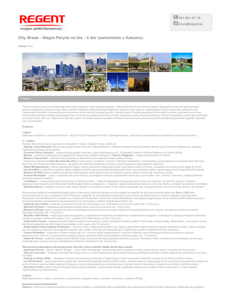 061 851-31-18 [email protected] City Break - Magia Paryża na bis - 4 dni (samolotem z Katowic) Francja Paryż Program Paryż uznawany jest za kwintesencję francuskiej elegancji, która spowija paryżan i daje powód do dumy reszcie narodu. Zapraszamy więc do jego lepszego poznania podczas kolejnej wizyty, która umożliwi Państwu odkrycie pełnych tajemnic malowniczych dzielnic, zapierających dech w piersiach widoków oraz luksusowych butików i nowoczesnych wieżowców, które idealnie komponują się z resztą miasta. Ponadto wyszukana francuska kuchnia, wyśmienite wino oraz różnorodny wachlarz atrakcji znajdujących się na tle zachwycającej panoramy miasta, proponują coraz nowsze przeżycia, których nie sposób w pełni doznać będąc w stolicy Francji tylko raz. Wybierzmy się więc razem na kolejny spacer paryskim uliczkami oraz poczujmy ponownie smak prawdziwej paryskiej bagietki, ratatuille czy creme brulee. Program: 1 dzień: Odprawa na lotnisku i przelot do Paryża – stolicy Francji. Przejazd do hotelu. Zakwaterowanie, czas wolny lub zwiedzanie w zależności od godzin przylotu. 2 - 3 dzień: Kolejne dwa dni to czas na poznanie niezwykłych miejsc i atrakcji miasta, takich jak - Ogrody Luksemburskie, które miały przypominać florenckie Ogrody Boboli z Pałacem będącym dzisiaj siedzibą senatu oraz Fontanną Medyceuszy, będącą największą atrakcją letnią ogrodu - Cmentarz Pere-Lachaise – najsłynniejszy paryski cmentarz, gdzie pochowano m.in. Fryderyka Chopina, Moliera, Balzaca czy Oscara Wilde - Marais – dzielnica uchodząca za najbardziej malowniczy zakątek metropolii z Placem Wogezów – najstarszym placem w mieście - Muzeum Carnavalet – renesansowy budynek ze zbiorami prezentującymi historię stolicy Francji - malownicza dzielnica Saint Germain des Pres z luksusowymi butikami, licznymi urokliwymi sklepikami i kawiarenkami, pozostałościami opactwa Saint Germain des Pres oraz Kościołem Saint Sulpice – drugą co do wielkości świątynią w Paryżu, wyróżniającą się imponującymi organami - Wieża Montparnasse, z której najwyższych pięter można podziwiać zapierający dech w piersiach widok na Paryż, w pogodne dni widzialność sięga aż 40 km - Les Invalides z budynkiem szpitala, gdzie niegdyś mieściło się ponad cztery tysiące pacjentów oraz kościołem, gdzie spoczywają prochy Napoleona Bonaparte - Muzeum Rodina, gdzie znajduje się ponad sześć tysięcy rzeźb wykonanych w terakocie, gipsie, brązie, marmurze, kamieniu, wosku - Avenue Montaigne – jedna z najdroższych ulic w Paryżu ze sklepami znanych projektantów takich jak Louis Vuitton, Dior, Chanel, Valentino, a także jubilerów oraz luksusowymi hotelami - La Defence – nowoczesna dzielnica biznesu z Nowym Łukiem – Arką zamykającym oś biegnącą przez Paryż ze wschodu na zachód, licznymi rzeźbami współczesnych artystów oraz Kościołem Matki Boskiej Zielonoświątkowej – miejscem, gdzie ludzie przychodzą nie tylko się modlić, ale także rozmawiać i rozmyślać - Dzielnica Bercy z rzeźbami znanymi jako „dzieci świata” oraz parkiem, gdzie w XIX wieku znajdowało się międzynarodowe centrum handlu winem i spirytusem W przerwach podczas zwiedzania proponujemy czas wolny, podczas którego można wstąpić na posiłek do słynnej paryskiej restauracji Euro 1728, która wzorowana jest na tych z przełomu XVII/XVIII wieku, znajduje się w dostojnej posiadłości w sercu Faubourg Saint-Honore, w której niegdyś mieszkały takie francuskie znamienitości jak La Fayette czy markiza de Pompadour, a kuchnia z pełną dbałością o szczegóły przygotowuje dania według siedemnastowiecznych przepisów (płatne indywidualnie wg zamówienia) lub skorzystać z atrakcji dodatkowych takich jak: - fundacja Luis Vuitton - osobliwy nowoczesny budynek mieszczący m.in. bibliotekę oraz muzeum sztuki (ok. 16 euro/os.) - Muzeum Picassa z największą państwową kolekcją dzieł malarza na świecie (ok. 13 euro/os.) - Museum d’Orsay, gdzie znajdują się zbiory zawierające głównie sztukę francuską młodszą od tej prezentowanej w Luwrze, ale starszą od zbiorów Centre Georges Pompidou (ok. 15 euro/os.) - Bazylika Saint-Danis - imponująca gotycka bazylika z przepięknym wnętrzem przepełnionym zabytkowymi posągami i sarkofagami, będąca miejscem pochówku niemal wszystkich królów francuskich, m.in. Ludwika XVI i Marii Antoniny (ok. 8 euro/os.) - Katakumby Paryża - ciągnące się kilometrami podziemne korytarze, pełne szczątków ludzkich, gdzie Victor Hugo umieścił akcję „Nędzników”, a w czasie II wojny światowej spotykali się członkowie francuskiego ruchu oporu (ok. 16 euro/os.) - Shakespeare and Company Bookstore – wizyta w małej, magicznej księgarni jak z bajek, gdzie obok najróżniejszych książek znajdziemy piętro, gdzie znajduje się mini czytelnia, pianino oraz wygodne miejsca, aby usiąść i chłonąć atmosferę świątyni czytelnictwa (płatne indywidualnie wg zakupów) - Centre Pompidou – budynek, w którym mieści się m.in. muzeum sztuki współczesnej z dziełami artystów reprezentujących głównie surrealizm, kubizm, ekspresjonizm i fowizm, a nowoczesny wygląd budynku pobudza wyobraźnię każdego zwiedzającego (ok. 14 euro/os.) - Stade de France - podczas wizyty można śledzić trasę, jaką przemierzają najwięksi sportowcy, poczuć atmosferę szatni, przejść tunel prowadzący na murawę, zamknąć oczy i poczuć emocje największych wydarzeń sportowych (ok. 15 euro/os.) Wieczorami proponujemy słynne paryskie rozrywki, które świetnie oddają ducha tego miasta: - Kabarety Paryża – słynne „Moulin Rouge”, „Lido”, które olśniewają i zachwycają, pełne przepychu rewie, piękne stroje, taniec i muzyka (od 70 euro/os.) - Wieczór francuski – tradycyjna kolacja francuska złożona z kilku tradycyjnych dań podawanych przy akompaniamencie muzyki regionalnej (od 45 euro /os.) (min.