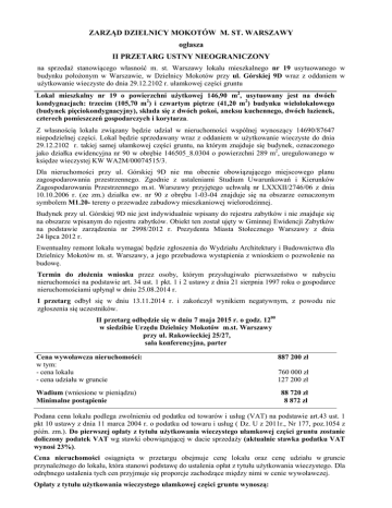 ZARZĄD DZIELNICY MOKOTÓW M. ST. WARSZAWY ogłasza II PRZETARG USTNY NIEOGRANICZONY na sprzedaż stanowiącego własność m. st. Warszawy lokalu mieszkalnego nr 19 usytuowanego w budynku położonym w Warszawie, w Dzielnicy Mokotów przy ul. Górskiej 9D wraz z oddaniem w użytkowanie wieczyste do dnia 29.12.2102 r. ułamkowej części gruntu Lokal mieszkalny nr 19 o powierzchni użytkowej 146,90 m2, usytuowany jest na dwóch kondygnacjach: trzecim (105,70 m2) i czwartym piętrze (41,20 m2) budynku wielolokalowego (budynek pięciokondygnacyjny), składa się z dwóch pokoi, aneksu kuchennego, dwóch łazienek, czterech pomieszczeń gospodarczych i korytarza. Z własnością lokalu związany będzie udział w nieruchomości wspólnej wynoszący 14690/87647 niepodzielnej części. Lokal będzie sprzedawany wraz z oddaniem w użytkowanie wieczyste do dnia 29.12.2102 r. takiej samej ułamkowej części gruntu, na którym znajduje się budynek, oznaczonego jako działka ewidencyjna nr 90 w obrębie 146505_8.0304 o powierzchni 289 m2, uregulowanego w księdze wieczystej KW WA2M/00074515/3. Dla nieruchomości przy ul. Górskiej 9D nie ma obecnie obowiązującego miejscowego planu zagospodarowania przestrzennego. Zgodnie z ustaleniami Studium Uwarunkowań i Kierunków Zagospodarowania Przestrzennego m.st. Warszawy przyjętego uchwałą nr LXXXII/2746/06 z dnia 10.10.2006 r. (ze zm.) działka ew. nr 90 z obrębu 1-03-04 znajduje się na obszarze oznaczonym symbolem M1.20- tereny o przewadze zabudowy mieszkaniowej wielorodzinnej. Budynek przy ul. Górskiej 9D nie jest indywidualnie wpisany do rejestru zabytków i nie znajduje się na obszarze wpisanym do rejestru zabytków. Obiekt ten został ujęty w Gminnej Ewidencji Zabytków na podstawie zarządzenia nr 2998/2012 r. Prezydenta Miasta Stołecznego Warszawy z dnia 24 lipca 2012 r. Ewentualny remont lokalu wymagać będzie zgłoszenia do Wydziału Architektury i Budownictwa dla Dzielnicy Mokotów m. st. Warszawy, a jego przebudowa wystąpienia z wnioskiem o pozwolenie na budowę. Termin do złożenia wniosku przez osoby, którym przysługiwało pierwszeństwo w nabyciu nieruchomości na podstawie art. 34 ust. 1 pkt. 1 i 2 ustawy z dnia 21 sierpnia 1997 roku o gospodarce nieruchomościami upłynął w dniu 25.08.2014 r. I przetarg odbył się w dniu 13.11.2014 r. i zakończył wynikiem negatywnym, z powodu nie zgłoszenia się uczestników. II przetarg odbędzie się w dniu 7 maja 2015 r. o godz. 1200 w siedzibie Urzędu Dzielnicy Mokotów m.st. Warszawy przy ul. Rakowieckiej 25/27, sala konferencyjna, parter Cena wywoławcza nieruchomości: w tym: - cena lokalu - cena udziału w gruncie Wadium (wniesione w pieniądzu) Minimalne postąpienie 887 200 zł 760 000 zł 127 200 zł 88 720 zł 8 872 zł Podana cena lokalu podlega zwolnieniu od podatku od towarów i usług (VAT) na podstawie art.43 ust. 1 pkt 10 ustawy z dnia 11 marca 2004 r. o podatku od towaru i usług ( Dz. U z 2011r., Nr 177, poz.1054 z późn. zm.). Do pierwszej opłaty z tytułu użytkowania wieczystego ułamkowej części gruntu zostanie doliczony podatek VAT wg stawki obowiązującej w dacie sprzedaży (aktualnie stawka podatku VAT wynosi 23%). Cena nieruchomości osiągnięta w przetargu obejmuje cenę lokalu oraz cenę udziału w gruncie przynależnego do lokalu, która stanowi podstawę do ustalenia opłat z tytułu użytkowania wieczystego. Dla odrębnego ustalenia tych cen przyjmuje się proporcje zachodzące między nimi w cenie wywoławczej. Opłaty z tytułu użytkowania wieczystego ułamkowej części gruntu wynoszą: - pierwsza opłata – 25% ceny ułamkowej części gruntu osiągniętej w przetargu powiększona o obowiązującą stawkę podatku VAT - opłaty roczne – 1 % ceny ułamkowej części gruntu osiągniętej w przetargu powiększone o obowiązującą stawkę podatku VAT Opłaty roczne należy wnosić przez cały okres użytkowania wieczystego w terminie do dnia 31 marca każdego roku. Opłaty te mogą być aktualizowane, nie częściej niż raz na trzy lata, jeżeli wartość gruntu ulegnie zmianie. Opłaty z tytułu użytkowania wieczystego gruntu ustalane są zgodnie z przepisami ustawy z dnia 21 sierpnia 1997 r. o gospodarce nieruchomościami (Dz. U. z 2014 r., poz. 518 z późn. zm.). W zakresie obowiązku zapłaty opłat rocznych z tytułu użytkowania wieczystego ułamkowej części gruntu w terminie do dnia 31 marca każdego roku, nabywca nieruchomości zobowiązany będzie poddać się wprost z aktu notarialnego egzekucji w trybie art. 777 § 1 pkt 5 kodeksu postępowania cywilnego. W przetargu mogą brać udział osoby fizyczne i prawne, które zapoznają się z treścią informatora przetargowego, wniosą wadium i złożą zgłoszenie udziału w przetargu (zgłoszenie stanowi załącznik do informatora przetargowego). Wadium winno być wniesione na rachunek Dzielnicy Mokotów m. st. Warszawy nr 96 1030 1508 0000 0005 5002 3067, do dnia 30.04.2015 r. Za datę wniesienia wadium uważa się wpływ wymaganej kwoty na ww. rachunek. Zgłoszenie udziału w przetargu winno być złożone do dnia 30.04.2015 r. do godz. 1500, bezpośrednio w Wydziale Obrotu Nieruchomościami dla Dzielnicy przy ul. Rakowieckiej 25/27, w pokoju nr 309, III piętro. Przystępujący do przetargu obowiązani są do zapoznania się z treścią informatora przetargowego, który można nabyć w Urzędzie Dzielnicy Mokotów m.st. Warszawy przy ul. Rakowieckiej 25/27, w pokoju nr 309, III piętro (od poniedziałku do piątku w godz. 800-1530), po uprzednim wpłaceniu w kasie Urzędu Dzielnicy Mokotów m. st. Warszawy lub na rachunek Dzielnicy Mokotów m.st. Warszawy nr 40 1030 1508 0000 0005 5002 3008 kwoty w wysokości 20,00 zł. Osoba ustalona jako nabywca nieruchomości zobowiązana jest wpłacić nie później niż na 3 dni przed wyznaczonym terminem podpisania umowy ustanowienia odrębnej własności lokalu, jego sprzedaży i oddania w użytkowanie wieczyste ułamkowej części