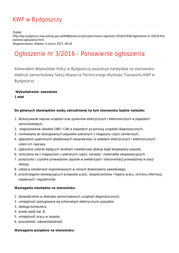 KWP w Bydgoszczy Źródło: http://bip.bydgoszcz.kwp.policja.gov.pl/KWB/praca-w-policji/archiwum-ogloszen-2016/22938,Ogloszenie-nr-32016-Pon owienie-ogloszenia.html Wygenerowano: Sobota, 4 marca 2017, 09:39 Ogłoszenie nr 3/2016 - Ponowienie ogłoszenia Komendant Wojewódzki Policji w Bydgoszczy poszukuje kandydata na stanowisko: elektryk samochodowy Sekcji Wsparcia Technicznego Wydziału Transportu KWP w Bydgoszczy Wykształcenie: zawodowe 1 etat Do głównych obowiązków osoby zatrudnionej na tym stanowisku będzie należało: 1. Wykonywanie napraw urządzeń oraz systemów elektrycznych i elektronicznych w pojazdach samochodowych, 2. diagnozowanie układów OBD i CAN w pojazdach za pomocą urządzeń diagnostycznych, 3. montowanie do obsługiwanych pojazdów pobranych z magazynu części zamiennych, 4. zgłaszanie ujawnionych dodatkowych niesprawności w układach elektrycznych i elektronicznych celem ich naprawy, 5. zgłaszanie usterek będących skutkiem niewłaściwej obsługi bądź eksploatacji pojazdu, 6. rozliczanie się z magazynem z pobranych części, narzędzi i materiałów eksploatacyjnych, 7. przejrzyste i czytelne prowadzenie zapisów w ewidencjach i dokumentacji prowadzonej w stacji obsługi, 8. udział w szkoleniach organizowanych w ramach doskonalenia zawodowego, 9. przestrzeganie obowiązujących przepisów p.poż., bezpieczeństwa i higieny pracy, ochrony informacji niejawnych i regulaminów. Wymagania niezbędne na stanowisku: 1. doświadczenie w obsłudze samochodowych urządzeń diagnostycznych, 2. umiejętność posługiwania się schematami elektrycznymi pojazdów, 3. obsługa komputera, 4. prawo jazdy kat. B, 5. umiejętność pracy w zespole, 6. pracowitość, odpowiedzialność. Wymagania pożądane na stanowisku: 1. wykształcenie średnie – technik, 2. 2 lata stażu pracy na stanowisku elektryka samochodowego, 3. chęć pogłębiania swojej wiedzy i doskonalenia zawodowego. Zainteresowane osoby prosimy o przesłanie życiorysu (CV) i listu motywacyjnego wraz z następującymi dokumentami: kopią dokumentów potwierdzających wykształcenie, kopią dowodu osobistego, kopią prawa jazdy, kopią dokumentów potwierdzających odbycie kursów i szkoleń, oświadczeniem kandydata o nieskazaniu za przestępstwo popełnione umyślnie, oświadczeniem kandydata o korzystaniu z pełni praw publicznych, oświadczeniem kandydata o wyrażeniu zgody na przetwarzanie danych osobowych do celów rekrutacji. Dokumenty należy składać w terminie do 17.06.2016 r. pod adresem: Komenda Wojewódzka Policji w Bydgoszczy Wydział Kadr i Szkolenia ul. Powstańców Wlkp. 7 85 – 090 Bydgoszcz Z dopiskiem „elektryk samochodowy” Koniecznie proszę zaznaczyć w liście motywacyjnym jakiego ogłoszenia dotyczy oferta (stanowisko). Wybrani kandydaci zostaną poinformowani o terminie rozmowy kwalifikacyjnej. Nadesłanych ofert nie odsyłamy. Załączniki do strony Komendant Wojewódzki Policji w Bydgoszczy poszukuje kandydata na stanowisko: elektryk samochodowy Sekcji Wsparcia Technicznego Wydziału Transportu KWP w Bydgoszczy Data publikacji 10.05.2016 15:00 (pdf 198.97 KB) Metryczka Data publikacji 10.05.2016 Data modyfikacji 15.09.2016 Rejestr zmian Podmiot udostępniający informację: Biuletyn Informacji Publicznej Osoba wytwarzająca/odpowiadająca za informację: Ludmiła Lyczmańska specjalista Sekcji Spraw Osobowych i Ewidencji Wydziału Kadr i Szkolenia KWP w Bydgoszczy Osoba udostępniająca informację: Szymon Tworowski Wydział Komunikacji Społecznej KWP w Bydgoszczy Osoba modyfikująca informację: Szymon Tworowski