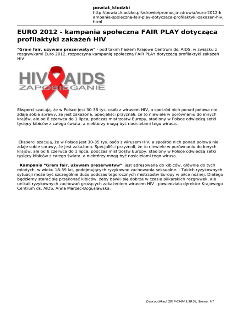 powiat_klodzki http://powiat.klodzko.pl/zdrowie/promocja-zdrowia/euro-2012-k ampania-spoleczna-fair-play-dotyczaca-profilaktyki-zakazen-hiv. html EURO 2012 - kampania społeczna FAIR PLAY dotycząca profilaktyki zakażeń HIV "Gram fair, używam prezerwatyw" - pod takim hasłem Krajowe Centrum ds. AIDS, w związku z rozgrywkami Euro 2012, rozpoczyna kampanię społeczną FAIR PLAY dotyczącą profilaktyki zakażeń HIV Eksperci szacują, że w Polsce jest 30-35 tys. osób z wirusem HIV, a spośród nich ponad połowa nie zdaje sobie sprawy, że jest zakażona. Specjaliści przyznali, że to niewiele w porównaniu do innych krajów, ale od 8 czerwca do 1 lipca, podczas mistrzostw Europy, stadiony w Polsce odwiedzą setki tysięcy kibiców z całego świata, a niektórzy mogą być nosicielami tego wirusa. Eksperci szacują, że w Polsce jest 30-35 tys. osób z wirusem HIV, a spośród nich ponad połowa nie zdaje sobie sprawy, że jest zakażona. Specjaliści przyznali, że to niewiele w porównaniu do innych krajów, ale od 8 czerwca do 1 lipca, podczas mistrzostw Europy, stadiony w Polsce odwiedzą setki tysięcy kibiców z całego świata, a niektórzy mogą być nosicielami tego wirusa. Kampania "Gram fair, używam prezerwatyw" jest adresowana do kibiców, głównie do tych młodych, w wieku 18-39 lat, podejmujących ryzykowne zachowania seksualne. - Takich ryzykownych sytuacji może być szczególnie dużo podczas tegorocznych mistrzostw Europy w piłce nożnej. Dlatego będziemy starać się przekonać kibiców, żeby bawili się dobrze w czasie piłkarskich rozgrywek, ale unikali ryzykownych zachowań grożących zakażeniem wirusem HIV - powiedziała dyrektor Krajowego Centrum ds. AIDS, Anna Marzec-Bogusławska. Data publikacji 2017-03-04 9:39:34, Strona: 1/1