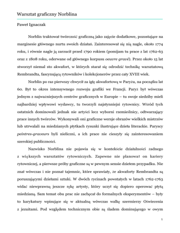 Warsztat graficzny Norblina Paweł Ignaczak Norblin traktował twórczość graficzną jako zajęcie dodatkowe, pozostające na marginesie głównego nurtu swoich działań. Zainteresował się nią nagle, około 1774 roku, i równie nagle ją zarzucił przed 1790 rokiem (pomijam tu prace z lat 1762-63 oraz z 1808 roku, oderwane od głównego korpusu oeuvre gravé). Przez około 15 lat stworzył niemal sto akwafort, w których starał się odrodzić technikę warsztatową Rembrandta, fascynującą rytowników i kolekcjonerów przez cały XVIII wiek. Norblin po raz pierwszy chwycił za igłę akwafortową w Paryżu, na początku lat 60. Był to okres intensywnego rozwoju grafiki we Francji. Paryż był wówczas jednym z najważniejszych centrów graficznych w Europie – tu swoje siedziby mieli najbardziej wpływowi wydawcy, tu tworzyli najsłynniejsi rytownicy. Wśród tych ostatnich dominowali jednak nie artyści lecz wyborni rzemieślnicy, odtwarzający prace innych twórców. Wykonywali oni graficzne wersje obrazów wielkich mistrzów lub utrwalali na miedzianych płytkach rysunki ilustrujące dzieła literackie. Paryscy peintres-graveurs byli nieliczni, a ich prace nie cieszyły się zainteresowaniem szerokiej publiczności. Nazwisko Norblina nie pojawia się w kontekście działalności żadnego z większych warsztatów rytowniczych. Zapewne nie planował on kariery rytowniczej, a pierwsze próby graficzne są w pewnym sensie dziełem przypadku. Nie znał wówczas i nie poznał tajemnic, które sprawiały, że akwaforty Rembrandta są poruszającymi dziełami sztuki. W dwóch rycinach powstałych w latach 1762-1763 widać niewprawną jeszcze rękę artysty, który uczył się dopiero operować płytą miedzianą. Sam temat obu prac nie zachęcał do formalnych eksperymentów – były to karykatury wpisujące się w aktualną wówczas walkę szermierzy Oświecenia z jezuitami. Pod względem technicznym obie są śladem dominującego w owym 1 czasie we Francji przekonania, że akwaforta nie wymaga poważniejszego przygotowania. Teksty teoretyczne sugerowały, że wystarczy nanieść wzór na płytę i poddać ją działaniu kwasu by stworzyć dzieło graficzne. We wczesnych pracach Norblina nie pojawiają się zatem zagadnienia wielokrotnego trawienia, łączenia kilku technik czy eksperymentów podczas drukowania. Dopiero odkrycie przez przyszłego artystę Czartoryskich sztuki Rembrandta uświadomiło mu, że grafika oferuje tak samo niepowtarzalne efekty artystyczne, jak malarstwo. W 1771 roku nabył być może pierwsze dzieło Holendra do własnej kolekcji – portret burmistrza Sixa (B 285). Mistrzowska technika Rembrandta zachęciła Norblina do ponownego podjęcia prób graficznych kilka lat później. Analizując warsztat graficzny Norblina trudno nie zauważyć, że był on w tym względzie samoukiem, podobnie jak Rembrandt. Podstawy akwaforty poznał w warsztacie Caresme’a, ale były to zapewne jedynie rudymenta tej techniki – rysowanie igłą po płytce z werniskem oraz trawienie. Cały wachlarz środków, jakimi zdolny peintre-graveur osiągał efekty światłocieniowe Norblin poznał zapewne sam, łącząc praktyki podpatrzone w paryskich atelier oraz efekty zaobserwowane na rycinach Rembrandta. Z Francji Norblin przejął zwyczaj wstępnego opracowania kompozycji w akwaforcie. W tamtejszych warsztatach tak opracowane płyty uzupełniano miedziorytniczym rylcem, uważano bowiem, że miedzioryt jest najszlachetniejszą techniką, a akwaforta powinna być stosowana jako uzupełnienie dla lepszego oddania charakterystycznych cech niektórych przedmiotów i zjawisk. Rytownik Czartoryskich początkowo przyją ł praktykę wstępnego trawienia w akwaforcie dla odmiennych celów: zarys kompozycji miał nie tyle ułatwić wykończenie pracy rylcem, ile stanowić „podkład” dla technik pozwalających uzyskać malarskie efekty światłocieniowe. Za przykładem Rembrandta, stosował w tym celu przede wszystkim akwafortę oraz suchą igłę. Ponowne trawienia w akwaforcie pozwalały pogrubić wybrane kreski. Sucha igła tworzyła powierzchnie 2 pokryte delikatną, aksamitną a przy tym intensywną czernią. Natomiast rylec i akwatintę Norblin stosował rzadko i w ograniczonym zakresie. Doskonałym przykładem stosowania kilku technik w jednej pracy są pierwsze ryciny z okresu dojrzałego: Aleksander Wielki w pracowni Apellesa oraz Wynalezienie sztuki rysunku obie wykonane około 1773-1775 roku. Te pierwsze próby graficzne zaskakują nie tylko ilością stosowanych technik, ale też stanów (obie prace liczą po osiem stanów). Trudno nie odnieść wrażenia, że Norblin w sposób systematyczny wypróbowywał kolejne techniki i sprawdzał uzyskane efekty wykonując odbitki próbne. Z czasem, gdy opanował już w większym stopniu warsztat rytownika, ograniczał wachlarz stosowanych technik, a jednocześnie zmniejszał ilość stanów. Przykładem tego jest piękna warsztatowo kompozycja Starzec piszący. Opracowany wstępnie zarys kompozycji uzupełnił następnie suchą igłą. W latach siedemdziesiątych powstawały też ryciny bez uprzedniego trawienia, niby szybkie szkice wykonywane bezpośrednio na płycie. Prawdziwy „wysyp” tego typu prac nastąpił w kolejnej dekadzie. Większość z nich to przedstawienia mieszkańców Polski. Opracowywane były w jednym, lub częściej dwóch stanach, gdyż nawet w tych „rytowniczych szkicach” Norblin czuł potrzebę uzupełnienia pracy choćby kilkoma punktami suchej igły. Norblin dość szybko zrozumiał, że eksperymentowanie z technikami pozwala uzyskiwać ciekawe efekty artystyczne. Stąd w jego oeuvre gravé pojawiają się tak rzadkie w owym czasie prace wykonane jedynie w suchej igle, jak również nieśmiałe próby z akwatintą. Oficjalnie odkrycia akwatinty dokonał Jean Baptiste Le Prince w 1769 roku, a lata 70 to okres szybkiego rozwoju tej techniki. Norblin miał szanse poznać jej podstawy jeszcze w Paryżu