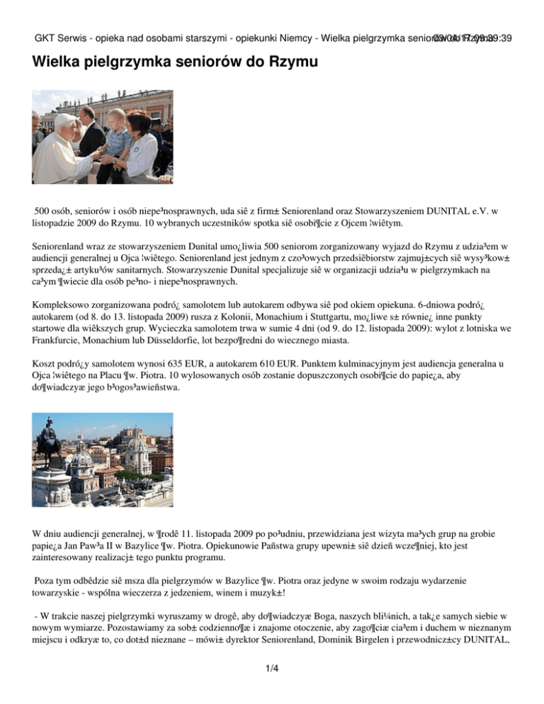 GKT Serwis - opieka nad osobami starszymi - opiekunki Niemcy - Wielka pielgrzymka seniorów 03/04/17 do Rzymu 09:39:39 Wielka pielgrzymka seniorów do Rzymu 500 osób, seniorów i osób niepe³nosprawnych, uda siê z firm± Seniorenland oraz Stowarzyszeniem DUNITAL e.V. w listopadzie 2009 do Rzymu. 10 wybranych uczestników spotka siê osobi¶cie z Ojcem ¦wiêtym. Seniorenland wraz ze stowarzyszeniem Dunital umo¿liwia 500 seniorom zorganizowany wyjazd do Rzymu z udzia³em w audiencji generalnej u Ojca ¦wiêtego. Seniorenland jest jednym z czo³owych przedsiêbiorstw zajmuj±cych siê wysy³kow± sprzeda¿± artyku³ów sanitarnych. Stowarzyszenie Dunital specjalizuje siê w organizacji udzia³u w pielgrzymkach na ca³ym ¶wiecie dla osób pe³no- i niepe³nosprawnych. Kompleksowo zorganizowana podró¿ samolotem lub autokarem odbywa siê pod okiem opiekuna. 6-dniowa podró¿ autokarem (od 8. do 13. listopada 2009) rusza z Kolonii, Monachium i Stuttgartu, mo¿liwe s± równie¿ inne punkty startowe dla wiêkszych grup. Wycieczka samolotem trwa w sumie 4 dni (od 9. do 12. listopada 2009): wylot z lotniska we Frankfurcie, Monachium lub Düsseldorfie, lot bezpo¶redni do wiecznego miasta. Koszt podró¿y samolotem wynosi 635 EUR, a autokarem 610 EUR. Punktem kulminacyjnym jest audiencja generalna u Ojca ¦wiêtego na Placu ¶w. Piotra. 10 wylosowanych osób zostanie dopuszczonych osobi¶cie do papie¿a, aby do¶wiadczyæ jego b³ogos³awieñstwa. W dniu audiencji generalnej, w ¶rodê 11. listopada 2009 po po³udniu, przewidziana jest wizyta ma³ych grup na grobie papie¿a Jan Paw³a II w Bazylice ¶w. Piotra. Opiekunowie Pañstwa grupy upewni± siê dzieñ wcze¶niej, kto jest zainteresowany realizacj± tego punktu programu. Poza tym odbêdzie siê msza dla pielgrzymów w Bazylice ¶w. Piotra oraz jedyne w swoim rodzaju wydarzenie towarzyskie - wspólna wieczerza z jedzeniem, winem i muzyk±! - W trakcie naszej pielgrzymki wyruszamy w drogê, aby do¶wiadczyæ Boga, naszych bli¼nich, a tak¿e samych siebie w nowym wymiarze. Pozostawiamy za sob± codzienno¶æ i znajome otoczenie, aby zago¶ciæ cia³em i duchem w nieznanym miejscu i odkryæ to, co dot±d nieznane – mówi± dyrektor Seniorenland, Dominik Birgelen i przewodnicz±cy DUNITAL, 1/4 GKT Serwis - opieka nad osobami starszymi - opiekunki Niemcy - Wielka pielgrzymka seniorów 03/04/17 do Rzymu 09:39:39 Marco Thoma. – Pielgrzymce towarzyszyæ bêd± lekarze i pielêgniarze, aby wszyscy uczestnicy mogli pewnie i bezstresowo udaæ siê do najpiêkniejszych zabytków Rzymu, takich jak Hiszpañskie Schody, Panteon czy do niepowtarzalnych ko¶cio³ów jak Bazylika ¦w. Piotra czy Bazylika Santa Maria Maggiore. Podró¿ jest równie¿ idealn± okazj± do poznania sympatycznych ludzi o podobnych zapatrywaniach. Program ramowy Podró¿ autokarem (08-13.listopada 2009) Niedziela, 08.11.2009 Odjazd Przejazd do pensjonatu na nocleg (Szwajcaria, pó³. W³ochy) Poniedzia³ek, 09.11.2009 Przyjazd do Rzymu Przejazd do Rzymu Wtorek, 10.11.2009 Historyczne centrum Odkryj najwa¿niejsze zabytki w historycznym centrum miasta: Hiszpañskie schody, Panteon, fontanna di Trevi, Piazza Navona ¦roda, 11.11.2009 Audiencja generalna Udzia³ w audiencji generalnej (o ile Ojciec ¦wiêty jest obecny) Zwiedzanie Bazyliki ¶w. Piotra Czwartek, 12.11.2009 Wyjazd z Rzymu Msza po¿egnalna. Odjazd do pensjonatu na nocleg Pi±tek, 13.11.2009 Podró¿ powrotna Koniec podró¿y Organizator zastrzega sobie prawo do zmian w programie. Cena za osobê w pokoju 2-osobowym 610 EUR (dop³ata za jedynkê 90 EUR) zawiera: - przejazd autokarem - 5 x nocleg - 4 x w³oskie ¶niadanie i obiadokolacja - 1 x w³oski wieczór - 3 x pó³dniowe zwiedzanie miasta Program ramowy Lot samolotem 9.-12. listopada 2009 2/4 GKT Serwis - opieka nad osobami starszymi - opiekunki Niemcy - Wielka pielgrzymka seniorów 03/04/17 do Rzymu 09:39:39 Poniedzia³ek, 09.11.2009 Przyjazd do Rzymu Spotkanie z grup± i opiekunem. Wspólna odprawa lotniskowa i lot do Rzymu. Wtorek, 10.11.2009 Historyczne centrum Odkryj najwa¿niejsze zabytki w historycznym centrum miasta: Hiszpañskie schody, Panteon, fontanna di Trevi, Piazza Navona ¦roda, 11.11.2009 Audiencja generalna Udzia³ w audiencji generalnej (o ile Ojciec ¦wiêty jest dostêpny) Zwiedzanie Bazyliki ¶w. Piotra Czwartek, 12.11.2009 Podró¿ powrotna Wspólna msza i w zale¿no¶ci od godziny odlotu zwiedzanie Santa Maria Maggiore i Bazyliki ¶wiêtych Janów na Lateranie. Lot powrotny. Cena za osobê w pokoju 2-osobowym 635 EUR (dop³ata za jedynkê 85 EUR) zawiera: - przelot samolotem rejsowym Lufthansa z wymienionych lotnisk - podatki i op³aty lotniskowe w wysoko¶ci 97 EUR za osobê - 3 x nocleg - 4 x w³oskie ¶niadanie i obiadokolacja - 1 x w³oski wieczór - Transfer z lotniska w Rzymie - Transfery zawsze rano i wieczorem - 3 x pó³dniowe zwiedzanie miasta Wszelkie informacje, a tak¿e rezerwacja dostêpne s± na www.seniorenland.com oraz www.dunital.eu. Podró¿ w rozumieniu prawa handlowego jest organizowana przez operatora wycieczek Arche Noah Reisen. Kontakt GKT-SERWIS Sp.zo.o. Sp.k. Ul. Jugos³owiañska 3 60-301 Poznañ Telefon kontaktowy Poznañ: 0-61 662 10 81 Info Seniorenland jest jednym z czo³owych przedsiêbiorstw zajmuj±cych siê sprzeda¿± wysy³kow± artyku³ów sanitarnych i dla seniorów. W sklepie internetowym http://www.seniorenland.com znajd± Pañstwo szeroki asortyment markowych wyrobów dla zdrowia i dobrego samopoczucia w przystêpnych cenach, a tak¿e uzyskaj± online poradê. Przedsiêbiorstwo posiada certyfikat ISO, a jego strona internetowa by³a wielokrotnie wyró¿niana. Seniorenland stawia sobie za cel nie tylko sprzeda¿ produktów, lecz tak¿e wspieranie wymiany seniorów z nimi i dla nich. DUNITAL jest organizacj± u¿yteczno¶ci publicznej z siedzib± w Bonn, dzia³aj±c± od 2006. Zgodnie z za³o¿eniami statutowymi wspiera równie¿ cele U.N.I.T.A.L.S.I., najwiêkszej organizacji dobroczynnej we 