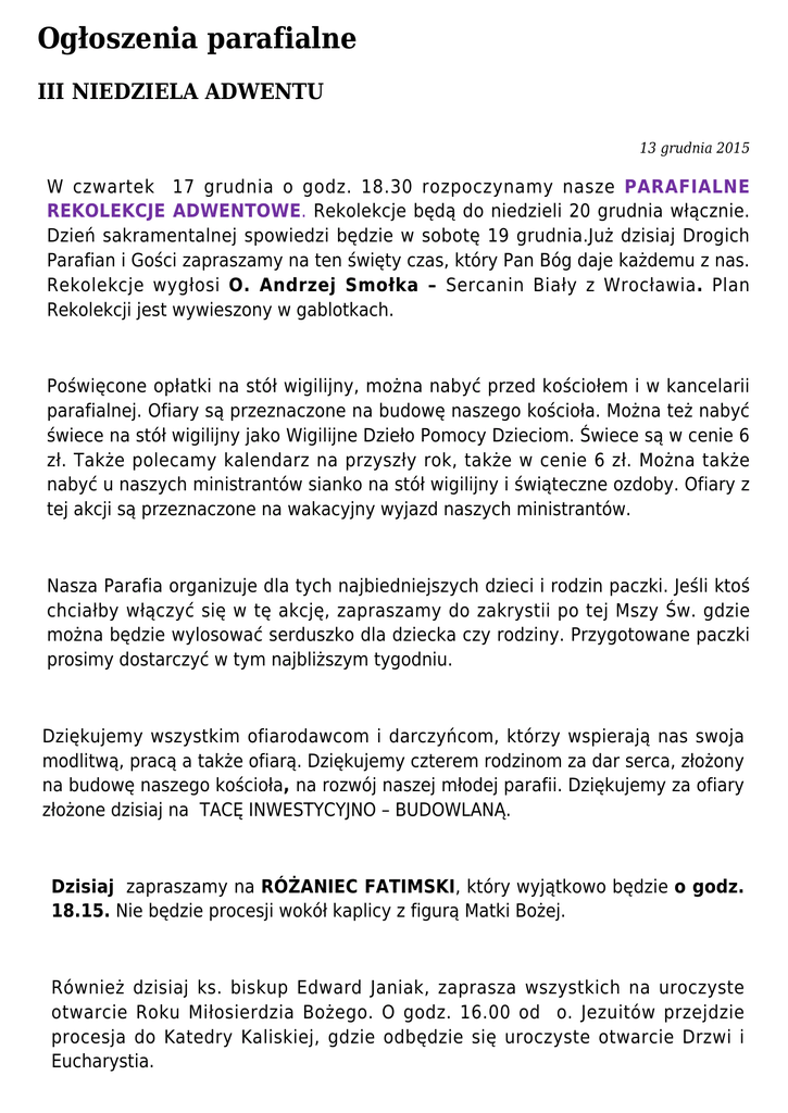 Ogłoszenia parafialne III NIEDZIELA ADWENTU 13 grudnia 2015 W czwartek 17 grudnia o godz. 18.30 rozpoczynamy nasze PARAFIALNE REKOLEKCJE ADWENTOWE. Rekolekcje będą do niedzieli 20 grudnia włącznie. Dzień sakramentalnej spowiedzi będzie w sobotę 19 grudnia.Już dzisiaj Drogich Parafian i Gości zapraszamy na ten święty czas, który Pan Bóg daje każdemu z nas. Rekolekcje wygłosi O. Andrzej Smołka – Sercanin Biały z Wrocławia. Plan Rekolekcji jest wywieszony w gablotkach. Poświęcone opłatki na stół wigilijny, można nabyć przed kościołem i w kancelarii parafialnej. Ofiary są przeznaczone na budowę naszego kościoła. Można też nabyć świece na stół wigilijny jako Wigilijne Dzieło Pomocy Dzieciom. Świece są w cenie 6 zł. Także polecamy kalendarz na przyszły rok, także w cenie 6 zł. Można także nabyć u naszych ministrantów sianko na stół wigilijny i świąteczne ozdoby. Ofiary z tej akcji są przeznaczone na wakacyjny wyjazd naszych ministrantów. Nasza Parafia organizuje dla tych najbiedniejszych dzieci i rodzin paczki. Jeśli ktoś chciałby włączyć się w tę akcję, zapraszamy do zakrystii po tej Mszy Św. gdzie można będzie wylosować serduszko dla dziecka czy rodziny. Przygotowane paczki prosimy dostarczyć w tym najbliższym tygodniu. Dziękujemy wszystkim ofiarodawcom i darczyńcom, którzy wspierają nas swoja modlitwą, pracą a także ofiarą. Dziękujemy czterem rodzinom za dar serca, złożony na budowę naszego kościoła, na rozwój naszej młodej parafii. Dziękujemy za ofiary złożone dzisiaj na TACĘ INWESTYCYJNO – BUDOWLANĄ. Dzisiaj zapraszamy na RÓŻANIEC FATIMSKI, który wyjątkowo będzie o godz. 18.15. Nie będzie procesji wokół kaplicy z figurą Matki Bożej. Również dzisiaj ks. biskup Edward Janiak, zaprasza wszystkich na uroczyste otwarcie Roku Miłosierdzia Bożego. O godz. 16.00 od o. Jezuitów przejdzie procesja do Katedry Kaliskiej, gdzie odbędzie się uroczyste otwarcie Drzwi i Eucharystia. Z naszej wspólnoty Pan Bóg odwołał do wieczności Śp. Kazimierza Prusa z Ul. Hanki Sawickiej 42, który przeżył 76 lat, jego pogrzeb odbył się w sobotę w Stawie Kaliskim. Módlmy się w jego intencji: Wieczny odpoczynek racz mu dać Panie Zapraszamy do czytania prasy katolickiej. Jest jeszcze nowy „Opiekun”, a w nim polecamy artykuł o uproszczonych procedurach stwierdzenia nieważności małżeństwa – czyli o tym co się zmieniło po synodzie biskupów o rodzinie. Polecamy także „Przewodnik Katolicki”, i „Niedziele” w których jest także wiele dobrych artykułów. Wszystkim, którzy w najbliższym tygodniu obchodzą imieniny i urodziny składamy z serca płynące najlepsze życzenia. Pamiętajmy o naszym Ks. Proboszczu Alfredzie, który jutro obchodzi swoje imieniny. Drogim naszym Parafianom, miłym Gościom, życzymy dobrego tygodnia, szczególnie owocnego przeżycia Rekolekcji Adwentowych.