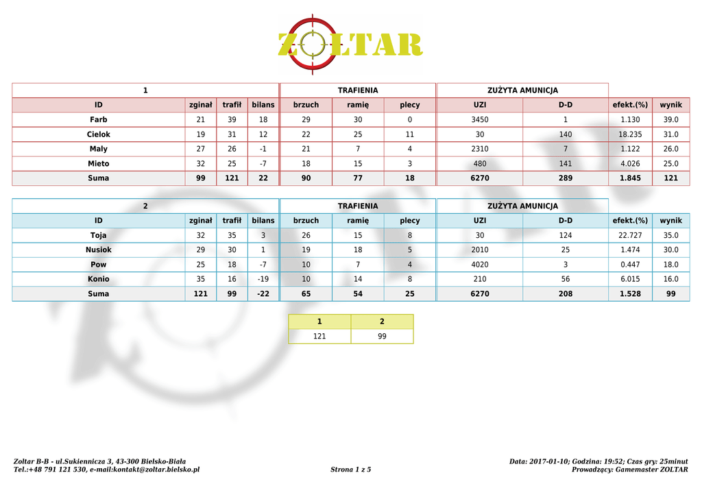 1 TRAFIENIA ZUŻYTA AMUNICJA ID zginał trafił bilans brzuch ramię plecy UZI D-D efekt.(%) wynik Farb 21 39 18 29 30 0 3450 1 1.130 39.0 Cielok 19 31 12 22 25 11 30 140 18.235 31.0 Maly 27 26 -1 21 7 4 2310 7 1.122 26.0 Mieto 32 25 -7 18 15 3 480 141 4.026 25.0 Suma 99 121 22 90 77 18 6270 289 1.845 121 2 TRAFIENIA ZUŻYTA AMUNICJA ID zginał trafił bilans brzuch ramię plecy UZI D-D efekt.(%) wynik Toja 32 35 3 26 15 8 30 124 22.727 35.0 Nusiok 29 30 1 19 18 5 2010 25 1.474 30.0 Pow 25 18 -7 10 7 4 4020 3 0.447 18.0 Konio 35 16 -19 10 14 8 210 56 6.015 16.0 Suma 121 99 -22 65 54 25 6270 208 1.528 99 Zoltar B-B - ul.Sukiennicza 3, 43-300 Bielsko-Biała Tel.:+48 791 121 530, e-mail:[email protected] 1 2 121 99 Strona 1 z 5 Data: 2017-01-10; Godzina: 19:52; Czas gry: 25minut Prowadzący: Gamemaster ZOLTAR 1 TRAFIENIA ZUŻYTA AMUNICJA ID zginał trafił bilans brzuch ramię plecy UZI D-D efekt.(%) wynik Farb 30 79 49 49 58 6 5010 1 1.577 79.0 Cielok 37 47 10 30 41 17 30 191 21.267 47.0 Maly 54 39 -15 26 20 4 4380 10 0.888 39.0 Mieto 43 27 -16 20 21 4 630 185 3.313 27.0 Suma 164 192 28 125 140 31 10050 387 1.840 192 2 TRAFIENIA ZUŻYTA AMUNICJA ID zginał trafił bilans brzuch ramię plecy UZI D-D efekt.(%) wynik Toja 46 52 6 36 30 18 60 156 24.074 52.0 Pow 45 43 -2 31 20 7 6420 0 0.670 43.0 Nusiok 48 37 -11 22 21 11 2250 43 1.614 37.0 Konio 53 32 -21 19 25 10 1800 23 1.755 32.0 Suma 192 164 -28 108 96 46 10530 222 1.525 164 Zoltar B-B - ul.Sukiennicza 3, 43-300 Bielsko-Biała Tel.:+48 791 121 530, e-mail:[email protected] 1 2 192 164 Strona 2 z 5 Data: 2017-01-10; Godzina: 20:23; Czas gry: 25minut Prowadzący: Gamemaster ZOLTAR Drużyny Miejsce Nazwa Zoltar B-B - ul.Sukiennicza 3, 43-300 Bielsko-Biała Tel.:+48 791 121 530, e-mail:[email protected] Rozgrywki 1 2 Suma 1 121 192 313 2 99 263 Strona 3 z 5 164 Data: 2017-01-10 Prowadzący: Gamemaster ZOLTAR Zestawienie wg wyniku Miejsce TRAFIENIA ZUŻYTA AMUNICJA ID zginał trafił bilans brzuch ramię plecy UZI D-D efekt.(%) wynik Farb 61.20 141.60 80.40 93.60 105.60 7.20 10152.00 2.40 1.394 141.60 Toja 93.60 104.40 10.80 74.40 54.00 31.20 108.00 336.00 23.514 104.40 Cielok 67.20 93.60 26.40 62.40 79.20 33.60 72.00 397.20 19.949 93.60 4 Nusiok 92.40 80.40 -12.00 49.20 46.80 19.20 5112.00 81.60 1.548 80.40 5 Maly 97.20 78.00 -19.20 56.40 32.40 9.60 8028.00 20.40 0.969 78.00 6 Pow 84.00 73.20 -10.80 49.20 32.40 13.20 12528.00 3.60 0.584 73.20 7 Mieto 90.00 62.40 -27.60 45.60 43.20 8.40 1332.00 391.20 3.621 62.40 8 Konio 105.60 57.60 -48.00 34.80 46.80 21.60 2412.00 94.80 2.298 57.60 Zestawienie wg bilansu Miejsce TRAFIENIA ZUŻYTA AMUNICJA ID zginał trafił bilans brzuch ramię plecy UZI D-D efekt.(%) wynik Farb 61.20 141.60 80.40 93.60 105.60 7.20 10152.00 2.40 1.394 141.60 Cielok 67.20 93.60 26.40 62.40 79.20 33.60 72.00 397.20 19.949 93.60 Toja 93.60 104.40 10.80 74.40 54.00 31.20 108.00 336.00 23.514 104.40 4 Pow 84.00 73.20 -10.80 49.20 32.40 13.20 12528.00 3.60 0.584 73.20 5 Nusiok 92.40 80.40 -12.00 49.20 46.80 19.20 5112.00 81.60 1.548 80.40 6 Maly 97.20 78.00 -19.20 56.40 32.40 9.60 8028.00 20.40 0.969 78.00 7 Mieto 90.00 62.40 -27.60 45.60 43.20 8.40 1332.00 391.20 3.621 62.40 8 Konio 105.60 57.60 -48.00 34.80 46.80 21.60 2412.00 94.80 2.298 57.60 Zoltar B-B - ul.Sukiennicza 3, 43-300 Bielsko-Biała Tel.:+48 791 121 530, e-mail:[email protected] Strona 4 z 5 Data: 2017-01-10 Prowadzący: Gamemaster ZOLTAR Zestawienie wg efektywności Miejsce TRAFIENIA ZUŻYTA AMUNICJA ID zginał trafił bilans brzuch ramię plecy UZI D-D efekt.(%) wynik Toja 93.60 104.40 10.80 74.40 54.00 31.20 108.00 336.00 23.514 104.40 Cielok 67.20 93.60 26.40 62.40 79.20 33.60 72.00 397.20 19.949 93.60 Mieto 90.00 62.40 -27.60 45.60 43.20 8.40 1332.00 391.20 3.621 62.40 4 Konio 105.60 57.60 -48.00 34.80 46.80 21.60 2412.00 94.80 2.298 57.60 5 Nusiok 92.40 80.40 -12.00 49.20 46.80 19.20 5112.00 81.60 1.548 80.40 6 Farb 61.20 141.60 80.40 93.60 105.60 7.20 10152.00 2.40 1.394 141.60 7 Maly 97.20 78.00 -19.20 56.40 32.40 9.60 8028.00 20.40 0.969 78.00 8 Pow 84.00 73.20 -10.80 49.20 32.40 13.20 12528.00 3.60 0.584 73.20 Zoltar B-B - ul.Sukiennicza 3, 43-300 Bielsko-Biała Tel.:+48 791 121 530, e-mail:[email protected] Strona 5 z 5 Data: 2017-01-10 Prowadzący: Gamemaster ZOLTAR