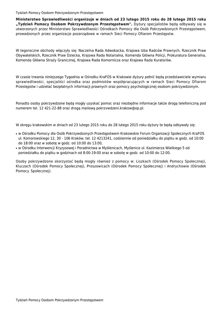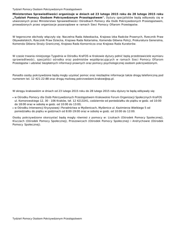 Tydzień Pomocy Osobom Pokrzywdzonym Przestępstwem Ministerstwo Sprawiedliwości organizuje w dniach od 23 lutego 2015 roku do 28 lutego 2015 roku „Tydzień Pomocy Osobom Pokrzywdzonym Przestępstwem". Dyżury specjalistów będą odbywały się w utworzonych przez Ministerstwo Sprawiedliwości Ośrodkach Pomocy dla Osób Pokrzywdzonych Przestępstwem, prowadzonych przez organizacje pozarządowe w ramach Sieci Pomocy Ofiarom Przestępstw. W tegoroczne obchody włączyły się: Naczelna Rada Adwokacka, Krajowa Izba Radców Prawnych, Rzecznik Praw Obywatelskich, Rzecznik Praw Dziecka, Krajowa Rada Notarialna, Komenda Główna Policji, Prokuratura Generalna, Komenda Główna Straży Granicznej, Krajowa Rada Komornicza oraz Krajowa Rada Kuratorów. W czasie trwania niniejszego Tygodnia w Ośrodku KraFOS w Krakowie dyżury pełnić będą przedstawiciele wymiaru sprawiedliwości, specjaliści ośrodka oraz podmiotów współpracujących w ramach Sieci Pomocy Ofiarom Przestępstw i udzielać bezpłatnych informacji prawnych oraz pomocy psychologicznej osobom pokrzywdzonym. Ponadto osoby pokrzywdzone będą mogły uzyskać pomoc oraz niezbędne informacje także drogą telefoniczną pod numerem tel. 12 421-22-88 oraz drogą mailową [email protected]. W okręgu krakowskim w dniach od 23 lutego 2015 roku do 28 lutego 2015 roku dyżury te będą odbywały się: ● ● w Ośrodku Pomocy dla Osób Pokrzywdzonych Przestępstwem Krakowskie Forum Organizacji Społecznych KraFOS ul. Komorowskiego 12, 30 - 106 Kraków, teł. 12 4213241, codziennie od poniedziałku do piątku w godz. od 10:00 do 18:00 oraz w sobotę w godz. od 10:00 do 13:00, w Ośrodku Interwencji Kryzysowej i Poradnictwa w Myślenicach, Myślenice ul. Kazimierza Wielkiego 5 od poniedziałku do piątku w godzinach od 8:00-19:00 oraz w sobotę w godz. od 10:00 do 12:00. Osoby pokrzywdzone skorzystać będą mogły również z pomocy w: Liszkach (Ośrodek Pomocy Społecznej), Kluczach (Ośrodek Pomocy Społecznej), Proszowicach (Ośrodek Pomocy Społecznej) i Andrychowie (Ośrodek Pomocy Społecznej). Tydzień Pomocy Osobom Pokrzywdzonym Przestępstwem