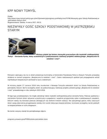 KPP NOWY TOMYŚL Źródło: http://www.nowy-tomysl.policja.gov.pl/w15/prewencja/programy-profilaktyczno/75790,Niezwykly-gosc-Szkoly-Podstawowej-w -Jastrzebsku-Starym.html Wygenerowano: Sobota, 4 marca 2017, 09:31 NIEZWYKŁY GOŚĆ SZKOŁY PODSTAWOWEJ W JASTRZĘBSKU STARYM Miniony piątek był dniem niezwykle pracowitym dla maskotki wielkopolskiej Policji - Sierżanta Pyrka, który uczestniczył w podsumowaniu realizacji projektu edukacyjnego „Bezpiecznie to wiedzieć i znać”. Policjanci zajmujący się na co dzień prewencją kryminalną w Komendzie Powiatowej Policji w Nowym Tomyślu prowadzą działania w ramach programu „Bezpiecznie to wiedzieć i znać”. Celem realizowanych spotkań jest propagowanie wśród najmłodszych bezpiecznych zachowań w życiu codziennym. W miniony piątek 17 czerwca 2016 roku mundurowi z Nowego Tomyśla odwiedzili dzieci ze Szkoły Podstawowej w Jastrzębsku Starym. Był to szczególny dzień, bo podsumowujący realizację projektu prewencyjnego „Bezpiecznie to wiedzieć i znać” prowadzonego w roku szkolnym 2015-2016. W tego typu przedsięwzięciu nie mogło zabraknąć także maskotki wielkopolskiej policji sierżanta Pyrka. Podczas spotkania z sierżantem Pyrkiem dzieci aktywnie uczestniczyły w pogadance i wspólnie przypomniały sobie o podstawowych zasadach, którymi należy się kierować podczas zbliżających się wielkimi krokami wakacji. Dla specjalnego gościa, który zaszczycił dzieci swoją obecnością przygotowane zostały mini scenki dotyczące bezpieczeństwa. Uczniowie szczególny nacisk położyłli na bezpieczeństwo w ruchu drogowym. Na koniec wszyscy stanęli do pamiątkowego zdjęcia. programy prewencyjne/PYREK/szkola jastrzebsko stare Ocena: 0/5 (0) Tweetnij