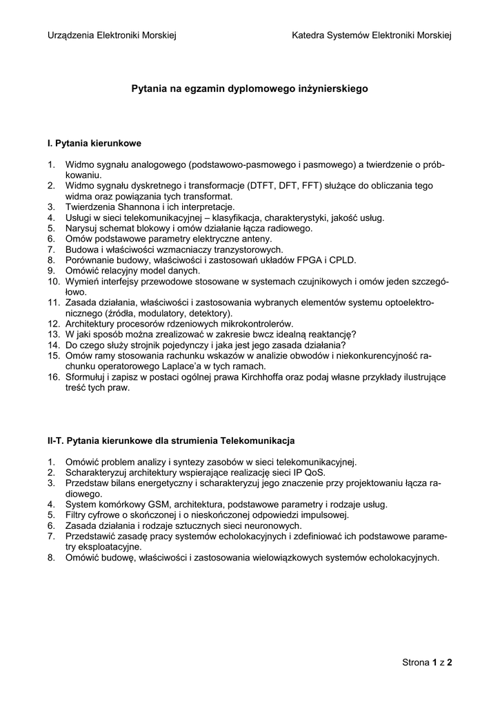 Urządzenia Elektroniki Morskiej Katedra Systemów Elektroniki Morskiej Pytania na egzamin dyplomowego inżynierskiego I. Pytania kierunkowe 1. 2. 3. 4. 5. 6. 7. 8. 9. 10. 11. 12. 13. 14. 15. 16. Widmo sygnału analogowego (podstawowo-pasmowego i pasmowego) a twierdzenie o próbkowaniu. Widmo sygnału dyskretnego i transformacje (DTFT, DFT, FFT) służące do obliczania tego widma oraz powiązania tych transformat. Twierdzenia Shannona i ich interpretacje. Usługi w sieci telekomunikacyjnej – klasyfikacja, charakterystyki, jakość usług. Narysuj schemat blokowy i omów działanie łącza radiowego. Omów podstawowe parametry elektryczne anteny. Budowa i właściwości wzmacniaczy tranzystorowych. Porównanie budowy, właściwości i zastosowań układów FPGA i CPLD. Omówić relacyjny model danych. Wymień interfejsy przewodowe stosowane w systemach czujnikowych i omów jeden szczegółowo. Zasada działania, właściwości i zastosowania wybranych elementów systemu optoelektronicznego (źródła, modulatory, detektory). Architektury procesorów rdzeniowych mikrokontrolerów. W jaki sposób można zrealizować w zakresie bwcz idealną reaktancję? Do czego służy strojnik pojedynczy i jaka jest jego zasada działania? Omów ramy stosowania rachunku wskazów w analizie obwodów i niekonkurencyjność rachunku operatorowego Laplace’a w tych ramach. Sformułuj i zapisz w postaci ogólnej prawa Kirchhoffa oraz podaj własne przykłady ilustrujące treść tych praw. II-T. Pytania kierunkowe dla strumienia Telekomunikacja 1. 2. 3. 4. 5. 6. 7. 8. Omówić problem analizy i syntezy zasobów w sieci telekomunikacyjnej. Scharakteryzuj architektury wspierające realizację sieci IP QoS. Przedstaw bilans energetyczny i scharakteryzuj jego znaczenie przy projektowaniu łącza radiowego. System komórkowy GSM, architektura, podstawowe parametry i rodzaje usług. Filtry cyfrowe o skończonej i o nieskończonej odpowiedzi impulsowej. Zasada działania i rodzaje sztucznych sieci neuronowych. Przedstawić zasadę pracy systemów echolokacyjnych i zdefiniować ich podstawowe parametry eksploatacyjne. Omówić budowę, właściwości i zastosowania wielowiązkowych systemów echolokacyjnych. Strona 1 z 2 Urządzenia Elektroniki Morskiej Katedra Systemów Elektroniki Morskiej III. Pytania dla Profilu Profil: Urządzenia Elektroniki Morskiej 1. 2. 3. 4. 5. 6. 7. 8. 9. 10. Urządzenia elektroniki morskiej stosowane na wyposażeniu mostka kapitańskiego statku. Wyposażenie centrali manewrowo kontrolnej statku. Rodzaje sensorów temperatury i ich własności. Wymienić i scharakteryzować elementy urządzenia wykonawczego. Rodzaje silników elektrycznych prądu stałego i ich charakterystyki. Opisać cechy szczególne wyróżniające procesory sygnałowe. Opisać typy systemów czasu rzeczywistego. Wyjaśnić pojęcie systemu wbudowanego (ang. embedded system). Struktura i zasada działania systemu GPS. Kształt ziemi, systemy odniesienia stosowane w kartografii i systemie GPS. Strona 2 z 2
